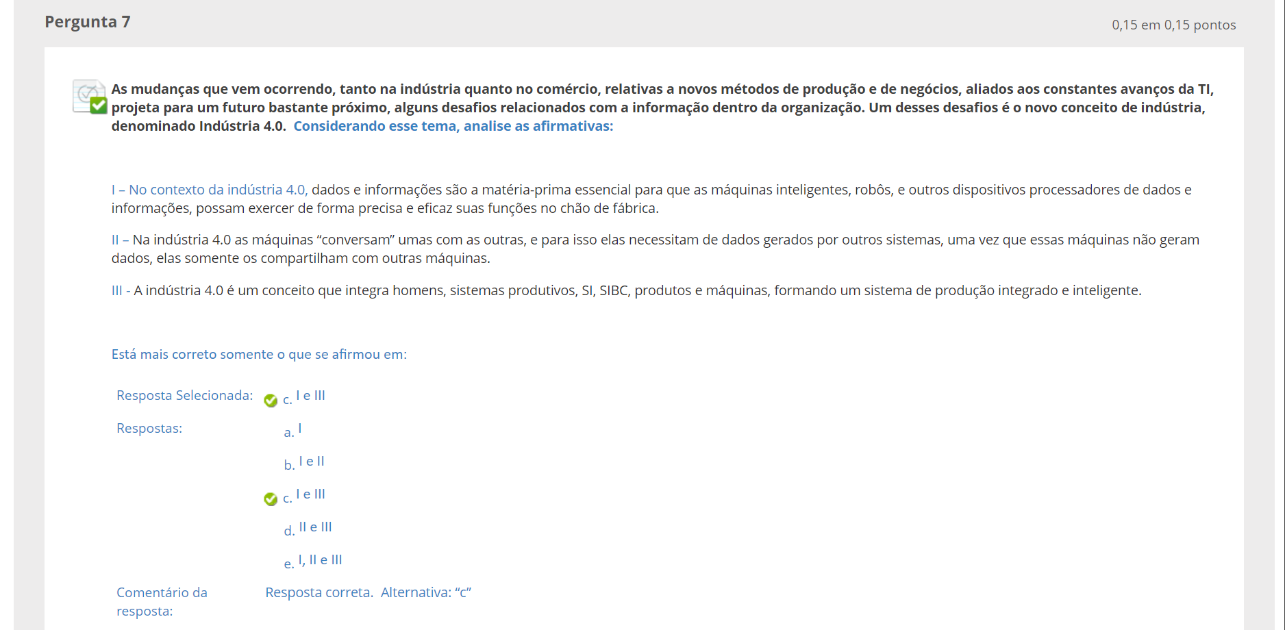 <p>Pergunta 7 0,15 em 0,15 pontos As mudanças que vem ocorrendo, tanto na indústria quanto no comércio, relativas a novos métodos de produção e de negócios, aliados aos constantes avanços da TI, projeta para um futuro bastante próximo, alguns desafios relacionados com a informação dentro da organização. Um desses desafios é o novo conceito de indústria, denominado Indústria 4.0. Considerando esse tema, analise as afirmativas: I - No contexto da indústria 4.0, dados e informações são a matéria-prima essencial para que as máquinas inteligentes, robôs, e outros dispositivos processadores de dados e informações, possam exercer de forma precisa e eficaz suas funções no chão de fábrica. II - - Na indústria 4.0 as máquinas "conversam" umas com as outras, e para isso elas necessitam de dados gerados por outros sistemas, uma vez que essas máquinas não geram dados, elas somente os compartilham com outras máquinas. III - A indústria 4.0 é um conceito que integra homens, sistemas produtivos, SI, SIBC, produtos e máquinas, formando um sistema de produção integrado e inteligente. Está mais correto somente que se afirmou em: Resposta Selecionada: III Respostas: a. b. C. III d. II e III e. I, II e III Comentário da Resposta correta. Alternativa: "C" resposta:</p>