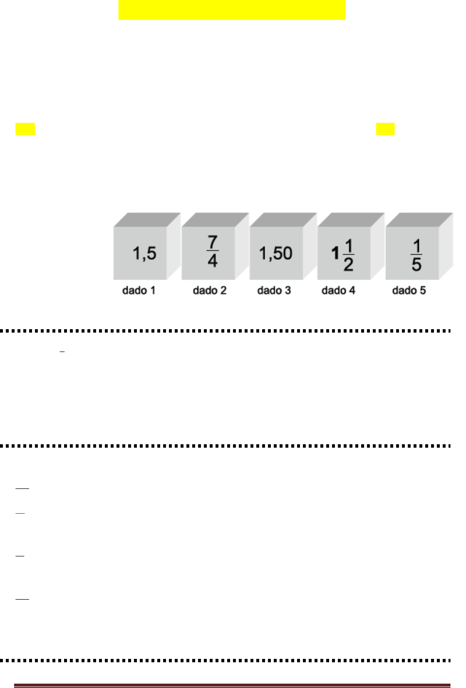 <p>ATIVIDADES 8ªSÉRIE/9ºANO Página 1</p><p>COMPETÊNCIA DE ÁREA 1</p><p>Desenvolver o raciocínio quantitativo e o pensamento funcional, isto é, o pensamento em</p><p>termos de relações e a variedade de suas representações, incluindo as simbólicas, as</p><p>algébricas, as gráficas, as tabulares e as geométricas. Aplicar expressões analíticas para</p><p>modelar e resolver problemas.</p><p>Tema 1 / NÚMEROS, OPERAÇÕES, FUNÇÕES (racionais / potenciação, números reais,</p><p>expressões algébricas, equações, gráficos cartesianos, equações do 2º grau, funções).</p><p>H01 Reconhecer as diferentes representações de um número racional. (GI)</p><p>1) No jogo “Encontrando Números Iguais” são lançados 5 dados especialmente preparados</p><p>para isso.</p><p>Observe esta jogada. Os dados com números iguais são:</p><p>a) 1, 2 e 4.</p><p>b) 1, 3 e 4.</p><p>c) 2, 3 e 5.</p><p>d) 3, 4 e 5.</p><p>Fonte: Matriz de Referência para Avaliação SARESP/2009</p><p>2) Ao pesar</p><p>de quilograma de salame, a balança mostrou:</p><p>a) 0,250 kg.</p><p>b) 0,125 kg.</p><p>c) 0,150 kg.</p><p>d) 0,500 kg.</p><p>Fonte: SARESP 2010</p><p>3) A fração que corresponde ao número 0,56 é:</p><p>a)</p><p>b)</p><p>c)</p><p>d)</p><p>Fonte: SARESP 2011</p><p>ATIVIDADES 8ªSÉRIE/9ºANO Página 2</p><p>4) A fração equivalente a</p><p>é:</p><p>a)</p><p>b)</p><p>c)</p><p>d)</p><p>Fonte: SARESP 2014</p><p>5) Numa pesquisa realizada num condomínio, 35% dos moradores apresentavam-se</p><p>insatisfeitos com a administração do síndico.</p><p>A porcentagem de pessoas insatisfeitas equivale à fração</p><p>a) 1/5</p><p>b) 3/20</p><p>c) 7/20</p><p>d) 1/2</p><p>Fonte: SARESP 2015</p><p>H02 Identificar fração como representação que pode estar associada a diferentes</p><p>significados. (GI)</p><p>1) Observe as situações apresentadas nos quadros seguintes.</p><p>A fração</p><p>pode ser usada para representar as situações:</p><p>a) I, II e III.</p><p>b) II, III e IV.</p><p>c) I, II e IV.</p><p>d) I, III e IV.</p><p>Fonte: Matriz de Referência para Avaliação SARESP/2009</p><p>ATIVIDADES 8ªSÉRIE/9ºANO Página 3</p><p>2) Uma massa de bolo precisa ser batida durante</p><p>de hora, ou seja, durante:</p><p>a) 5 min</p><p>b) 15 min</p><p>c) 30 min</p><p>d) 45 min</p><p>Fonte: SARESP 2011</p><p>3) Na figura 1, tem-se um retângulo tomado como unidade de área. Na figura 2, está</p><p>sombreada a quarta parte da unidade. Na figura 3, está sombreado um terço da unidade.</p><p>Na figura 4, a unidade está dividida em partes iguais e a região sombreada (uma dessas</p><p>partes) corresponde a:</p><p>a)</p><p>da unidade</p><p>b)</p><p>da unidade</p><p>c)</p><p>da unidade</p><p>d)</p><p>da unidade</p><p>Fonte: SARESP 2013</p><p>4) Comer 30% de um bolo é o mesmo que</p><p>a) comer</p><p>do bolo.</p><p>b) dividi-lo em trinta fatias iguais e comer apenas uma delas.</p><p>c) dividi-lo em dez fatias iguais e comer apenas três delas.</p><p>d) comer três fatias de igual tamanho.</p><p>Fonte: SARESP 2009</p><p>H03 Reconhecer as representações decimais dos números racionais como uma</p><p>extensão do sistema de numeração decimal, identificando a existência de “ordens”</p><p>como décimos, centésimos e milésimos. (GI)</p><p>ATIVIDADES 8ªSÉRIE/9ºANO Página 4</p><p>1) Colocando-se em ordem crescente os números a seguir</p><p>x = 0,02 t = 0,025 y = 0,2 w = 0,12 z = 0,001</p><p>encontra-se:</p><p>a) z < x < y < t < w.</p><p>b) z< x < t < w < y.</p><p>c) t < w < z < x < y.</p><p>d) z < y < x < w < t.</p><p>Fonte: Matriz de Referência para Avaliação SARESP/2009</p><p>2) A decomposição 7 + 0,04 + 0,008 pode representar o número decimal</p><p>a) 7,48.</p><p>b) 7,408.</p><p>c) 7,804.</p><p>d) 7,048.</p><p>Fonte: SARESP 2013</p><p>3) Estou planejando uma viagem de automóvel. O consumo do veículo é de 10 km/L e o</p><p>preço do combustível é de R$ 2,00. Se a distância que irei percorrer é de 420 km e o pedágio</p><p>custa R$ 67,10, o valor que gastarei só para ir é</p><p>a) R$ 96,25.</p><p>b) R$ 102,75.</p><p>c) R$ 136,40.</p><p>d) R$ 151,10.</p><p>Fonte: SARESP 2014</p><p>4) Se colocados em ordem crescente os números decimais 0,05 – 0,5 – 0,003 – 0,057 – 0,35</p><p>têm-se</p><p>a) 0,05 – 0,5 – 0,003 – 0,057 – 0,35.</p><p>b) 0,003 – 0,05 – 0,057 – 0,35 – 0,5.</p><p>c) 0,003 – 0,05 – 0,057 – 0,5 – 0,35.</p><p>d) 0,5 – 0,35 – 0,057 – 0,05 – 0,003.</p><p>Fonte: SARESP 2014</p><p>H04 Representar os números reais geometricamente na reta numerada. (GI)</p><p>1) A figura a seguir ilustra a reta dos números reais no intervalo entre 0 e 1. Este intervalo</p><p>está dividido em 4 intervalos menores.</p><p>ATIVIDADES 8ªSÉRIE/9ºANO Página 5</p><p>A qual destes 4 intervalos pertence o número real representado pela fração</p><p>?</p><p>a) Intervalo I.</p><p>b) Intervalo II.</p><p>c) Intervalo III.</p><p>d) Intervalo IV.</p><p>Fonte: Matriz de Referência para Avaliação SARESP/2009</p><p>2) Observe a reta numérica.</p><p>A abscissa do ponto I é</p><p>a) –25.</p><p>b) –20.</p><p>c) –5.</p><p>d) –4.</p><p>Fonte: SARESP 2011</p><p>3) Na reta numérica está representado o intervalo de números inteiros compreendidos entre –</p><p>700 e 900.</p><p>Os pontos Z, T e U estão representando na reta, respectivamente, os números inteiros</p><p>a) –100; –500 e 400.</p><p>b) –200; –400 e 300.</p><p>c) –400; –200 e 500.</p><p>d) –500; –100 e 400.</p><p>Fonte: SARESP 2013</p><p>H05 Identificar a expressão algébrica que expressa uma regularidade observada em</p><p>sequências de números ou figuras (padrões). (GI)</p><p>1) As figuras a seguir representam caixas numeradas de 1 a n, contendo bolinhas, em que a</p><p>quantidade de bolinhas em cada caixa varia em função do número dessa caixa.</p><p>A observação das figuras permite concluir que o número de bolinhas da enésima caixa é dado</p><p>pela express