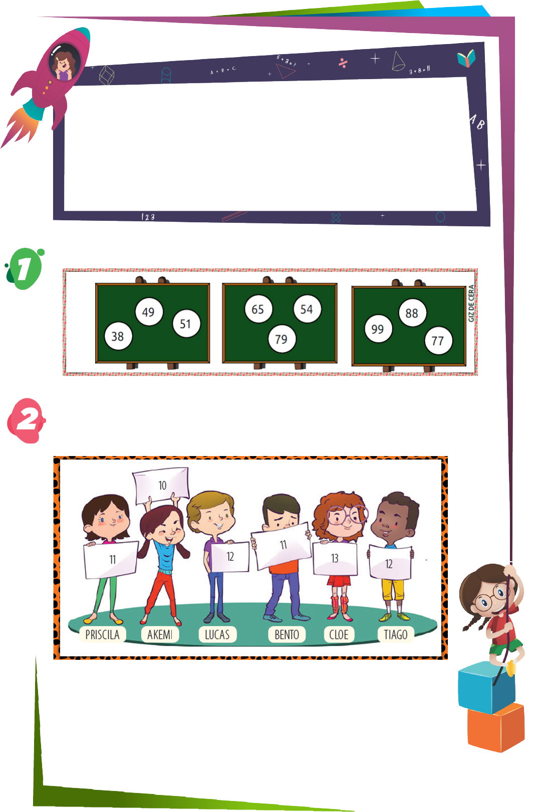 <p>36</p><p>PINTE O MAIOR NÚMERO DE CADA PLACA:</p><p>OS NÚMEROS ESCRITOS NAS PLACAS DE CADA CRIANÇA REPRESENTAM SUAS</p><p>IDADES. ESCREVA O NOME DA CRIANÇA COM MAIS IDADE E, EM SEGUIDA, O NOME</p><p>DA CRIANÇA COM MENOS IDADE.</p><p>_________________________________________________________</p><p>_________________________________________________________</p><p>_________________________________________________________</p><p>2.5 SEQUÊNCIA DIDÁTICA – NÚMEROS - Habilidade -</p><p>EF01MA05</p><p>(EF01MA05) Comparar números naturais de até duas ordens em</p><p>situações cotidianas, com e sem suporte da reta numérica.</p><p>37</p><p>OS IRMÃOS ANDRÉ E ANDRÉIA GOSTAM DE CONTAR ESTRELAS. EM UM SÁBADO,</p><p>ELES CONTARAM 39 ESTRELAS. JÁ NO DOMINGO, ELES CONTARAM 93 ESTRELAS.</p><p>ASSINALE COM UM “X” O DIA QUE OS IRMÃOS CONTARAM MAIS ESTRELAS?</p><p>( ) SÁBADO</p><p>( ) DOMINGO</p><p>OBSERVE A RETA NUMÉRICA. QUAL NÚMERO É MAIOR: 11 OU 14?</p><p>_______________________________________________________________</p><p>_______________________________________________________________</p><p>OBSERVE A RETA NUMÉRICA COM 4 NÚMEROS DESTACADOS. QUAL DESSES</p><p>NÚMEROS DESTACADOS É O MAIOR?</p><p>A) ( ) 74</p><p>B) ( ) 71</p><p>C) ( ) 70</p><p>D) ( ) 67</p><p>OBSERVE A RETA NUMÉRICA. OS NÚMEROS ESTÃO NA ORDEM</p><p>CRESCENTE, DO MENOR PARA O MAIOR.</p><p>AGORA, COMPLETE OS ESPAÇOS COM “MAIOR” OU “MENOR”:</p><p>10 ________________ 8 16 ________________ 19</p><p>9 ________________ 17 4 ________________ 0</p><p>38</p><p>OBSERVE OS ESTOJOS DE QUATRO ALUNOS: DESENHE UMA LINHA EM VOLTA</p><p>DO ESTOJO COM MAIS LÁPIS.</p>