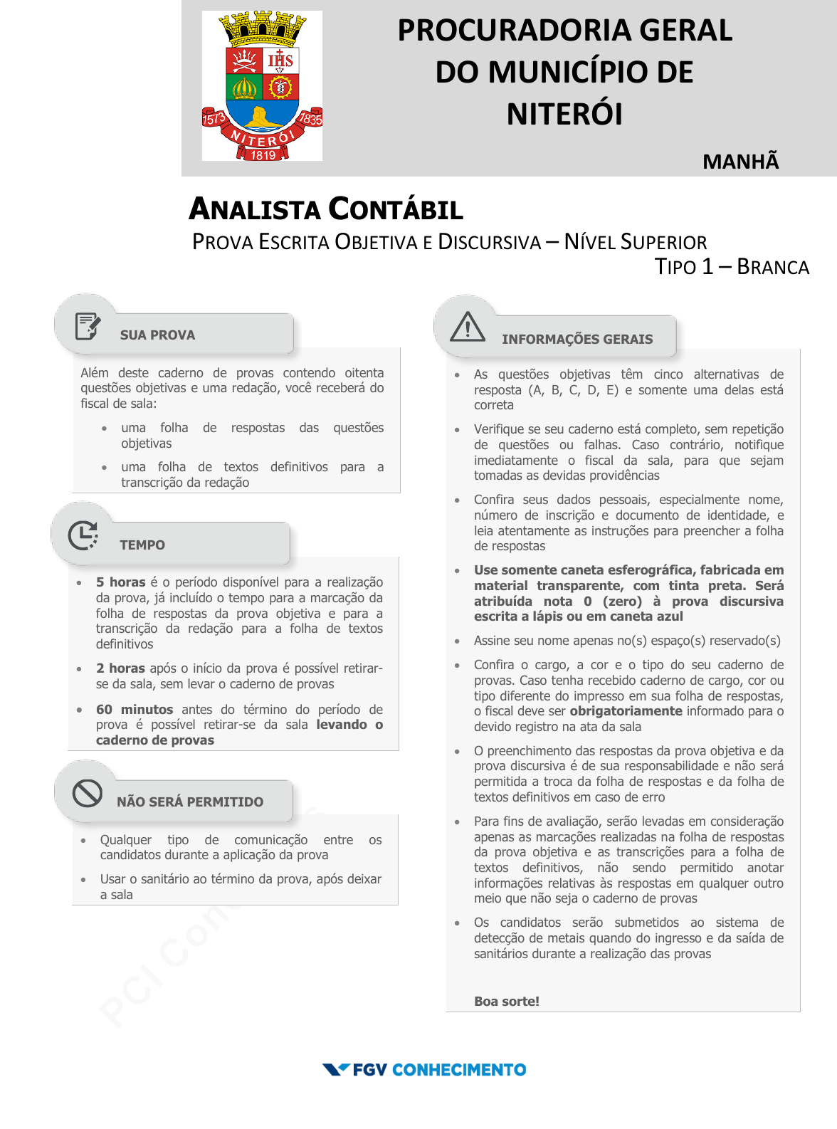 <p>pcimarkpci MDAwMDowMDAwOjAwMDA6MDAwMDowMDAwOmZmZmY6YzkzZTpmNjIy:TW9uLCAyNiBBdWcgMjAyNCAxMDoyMTo1MCAtMDMwMA==</p><p>www.pciconcursos.com.br</p><p>PROCURADORIA GERAL</p><p>DO MUNICÍPIO DE</p><p>NITERÓI</p><p>MANHÃ</p><p>ANALISTA CONTÁBIL</p><p>PROVA ESCRITA OBJETIVA E DISCURSIVA – NÍVEL SUPERIOR</p><p>TIPO 1 – BRANCA</p><p>Além deste caderno de provas contendo oitenta</p><p>questões objetivas e uma redação, você receberá do</p><p>fiscal de sala:</p><p> uma folha de respostas das questões</p><p>objetivas</p><p> uma folha de textos definitivos para a</p><p>transcrição da redação</p><p></p><p> As questões objetivas têm cinco alternativas de</p><p>resposta (A, B, C, D, E) e somente uma delas está</p><p>correta</p><p> Verifique se seu caderno está completo, sem repetição</p><p>de questões ou falhas. Caso contrário, notifique</p><p>imediatamente o fiscal da sala, para que sejam</p><p>tomadas as devidas providências</p><p> Confira seus dados pessoais, especialmente nome,</p><p>número de inscrição e documento de identidade, e</p><p>leia atentamente as instruções para preencher a folha</p><p>de respostas</p><p> Use somente caneta esferográfica, fabricada em</p><p>material transparente, com tinta preta. Será</p><p>atribuída nota 0 (zero) à prova discursiva</p><p>escrita a lápis ou em caneta azul</p><p> Assine seu nome apenas no(s) espaço(s) reservado(s)</p><p> Confira o cargo, a cor e o tipo do seu caderno de</p><p>provas. Caso tenha recebido caderno de cargo, cor ou</p><p>tipo diferente do impresso em sua folha de respostas,</p><p>o fiscal deve ser obrigatoriamente informado para o</p><p>devido registro na ata da sala</p><p> O preenchimento das respostas da prova objetiva e da</p><p>prova discursiva é de sua responsabilidade e não será</p><p>permitida a troca da folha de respostas e da folha de</p><p>textos definitivos em caso de erro</p><p> Para fins de avaliação, serão levadas em consideração</p><p>apenas as marcações realizadas na folha de respostas</p><p>da prova objetiva e as transcrições para a folha de</p><p>textos definitivos, não sendo permitido anotar</p><p>informações relativas às respostas em qualquer outro</p><p>meio que não seja o caderno de provas</p><p> Os candidatos serão submetidos ao sistema de</p><p>detecção de metais quando do ingresso e da saída de</p><p>sanitários durante a realização das provas</p><p>Boa sorte!</p><p> 5 horas é o período disponível para a realização</p><p>da prova, já incluído o tempo para a marcação da</p><p>folha de respostas da prova objetiva e para a</p><p>transcrição da redação para a folha de textos</p><p>definitivos</p><p> 2 horas após o início da prova é possível retirar-</p><p>se da sala, sem levar o caderno de provas</p><p> 60 minutos antes do término do período de</p><p>prova é possível retirar-se da sala levando o</p><p>caderno de provas</p><p> Qualquer tipo de comunicação entre os</p><p>candidatos durante a aplicação da prova</p><p> Usar o sanitário ao término da prova, após deixar</p><p>a sala</p><p>SUA PROVA</p><p>TEMPO</p><p>NÃO SERÁ PERMITIDO</p><p>INFORMAÇÕES GERAIS</p><p>pcimarkpci MDAwMDowMDAwOjAwMDA6MDAwMDowMDAwOmZmZmY6YzkzZTpmNjIy:TW9uLCAyNiBBdWcgMjAyNCAxMDoyMTo1MCAtMDMwMA==</p><p>www.pciconcursos.com.br</p><p>pcimarkpci MDAwMDowMDAwOjAwMDA6MDAwMDowMDAwOmZmZmY6YzkzZTpmNjIy:TW9uLCAyNiBBdWcgMjAyNCAxMDoyMTo1MCAtMDMwMA==</p><p>www.pciconcursos.com.br</p><p>Procuradoria Geral do Município de Niterói FGV Conhecimento</p><p>Analista Contábil Tipo 1 – Branca – Página 3</p><p>CONHECIMENTOS BÁSICOS</p><p>Língua Portuguesa</p><p>1</p><p>“Há certamente pessoas que duvidam que a ciência possa fazer a</p><p>felicidade dos homens. E, de fato, o curso do desenvolvimento,</p><p>que aparece paralelamente ao progresso científico, leva ao</p><p>consumismo, à poluição, a grandes riscos ecológicos.</p><p>“Mas, a meu ver, seria necessário evitar a confusão entre ciência</p><p>e desenvolvimento e dizer, ao contrário, que a ameaça vem da</p><p>quantidade exagerada de ciência.</p><p>“Vamos aos fatos:</p><p>“Uma comparação objetiva do passado com os tempos modernos</p><p>me parece demonstrar isso claramente: a condição humana</p><p>melhorou bastante, sobretudo nos países desenvolvidos, ou seja,</p><p>justamente onde se pratica a ciência. Tal melhora provém da</p><p>utilização de uma infinidade de elementos de segurança e de</p><p>conforto, de comunicação, de informação – os quais, deram a</p><p>cada um o gosto de uma existência melhor. Esses meios de</p><p>felicidade, trazidos pela ciência, sofreram desvios em seus</p><p>objetivos, pois foram multiplicados de uma maneira excessiva...”.</p><p>Sobre a estruturação desse texto argumentativo, é correto</p><p>afirmar que:</p><p>(A) na defesa de seu pensamento, o autor do texto apela para</p><p>argumentos alheios, apoiados todos na realidade;</p><p>(B) o consumismo e a poluição são comprovações da tese do</p><p>autor, mostrando aspectos negativos do desenvolvimento</p><p>científico;</p><p>(C) o texto parte da recusa de uma tese, a de que a ciência não</p><p>faz a felicidade humana;</p><p>(D) ao dizer “Vamos aos fatos” o autor do texto encaminha a</p><p>fundamentação argumentativa para as suas opiniões;</p><p>(E) o gosto de uma existência melhor causou um enorme</p><p>desequilíbrio econômico, retirando o valor positivo da</p><p>ciência.</p><p>2</p><p>Numerosas situações da vida cotidiana ou profissional nos levam</p><p>a contestar ou a defender um ponto de vista, logo, a produzir</p><p>uma argumentação.</p><p>Todas as opções abaixo mostram sugestões de temas para textos</p><p>argumentativos; a opção em que é proposta uma estruturação</p><p>com base em duas teses possíveis, é:</p><p>(A) Como será o sistema de trabalho no futuro?</p><p>(B) Os jornais falados e escritos estão em franca disputa por</p><p>leitores; qual dos dois modelos vai