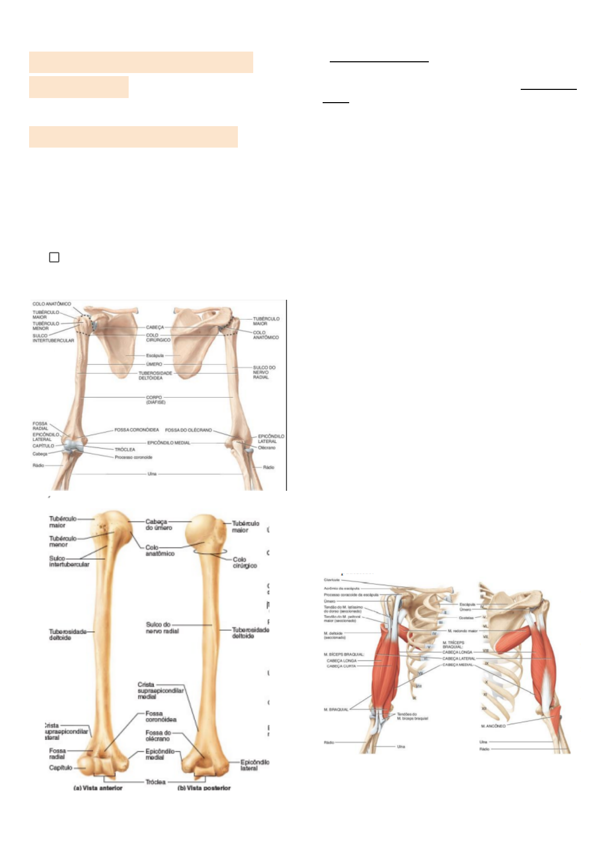 <p>LAVYNIA FERREIRA</p><p>MEMBRO SUPERIOR E</p><p>INFERIOR:</p><p>MEMBRO SUPERIOR:</p><p>1. ANATOMIA DOS MEMBROS SUPERIORES:</p><p>↳ Cada membro superior apresenta 30 ossos em três</p><p>locais, o úmero no braço, a ulna e o rádio no antebraço,</p><p>os 8 ossos carpais (punho), os 5 ossos metacarpais</p><p>(palma) e as 14 falanges (ossos dos dedos) na mão.</p><p>BRAÇO:</p><p>➤ ESQUELETO (ÚMERO):</p><p>↳ Extremidade proximal apresenta uma cabeça redonda</p><p>que se articula com a cavidade glenoidal da escápula e</p><p>forma a articulação do ombro. Enquanto a extremidade</p><p>distal articula com os ossos do antebraço (ulna e rádio),</p><p>formando a articulação do cotovelo.</p><p>✓ Colo anatômico: distal à cabeça e visível como um</p><p>sulco oblíquo (local da antiga placa epifisial);</p><p>✓ Tubérculo maior: projeção lateral, é o acidente ósseo</p><p>palpável mais lateral da região do ombro,</p><p>imediatamente abaixo do acrômio da escápula;</p><p>✓ Tubérculo menor: se projeta anteriormente.</p><p>OBS.: sulco intertubercular entre os dois tubérculos.</p><p>✓ Colo cirúrgico: constrição no úmero imediatamente</p><p>distal aos tubérculos, cabeça se afila até a diáfise;</p><p>✓ Corpo (diáfase): praticamente cilíndrico em sua</p><p>extremidade proximal, porém, se torna triangular até</p><p>ficar achatado e largo em sua extremidade distal.</p><p>✓ Tuberosidade Deltoidea: área rugosa que serve de</p><p>ponto de inserção para os tendões desse músculo.</p><p>✓ Capítulo: protuberância arredondada na parte lateral</p><p>do osso que se articula com a cabeça do rádio.</p><p>✓ Fossa radial: depressão anterior acima do capítulo,</p><p>se articula com rádio quando o antebraço é flexionado.</p><p>✓ Tróclea: localizada medialmente ao capítulo,</p><p>superfície que se articula com incisura troclear da ulna.</p><p>✓ Fossa Coronoidea: depressão anterior, recebe o</p><p>processo coronoide da ulna quando o antebraço é</p><p>flexionado.</p><p>✓ Fossa do olecrano: depressão posterior que recebe</p><p>o olécrano da ulna quando o antebraço é estendido.</p><p>✓ Epicôndilo lateral e medial: projeções rugosas nos 2</p><p>lados da extremidade distal do úmero, onde os tendões</p><p>da maioria dos músculos do antebraço estão inseridos.</p><p>➤ MÚSCULOS DO BRAÇO:</p><p>↳ 4 principais músculos do braço, os 3 flexores (bíceps</p><p>braquial, braquial e coracobraquial) estão no</p><p>compartimento anterior (flexor), supridos pelo nervo</p><p>LAVYNIA FERREIRA</p><p>musculocutâneo, e 1 extensor (tríceps braquial) está no</p><p>compartimento posterior, suprido pelo nervo radial.</p><p>ANTEBRAÇO:</p><p>➤ ESQUELETO (ULNA E RÁDIO):</p><p>↳ ULNA: na parte medial (dedo mínimo) do antebraço;</p><p>na extremidade proximal da ulna está o olécrano, que</p><p>forma a proeminência do cotovelo</p><p>↳ RÁDIO: na parte lateral (polegar) do antebraço,</p><p>estreito na sua extremidade proximal e mais largo na</p><p>extremidade distal.</p><p>✓ TUBEROSIDADE DA ULNA: logo abaixo do</p><p>processo coronoide, na qual o músculo braquial se</p><p>insere.</p><p>↳ Processo estiloide da ulna: localizado no lado</p><p>posterior da extremidade distal, oferecendo inserção</p><p>para o ligamento ulnar.</p><p>✓ TUBEROSIDADE DO RÁDIO: inferior ao colo no</p><p>lado anteromedial, que é ponto de inserção para o</p><p>tendão do músculo bíceps braquial.</p><p>↳ Processo estiloide do rádio: a diáfise do rádio</p><p>alarga-se para formá-lo, fornece inserção para o</p><p>músculo braquiorradial e para o ligamento colateral</p><p>radial do punho.</p><p>- INCISURA TROCLEAR: área curva entre o olécrano e</p><p>o processo coronoide que forma parte da articulação do</p><p>cotovelo. Lateral e inferiormente à incisura troclear há a</p><p>incisura radial, que se articula com a cabeça do rádio.</p><p>- INCISURA ULNAR: contida na extremidade distal do</p><p>rádio, que se articula com a cabeça da ulna.</p><p>> Ulna e o rádio se articulam com o úmero na</p><p>articulação do cotovelo, ocorrendo em dois lugares:</p><p>1. onde a cabeça do rádio se articula com o capítulo do</p><p>úmero;</p><p>2. onde a incisura troclear da ulna se articula com a</p><p>tróclea do úmero.</p><p>> Ulna e o rádio se articulam em três locais:</p><p>1. Membrana interóssea: tecido conjuntivo fibroso largo</p><p>e plano, que une as diáfises dos dois ossos, além de</p><p>fornecer área de inserção para alguns músculos</p><p>esqueléticos profundos do antebraço.</p><p>2. Articulação Radiulnar proximal: a cabeça do rádio se</p><p>articula com a incisura radial da ulna.</p><p>3. Articulação Radiulnar distal: a cabeça da ulna se</p><p>articula com a incisura ulnar do rádio.</p><p>ATENÇÃO: extremidade distal do rádio se articula com</p><p>três ossos do punho (semilunar, o escafoide e o</p><p>piramidal) para formar a articulação radiocarpal</p><p>(punho).</p><p>➤ MÚSCULOS DO ANTEBRAÇO:</p><p>↳ Movimentam o punho, a mão, o polegar e os dedos.</p><p>✓ Músculos flexores do antebraço: situados no</p><p>compartimento anterior (flexor–pronador) do antebraço,</p><p>são separados dos músculos extensores do antebraço</p><p>pelo rádio e ulna e, nos dois terços distais do</p><p>antebraço, pela membrana interóssea que os une.</p><p>✓ Músculos extensores do antebraço: situados no</p><p>compartimento posterior (extensor–supinador) do</p><p>antebraço, e todos são inervados por ramos do nervo</p><p>radial. Podem ser organizados fisiologicamente em três</p><p>grupos:</p><p>1. Músculos que estendem e abduzem ou aduzem</p><p>a mão na articulação do punho (radiocarpal)</p><p>(extensor radial longo do carpo, extensor radial</p><p>curto do carpo e extensor ulnar do carpo);</p><p>2. Músculos que estendem os quatro dedos</p><p>mediais (extensor dos dedos, extensor do</p><p>indicador e extensor do dedo m