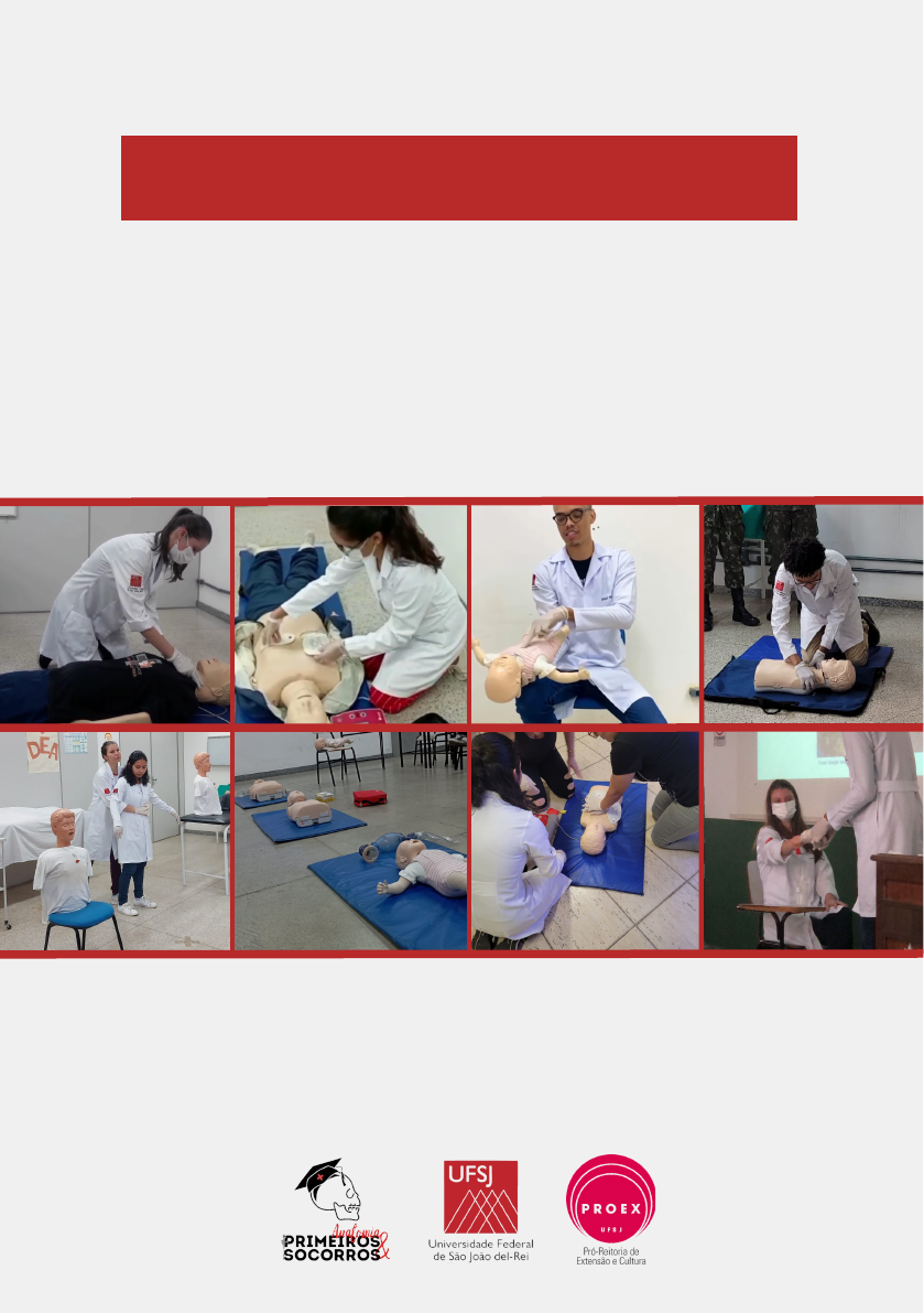 <p>NOÇÕES DE</p><p>PRIMEIROS</p><p>SOCORROS</p><p>GUIA PRÁTICO</p><p>NOÇÕES BÁSICAS DE PROCEDIMENTOS E</p><p>CUIDADOS QUE SALVAM VIDAS E TODOS DEVEM</p><p>TER CONHECIMENTO</p><p>Guia Prático Noções de Primeiros Socorros</p><p>Reitor Universidade Federal de São João del-Rei</p><p>Prof. Dr. Marcelo Pereira Andrade</p><p>Coordenadores do Programa de Extensão:</p><p>Profª. Drª. Maira de Castro Lima</p><p>Prof. Dr. Heber Paulino Pena</p><p>Revisão:</p><p>Profª. Drª. Selma Maria da Fonseca Viegas</p><p>Vice-Reitora Universidade Federal de São João del-Rei</p><p>Profª. Drª. Rosy Iara Maciel de Azambuja Ribeiro</p><p>Pró-Reitora de Ensino de Graduação</p><p>Profª. Cristiane Medina Finzi</p><p>Diretora do Campus Centro-Oeste</p><p>Profª. Hérica de Lima Santos</p><p>Coordenador do Curso de Graduação em Enfermagem</p><p>Prof. Dr. Juliano Teixeira Moraes</p><p>Pró-Reitor de Ensino de Graduação</p><p>Prof. Francisco Ângelo Brinati</p><p>Coordenador do Curso de Graduação em Farmácia</p><p>Profª. Mariana Linhares Pereira</p><p>Coordenador do Curso de Graduação em Medicina</p><p>Profª. Andressa Vinha Zanúncio</p><p>Produto do Programa de Extensão Ensino de Anatomia e Primeiros</p><p>Socorros em Divinópolis - Minas Gerais</p><p>UNIVERSIDADE FEDERAL DE SÃO JOÃO DEL-REI, CAMPUS</p><p>CENTRO-OESTE (UFSJ-CCO)</p><p>Elaboração, Edição e Layout:</p><p>Acadêmicos:</p><p>Bárbara Samelyne de Oliveira Melo</p><p>Daniel Gonçalves Elias</p><p>Gabrielly Alves de Oliveira</p><p>Helena Catizani Franco de Faria</p><p>Karine da Silva Souza</p><p>Késia Silva e Sousa</p><p>Lucas Henrique Faria Santos</p><p>Samuel de Paula Pinheiro</p><p>Sarah Ferreira Neves</p><p>Stella Honório Prado</p><p>Produção, distribuição e informações:</p><p>Programa de Extensão Ensino de Anatomia e Primeiros Socorros</p><p>em Divinópolis - Minas Gerais</p><p>Endereço: Rua Sebastião Gonçalves Coelho, 400 - Bairro</p><p>Chanadour - Divinópolis, MG - CEP.: 35.501-296 - Brasil</p><p>E-mail: programadeanatomiaufsj@gmail.com</p><p>Guia Prático Noções de Primeiros Socorros</p><p>Todos os direitos reservados ao Programa de Extensão Anatomia e</p><p>Primeiros Socorros - Universidade Federal de São João del-Rei.</p><p>INTRODUÇÃO</p><p>QUEM CHAMAR?</p><p>ITENS BÁSICOS DE PRIMEIROS SOCORROS</p><p>PARADA CARDIORRESPIRATÓRIA</p><p>OBSTRUÇÃO DAS VIAS AÉREAS POR CORPO ESTRANHO</p><p>DESMAIO</p><p>POSIÇÃO LATERAL DE SEGURANÇA</p><p>CRISE CONVULSIVA</p><p>QUEIMADURAS</p><p>FEBRE</p><p>COMPRESSAS</p><p>FERIMENTOS</p><p>HEMORRAGIA</p><p>EPISTAXE</p><p>ANIMAIS PEÇONHENTOS</p><p>ACIDENTES COM SERPENTES</p><p>ACIDENTES COM ESCORPIÃO</p><p>ACIDENTES COM ARANHAS</p><p>REFERÊNCIAS</p><p>ÍNDICE</p><p>05</p><p>06</p><p>08</p><p>10</p><p>19</p><p>24</p><p>28</p><p>29</p><p>32</p><p>40</p><p>45</p><p>48</p><p>51</p><p>55</p><p>57</p><p>57</p><p>61</p><p>63</p><p>65</p><p>ÍN</p><p>D</p><p>IC</p><p>E</p><p>PR</p><p>O</p><p>G</p><p>RA</p><p>M</p><p>A</p><p>D</p><p>E</p><p>A</p><p>N</p><p>A</p><p>TO</p><p>M</p><p>IA</p><p>E</p><p>P</p><p>RI</p><p>M</p><p>EI</p><p>RO</p><p>S</p><p>SO</p><p>C</p><p>O</p><p>RR</p><p>O</p><p>S</p><p>INTRODUÇÃO</p><p>Noções de primeiros socorros são fundamentais para a</p><p>população, pois o conhecimento das técnicas básicas</p><p>possibilita uma tomada de decisão e atitude perante uma</p><p>situação de emergência.</p><p>No contexto escolar o professor é o principal alvo, visto</p><p>que ele passa a maior parte do tempo com os alunos e</p><p>pode possibilitar ações em primeiros socorros e salvar</p><p>vidas.</p><p>Com base nisso, foi realizado um levantamento em 9</p><p>escolas, de um município de Minas Gerais, acerca das</p><p>principais dúvidas de primeiros socorros para</p><p>construção desse material e divulgação em todo o país,</p><p>tendo em vista que até o serviço de emergência ser</p><p>acionado o conhecimento prévio de primeiros socorros</p><p>salva vidas.</p><p>IN</p><p>TR</p><p>O</p><p>D</p><p>U</p><p>Ç</p><p>Ã</p><p>O</p><p>PR</p><p>O</p><p>G</p><p>RA</p><p>M</p><p>A</p><p>D</p><p>E</p><p>A</p><p>N</p><p>A</p><p>TO</p><p>M</p><p>IA</p><p>E</p><p>P</p><p>RI</p><p>M</p><p>EI</p><p>RO</p><p>S</p><p>SO</p><p>C</p><p>O</p><p>RR</p><p>O</p><p>S</p><p>0 5</p><p>Em momentos de emergência é necessário saber agir,</p><p>pensar qual órgão acionar, já que cada minuto conta para</p><p>salvar uma vida.</p><p>O conhecimento prévio sobre as atribuições do Serviço</p><p>de Atendimento Móvel de Urgência (SAMU) e do CORPO</p><p>DE BOMBEIROS é fundamental para acioná-los para</p><p>prestar o atendimento, pelas peculiaridades que cada</p><p>demanda exige.</p><p>SA</p><p>M</p><p>U</p><p>x</p><p>B</p><p>O</p><p>M</p><p>BE</p><p>IR</p><p>O</p><p>S</p><p>PR</p><p>O</p><p>G</p><p>RA</p><p>M</p><p>A</p><p>D</p><p>E</p><p>A</p><p>N</p><p>A</p><p>TO</p><p>M</p><p>IA</p><p>E</p><p>P</p><p>RI</p><p>M</p><p>EI</p><p>RO</p><p>S</p><p>SO</p><p>C</p><p>O</p><p>RR</p><p>O</p><p>S</p><p>SAMU</p><p>QUEM CHAMAR?</p><p>O atendimento do SAMU 192 começa a partir do chamado</p><p>telefônico, quando são prestadas orientações sobre as</p><p>primeiras ações. A ligação é gratuita.</p><p>Quando ligar para o SAMU 192:</p><p>Na ocorrência de problemas cardiorrespiratórios;</p><p>Intoxicação exógena e envenenamento;</p><p>Queimaduras graves;</p><p>Na ocorrência de maus tratos;</p><p>Suspeita de Infarto ou AVC (AVE) (alteração na fala,</p><p>perda de força em um lado do corpo e desvio da</p><p>comissura labial são os sintomas mais comuns);</p><p>0 6</p><p>Agressão por arma de fogo ou arma branca;</p><p>Crises convulsivas;</p><p>Acidentes/traumas com vítimas;</p><p>Afogamentos;</p><p>Outras situações consideradas de urgência ou</p><p>emergência, com risco de morte, sequela ou</p><p>sofrimento intenso.</p><p>SA</p><p>M</p><p>U</p><p>x</p><p>B</p><p>O</p><p>M</p><p>BE</p><p>IR</p><p>O</p><p>S</p><p>PR</p><p>O</p><p>G</p><p>RA</p><p>M</p><p>