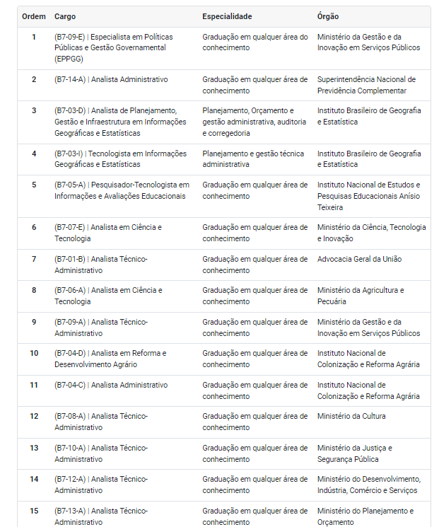 <p>Ordem Cargo Especialidade 1 (B7-09-E) Especialista em Políticas Graduação em qualquer área do Ministério da Gestão e da Públicas e Gestão Governamental conhecimento Inovação em Serviços Públicos (EPPGG) 2 (B7-14-A) Analista Administrativo Graduação em qualquer área de Superintendência Nacional de conhecimento Previdência Complementar 3 (B7-03-D) Analista de Planejamento, Planejamento, Orçamento e Instituto Brasileiro de Geografia Gestão e Infraestrutura em Informações gestão administrativa, auditoria e Estatística e Estatísticas e corregedoria 4 Tecnologista em Informações Planejamento e gestão técnica Instituto Brasileiro de Geografia e Estatísticas administrativa e Estatística 5 (B7-05-A) Pesquisador-Tecnologista em Graduação em qualquer area de Instituto Nacional de Estudos e Informações e Avaliações Educacionais conhecimento Pesquisas Educacionais Teixeira 6 (B7-07-E) Analista em Ciência e Graduação em qualquer de Ministério da Ciência, Tecnologia Tecnologia conhecimento e Inovação 7 (B7-01-B) Analista Técnico- Graduação em qualquer de Advocacia Geral da União Administrativo conhecimento 8 (B7-06-A) Analista em Ciência e Graduação em qualquer de Ministério da Agricultura e Tecnologia conhecimento Pecuária 9 (B7-09-A) Analista Técnico- Graduação em qualquer área de Ministério da Gestão e da Administrativo conhecimento Inovação em Serviços Públicos 10 (B7-04-D) Analista em Reforma e Graduação em qualquer de Instituto Nacional de Desenvolvimento Agrário conhecimento Colonização e Reforma Agrária 11 (B7-04-C) Analista Administrativo Graduação em qualquer área de Instituto Nacional de conhecimento Colonização e Reforma Agrária 12 (B7-08-A) Analista Técnico- Graduação em qualquer de da Cultura Administrativo conhecimento 13 (B7-10-A) Analista Técnico- Graduação em qualquer area de Ministério da Justiça e Administrativo conhecimento Segurança Pública 14 (B7-12-A) Analista Técnico- Graduação em qualquer area de Ministério do Desenvolvimento, Administrativo conhecimento e Serviços 15 (B7-13-A) Analista Técnico- Graduação em qualquer de Ministério do Planejamento e Administrativo conhecimento Orçamento</p>