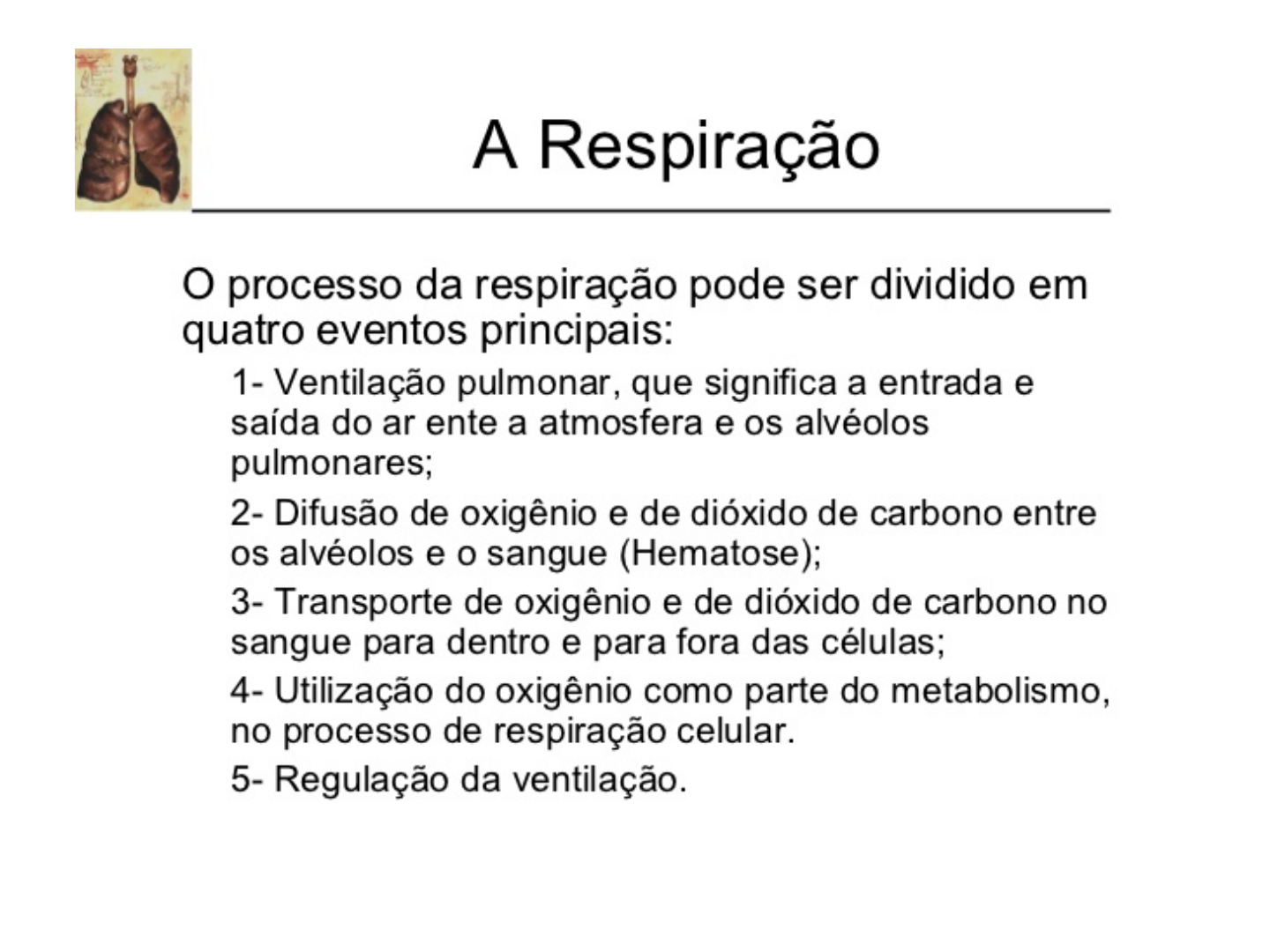 <p>A Respiração O processo da respiração pode ser dividido em quatro eventos principais: 1- Ventilação pulmonar, que significa a entrada e saída do ar ente a atmosfera e os alvéolos pulmonares; 2- Difusão de oxigênio e de dióxido de carbono entre os alvéolos e o sangue (Hematose); 3- Transporte de oxigênio e de dióxido de carbono no sangue para dentro e para fora das células; 4- Utilização do oxigênio como parte do metabolismo, no processo de respiração celular. 5- Regulação da ventilação.</p><p>O Sistema Respiratório Sangue Arterial Sangue Venos o Fossas Nasais Boca Faringe Capilares Laringe Traquéla Brônquios Pulmão E Pulmão D Diafrágma Alvéolos Pulmonares</p><p>O Sistema Respiratório Pedúnculo pulmonar Artérias e Pulmonares 1- Aorta; 2-Artéria pulmonar; 3-Veias pulmonares; 5-Coração</p><p>Ventilação Pulmonar Vias Aéreas Superiores: Fossas nasais: São duas cavidades paralelas que começam nas narinas e terminam na faringe. São separadas uma da outra por uma parede cartilaginosa denominada septo nasal. Tem as funções de filtrar, umedecer e aquecer o ar. Cavidad nasal Faringe: Fosa Canal comum aos sistemas digestório e nasal respiratório. Comunica-se com a boca e com as fossas Garganta Boca nasais. inspirado pelas narinas ou pela (faringe) boca passa necessariamente pela faringe, antes de atingir a laringe. Epiglot Laringe: e É a continuação à faringe. A entrada da laringe chama-se glote. Acima dela existe uma cartilagem denominada epiglote, que funciona como válvula. Quando nos alimentamos, a laringe sobe e sua entrada é fechada pela epiglote. Isso impede que o Laringe alimento ingerido penetre nas vias respiratórias. epitélio que reveste a laringe apresenta pregas, as cordas vocais, capazes de produzir sons durante a passagem de ar.</p><p>Ventilação Pulmonar Vias Aéreas Inferiores: Traquéia: é um tubo de aproximadamente cm de por 10-12 de comprimento, sua paredes são reforçadas por anéis Bifurca-se na sua região inferior, originando os brônquios. Possui um epitélio de revestimento muco-ciliar que Traquéla protege o sistema contra bactérias e poeiras presentes Brônquio no inspirado. Direito Condutos cartilaginosos que segue a bifurcação da Esquerdo traquéia e penetram nos São constituídos por anéis incompletos de cartilagem e fibras musculares, conferindo mobilidade. São também revestidos por epitélio ciliado, rico em células caliciformes (produtoras de muco). Nos os brônquios ramificam-se profusamente, dando origem a tubos cada vez mais finos, os Formado por músculo liso, sem cartilagem. conjunto altamente ramificado de é a árvore brônquica ou árvore respiratória. Cada termina em pequenas bolsas formadas por células epiteliais achatadas (tecido epitelial pavimentoso) recobertas por capilares denominadas alvéolos pulmonares.</p><p>Ventilação Pulmonar Os pulmões são órgãos esponjosos, com Pleura (Covering of the Lungs) aproximadamente 25 cm de comprimento, sendo envolvidos por uma membrana serosa Ribs denominada pleura. São divididos em segmentos denominados Lung lobos. O pulmão esquerdo possui dois lobos e direito possui três. Pleural space Pleura visceral Pleura o 2001 Corporation parietal</p><p>Ventilação Pulmonar Sangue arterial Sangue Venoso Alvéolos: Unidade funcional do pulmão. Local onde ocorre a HEMATOSE. alvéolo é uma bolsa circulada de vasos sanguíneos bem pequenos, os capilares. Capilares sanguíneos Alvéolos</p><p>Ventilação Pulmonar Músculos da Ventilação - Escalenos intercostais internos intercostais externos Obliquo externo Diafragama Obliquo interno Reto abdominal Transverso abdominal Músculos inspiratórios Músculos expiratórios</p><p>Ventilação Pulmonar Dinâmica da inspiração As costelas são levantadas e esterno é projectado para a frente pela contracção dos músculos intercostais externos. A caixa torácica expande-se o diafragma contrai e move-se para baixo</p><p>Ventilação Pulmonar Dinâmica da expiração Músculos intercostais externos relaxam, permitindo que as costelas e o esterno retomem as suas posições iniciais A caixa torácica retrai-se Diafragma relaxa, movendo-se para cima</p><p>Ventilação Pulmonar Ar inspirado Ar expirado Composição do ar inspirado e expirado pelo sistema 79% 79% respiratório 20,94% 15,7% CO2 0,04% 5% H2O 0,5% 6,2% Fonte: Guyton, Fisiologia médica</p><p>Hematose cavidade nasal laringe cordas traquéia vocais alvéolos esquerdo direito pulmonar O2 O2 O2 CO2 O2 capilares O2 O2 CO2 a CO2 CO2 capilar alveolar capilar</p><p>Hematose Sangue desoxigenado Sangue oxigen Alvéolo Para a veia pulmonar Capilar Da artéria Eritrócito pulmonar sem oxigênio Alvéolo Dióxido de carbono Capilares Oxigênio Eritrócito com oxigênio</p><p>Hematose É a difusão do e os alvéolos pulmonares e capilares que se dá graças as diferenças de pressões parciais desses gases no sangue e nos alvéolos.</p><p>Transporte e difusão tecidual de Transporte de O2 : Maior parte é transportada junto coma hemoglobina formando a oxihemoglobina. 4Hb Uma pequena parte é diluída no sangue. A pressão parcial de é maior no sangue do que nos tecidos, ocorrendo a difusão do sanguíneo para tecido.</p><p>Transporte e difusão tecidual de e Transporte de : A pressão arterial de é maior nos tecidos do que no sangue, dessa forma o gás sai dos tecidos e vai para o sangue. Transporte de ocorre de 3 maneiras: 5% fica absorvido no plasma; 25% se associam à hemoglobina formando a carbohemoglobina: Hb + - A maior parte (cerca de 70%), reage com a água e forma que se dissocia em H+ (associado à hemácia) + (vai para o plasma).</p><p>Regulação da Respiração O controle da respiração é feito automaticamente por um centro nervoso localizado no bulbo, de onde partem os nervos e estímulos responsáveis pela contração dos músculos respiratórios. O principal mecanismo de regulação depende da concentração de no sangue. Quando ocorre maior