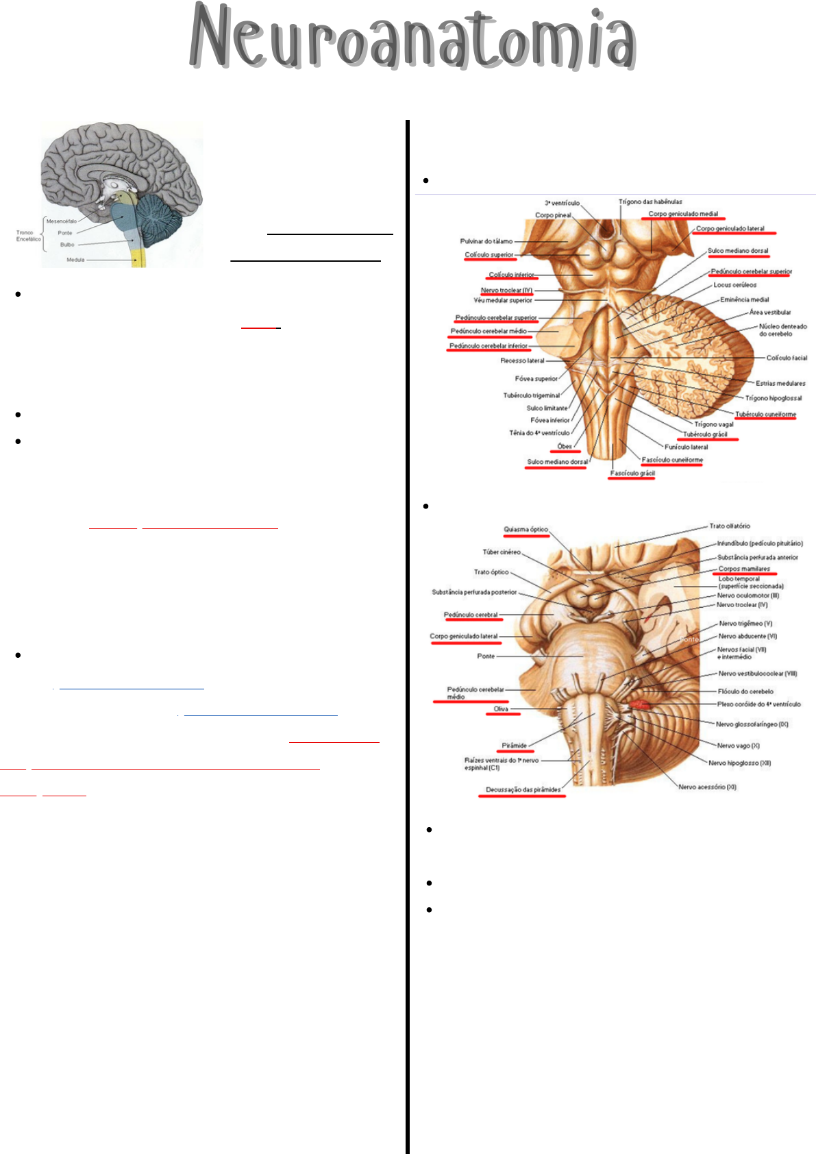 <p>NeuroanatomiaNeuroanatomiaNeuroanatomia</p><p>Tronco encefálico</p><p>O Tronco Encefálico é</p><p>composto pelo</p><p>Mesencéfalo, Ponte e</p><p>Bulbo, do mais cranial</p><p>para o mais caudal</p><p>Localizado na fossa posterior do crânio e na</p><p>superfície ventral sobre o clivo.</p><p>- O limite inferior do tronco é no forame</p><p>magno, abaixo dele já é medula.</p><p>No interior do TE, temos:</p><p>Substância cinzenta</p><p>Corpos celulares de neurônios:</p><p>- Núcleos de nervos encefálicos (cranianos) do</p><p>III ao XII: Motor, sensitivo e misto</p><p>Formação reticular:</p><p>- Centros vitais, estimulo cortical, consciência,</p><p>regulação do tônus, postura e reflexos.</p><p>Substância branca</p><p>Possui fibras ascendentes, que se originam na</p><p>medula espinhal, e as fibras descendentes, que se</p><p>originam nos hemisférios cerebrais. Outras têm</p><p>origem e término nos núcleos do tronco</p><p>encefálico.</p><p>* Fibras ascendentes: vão para o tálamo</p><p>- Trato espinotalâmico</p><p>- Lemnisco medial</p><p>- Tratos trigeminotalâmicos</p><p>* Fibras descendentes: vem do córtex</p><p>- Trato corticospinal (trato piramidal)</p><p>- Trato corticobulbar</p><p>* Esses são alguns exemplos de fibras</p><p>Características externas do TE</p><p>Superfície dorsal do tronco encefálico</p><p>Superfície ventral do tronco encefálico</p><p>BULBO: Atua na deglutição, funções</p><p>cardíacas, equilíbrio e movimentos da língua.</p><p>Engloba os nervos: IX, X, XI, XII</p><p>Possui os núcleos:</p><p>- Específicos do bulbo:</p><p>Núcleo grácil, núcleo cuneiforme e núcleos olivares</p><p>- Núcleos dos nervos cranianos:</p><p>Motores: Núcleo ambíguo, Núcleo dorsal do vago,</p><p>Núcleo do hipoglosso, Núcleo salivatório inferior</p><p>Sensitivos: Núcleo trato espinal do trigêmio,</p><p>Núcleo do trato solitário e Núcleos vestibulares</p><p>(médio e inferior).</p><p>NeuroanatomiaNeuroanatomiaNeuroanatomia</p><p>Tronco encefálico</p><p>Resumo das estruturas do bulbo</p><p>PONTE:</p><p>Engloba os nervos: V (ponte), VI, VII, VIII</p><p>(sulco bulbo pontíneo)</p><p>Possui os núcleos:</p><p>- Específicos da ponte:</p><p>Núcleos pontinos, núcleo olivar superior, núcleo do</p><p>corpo trapezoide e núcleo do lemnisco lateral</p><p>- Núcleos dos nervos cranianos</p><p>Núcleo do V, Núcleo do VI, Núcleo do VII, Núcleos</p><p>do VIII.</p><p>Resumo das estruturas da ponte</p><p>MESENCÉFALO</p><p>Engloba os nervos: III, IV</p><p>Possui núcleos:</p><p>- Específicos do mesencéfalo</p><p>Núcleo rubro, substância negra, colículo superior,</p><p>colículo inferior e área pré-tectal</p><p>- Núcleos de nervos cranianos:</p><p>Núcleo do III, núcleo do IV e núcleo do trato</p><p>mesencefálico do V.</p><p>Resumo das estruturas do mesencéfalo</p><p>Mesencéfalo em corte transversal</p>