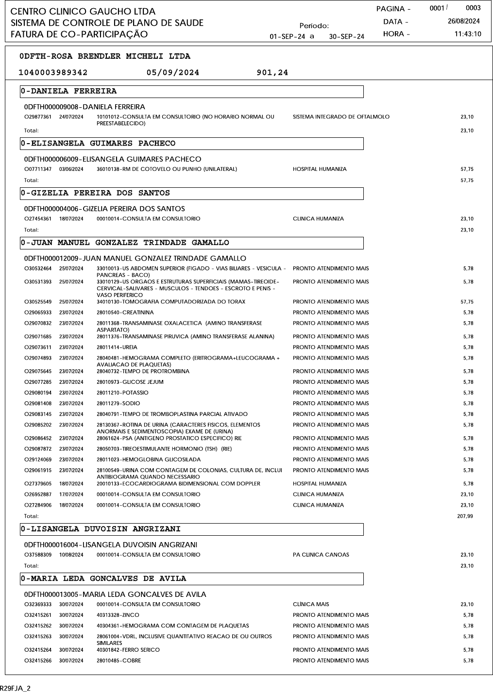 <p>CENTRO CLINICO GAUCHO LTDA PAGINA 0001 0003 SISTEMA DE CONTROLE DE PLANO DE SAUDE DATA 26/08/2024 Período: FATURA DE CO-PARTICIPAÇÃO 01-SEP-24 a 30-SEP-24 HORA 11:43:10 FTH-ROSA BRENDLER MICHELI LTDA 1040003989342 05/09/2024 901,24 -DANIELA FERREIRA 0DFTH000009008 - DANIELA FERREIRA O29877361 24/07/2024 10101012-CONSULTA EM CONSULTORIO (NO HORARIO NORMAL OU SISTEMA INTEGRADO DE OFTALMOLO 23,10 PREESTABELECIDO) Total: 23,10 0 - ELISANGELA GUIMARES PACHECO 0DFTH000006009 - ELISANGELA GUIMARES PACHECO O07711347 03/06/2024 36010138-RM DE COTOVELO OU PUNHO (UNILATERAL) HOSPITAL HUMANIZA 57,75 Total: 57,75 0 - GIZELIA PEREIRA DOS SANTOS 0DFTH000004006 - GIZELIA PEREIRA DOS SANTOS O27454361 18/07/2024 00010014-CONSULTA EM CONSULTORIO CLINICA HUMANIZA 23,10 Total: 23,10 0 - JUAN MANUEL GONZALEZ TRINDADE GAMALLO 0DFTH000012009 JUAN MANUEL GONZALEZ TRINDADE GAMALLO O30532464 25/07/2024 33010013-US ABDOMEN SUPERIOR (FIGADO - VIAS BILIARES - VESICULA PRONTO ATENDIMENTO MAIS 5,78 PANCREAS BACO) O30531393 25/07/2024 33010129-US ORGAOS E ESTRUTURAS SUPERFICIAIS (MAMAS-TIREOIDE- PRONTO ATENDIMENTO MAIS 5,78 CERVICAL-SALIVARES - MUSCULOS - TENDOES - ESCROTO E PENIS - VASO PERIFERICO O30525549 25/07/2024 34010130-TOMOGRAFIA COMPUTADORIZADA DO TORAX PRONTO ATENDIMENTO MAIS 57,75 O29065933 23/07/2024 28010540-CREATININA PRONTO ATENDIMENTO MAIS 5,78 O29070832 23/07/2024 28011368-TRANSAMINASE OXALACETICA (AMINO TRANSFERASE PRONTO ATENDIMENTO MAIS 5,78 ASPARTATO) O29071685 23/07/2024 28011376-TRANSAMINASE PIRUVICA (AMINO TRANSFERASE ALANINA) PRONTO ATENDIMENTO MAIS 5,78 O29073611 23/07/2024 28011414-UREIA PRONTO ATENDIMENTO MAIS 5,78 O29074893 23/07/2024 28040481-HEMOGRAMA COMPLETO (ERITROGRAMA+LEUCOGRAMA + PRONTO ATENDIMENTO MAIS 5,78 AVALIACAO DE PLAQUETAS) O29075645 23/07/2024 28040732-TEMPO DE PROTROMBINA PRONTO ATENDIMENTO MAIS 5,78 O29077285 23/07/2024 28010973-GLICOSE JEJUM PRONTO ATENDIMENTO MAIS 5,78 O29080194 23/07/2024 28011210-POTASSIO PRONTO ATENDIMENTO MAIS 5,78 O29081408 23/07/2024 28011279-SODIO PRONTO ATENDIMENTO MAIS 5,78 O29083145 23/07/2024 28040791-TEMPO DE TROMBOPLASTINA PARCIAL ATIVADO PRONTO ATENDIMENTO MAIS 5,78 O29085202 23/07/2024 28130367-ROTINA DE URINA (CARACTERES FISICOS, ELEMENTOS PRONTO ATENDIMENTO MAIS 5,78 ANORMAIS E SEDIMENTOSCOPIA) EXAME DE (URINA) O29086452 23/07/2024 28061624-PSA (ANTIGENO PROSTATICO ESPECIFICO) RIE PRONTO ATENDIMENTO MAIS 5,78 O29087872 23/07/2024 28050703-TIREOESTIMULANTE HORMONIO (TSH) (RIE) PRONTO ATENDIMENTO MAIS 5,78 O29124069 23/07/2024 28011023-HEMOGLOBINA GLICOSILADA PRONTO ATENDIMENTO MAIS 5,78 O29061915 23/07/2024 28100549-URINA COM CONTAGEM DE COLONIAS, CULTURA INCLUI PRONTO ATENDIMENTO MAIS 5,78 ANTIBIOGRAMA QUANDO NECESSARIO O27379605 18/07/2024 20010133-ECOCARDIOGRAMA BIDIMENSIONAL COM DOPPLER HOSPITAL HUMANIZA 5,78 O26952887 17/07/2024 00010014-CONSULTA EM CONSULTORIO CLINICA HUMANIZA 23,10 O27284906 18/07/2024 00010014-CONSULTA EM CONSULTORIO CLINICA HUMANIZA 23,10 Total: 207,99 0 LISANGELA DUVOISIN ANGRIZANI DUVOISIN ANGRIZANI O37588309 10/08/2024 00010014-CONSULTA EM CONSULTORIO PA CLINICA CANOAS 23,10 Total: 23,10 0 -MARIA LEDA GONCALVES DE AVILA 0DFTH000013005-MARIA LEDA GONCALVES DE AVILA O32369333 30/07/2024 00010014-CONSULTA EM CONSULTORIO CLÍNICA MAIS 23,10 O32415261 30/07/2024 40313328-ZINCO PRONTO ATENDIMENTO MAIS 5,78 O32415262 30/07/2024 40304361-HEMOGRAMA COM CONTAGEM DE PLAQUETAS PRONTO ATENDIMENTO MAIS 5,78 O32415263 30/07/2024 INCLUSIVE QUANTITATIVO REACAO DE OU OUTROS PRONTO ATENDIMENTO MAIS 5,78 SIMILARES O32415264 30/07/2024 40301842-FERRO SERICO PRONTO ATENDIMENTO MAIS 5,78 O32415266 30/07/2024 28010485-COBRE PRONTO ATENDIMENTO MAIS 5,78 R29FJA_2</p><p>CENTRO CLINICO GAUCHO LTDA PAGINA - 0002 0003 SISTEMA DE CONTROLE DE PLANO DE SAUDE DATA 26/08/2024 Período: FATURA DE CO-PARTICIPAÇÃO 01-SEP-24 a 30-SEP-24 HORA 11:43:10 ODFTH-ROSA BRENDLER MICHELI LTDA 1040003989342 05/09/2024 901,24 0 MARIA LEDA GONCALVES DE AVILA LEDA GONCALVES DE AVILA O32415368 30/07/2024 40316521-TIREOESTIMULANTE, HORMONIO (TSH) PRONTO ATENDIMENTO MAIS 5,78 O32415371 30/07/2024 40316572-VITAMINA B12 PRONTO ATENDIMENTO MAIS 5,78 O32415372 30/07/2024 40316270-FERRITINA PRONTO ATENDIMENTO MAIS 5,78 O32415647 30/07/2024 28012020-VITAMINA "D" 25 HIDROXI, DOSAGEM (VITAMINA D3) PRONTO ATENDIMENTO MAIS 5,78 O29195787 23/07/2024 00010014-CONSULTA EM CONSULTORIO CLINICA WALLIG 23,10 Total: 98,22 000165 ALESSANDRA SCHWANCK DE BITTENCOURT 0DFTH000031003 ALESSANDRA SCHWANCK DE BITTENCOURT O30493512 25/07/2024 00010014-CONSULTA EM CONSULTORIO CLINICA HUMANIZA O30509123 25/07/2024 INCLUSIVE QUANTITATIVO REACAO DE OU OUTROS PRONTO ATENDIMENTO MAIS 5,78 SIMILARES O30509670 25/07/2024 40307581-MONONUCLEOSE ANTI-VCA (EBV) IGM PRONTO ATENDIMENTO MAIS 5,78 O30509671 25/07/2024 40307565-MONONUCLEOSE - EPSTEIN BARR - IGG PRONTO ATENDIMENTO MAIS 5,78 O24759911 12/07/2024 28010540-CREATININA PRONTO ATENDIMENTO MAIS 5,78 O24759918 12/07/2024 40301397-BILIRRUBINAS TOTAL DIRETA E INDIRETA PRONTO ATENDIMENTO MAIS 5,78 O24759919 12/07/2024 28010175-ACIDO URICO PRONTO ATENDIMENTO MAIS 5,78 O24759920 12/07/2024 40301761-ELETROFERESE DE PROTEINAS PRONTO ATENDIMENTO MAIS 5,78 O24759921 12/07/2024 28010973-GLICOSE JEJUM PRONTO ATENDIMENTO MAIS 5,78 O24759992 12/07/2024 40302512-TRANSAMINASE PIRUVICA (AMINO TRANSFERASE DE ALANINA) PRONTO ATENDIMENTO MAIS 5,78 O24759993 12/07/2024 40301885-FOSFATASE ALCALINA PRONTO ATENDIMENTO MAIS 5,78 O24759998 12/07/2024 TRANSFERASE PRONTO ATENDIMENTO MAIS 5,78 O24759999 12/07/2024 28011368-TRANSAMINASE OXALACETICA (AMINO TRANSFERASE PRONTO ATENDIMENTO MAIS 5,78 ASPARTATO) O24760000 12/07/2024 40306674-CITOMEGALOVIRUS IGM PRONTO ATENDIMENTO MAIS 5,78 O24760004 12/07/2024 28060083-ANTICORPOS CONTRA ANTIGENO SUPERFICIE DA HEPATITE B PRONTO ATENDIMENTO MAIS 5,78 (ANTI HBS) O24760005 12/07/2024 40304361-HEMOGRAMA COM CONTAGEM DE PLAQUETAS PRONTO ATENDIMENTO MAIS 5,78 O24760006 12/07/2024 28061640-CITOMEGALOVIRUS IGM - ESPECIFICA (EIE) PRONTO