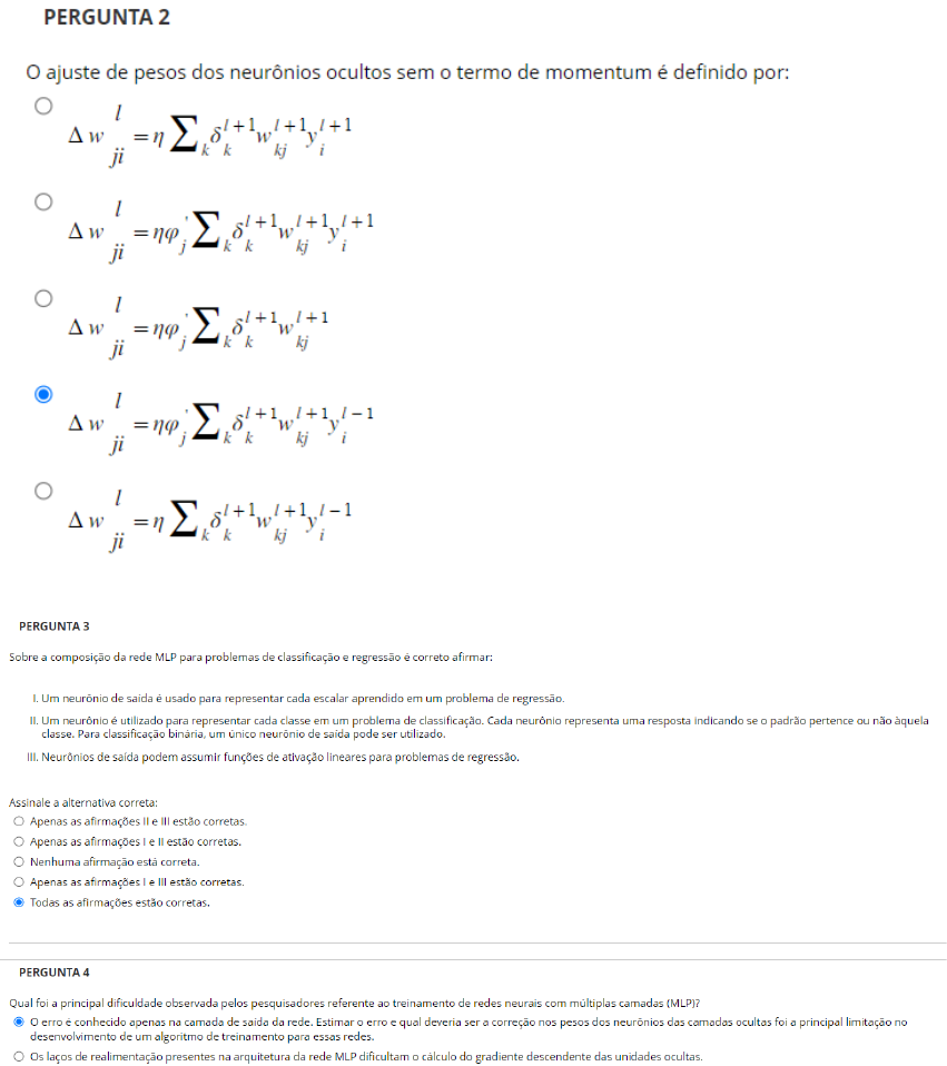 <p>PERGUNTA 2 ajuste de pesos dos neurônios ocultos sem termo de momentum é definido por: + 1 / + 1 + 1 ji + 1 W ji kj i + A w = ji +1 - 1 W = ji kj i W = n + kj +1 y i 1 ji PERGUNTA 3 Sobre a composição da rede MLP para problemas de classificação e regressão é correto I. Um neurônio de saída é usado para representar cada escalar aprendido em um problema de regressão. II. Um neurônio é utilizado para representar cada classe em um problema de classificação. Cada neurônio representa uma resposta indicando se padrão pertence ou não àquela classe. Para classificação binária, um único neurônio de saída pode ser utilizado. III. Neurônios de saída podem assumir funções de ativação lineares para problemas de regressão. Assinale a alternativa correta: Apenas as afirmações e III estão Apenas as afirmações II estão corretas. Nenhuma afirmação está correta. Apenas as afirmações III estão Todas as afirmações estão corretas. PERGUNTA 4 Qual foi a principal dificuldade observada pelos pesquisadores referente ao treinamento de redes neurais com múltiplas camadas (MLP)? o erro é conhecido apenas na camada de saída da rede. Estimar erro e qual deveria ser a correção nos pesos dos neurônios das camadas ocultas foi a principal limitação no desenvolvimento de um algoritmo de treinamento para essas redes. Os laços de realimentação presentes na arquitetura da rede MLP dificultam o cálculo do gradiente descendente das unidades ocultas.</p><p>PERGUNTA 5 A definição de uma rede MLP é um processo bastante empírico e demanda customização da topologia da rede (hiperparâmetros: número de camadas, número de neurônios por camadas, taxas de aprendizagem e momentum etc.) partir da sua resposta durante processo de treinamento (projeto do modelo). Quais das heurísticas abaixo podem ser utilizadas para melhorar desempenho do algoritmo de retropropagação? Maximização do conteúdo da informação, redução do conjunto de exemplos para treinamento, utilização de funções de ativação lineares e ajuste da taxa de aprendizagem conforme a densidade de entradas do neurônio. Redução do conjunto de exemplos para treinamento, escolha adequada da função de ativação, normalização dos dados e ajuste da taxa de aprendizagem conforme a densidade de entradas do neurônio. Maximização do conteúdo da informação, escolha adequada da função de ativação, normalização dos dados e ajuste da taxa de aprendizagem conforme a densidade de entradas do Escolha adequada da função de ativação, normalização dos dados e inclusão de laços de realimentação. Redução do conjunto de exemplos para treinamento, escolha adequada da função de ativação, normalização dos dados e aumento do valor da taxa de aprendizagem. PERGUNTA 6 Sobre os neurônios ocultos de uma rede MLP é correto afirmar: I. Utilizam funções de ativação lineares com objetivo de produzir eixos não correlacionados. II. A função de ativação deve ser contínua e diferenciável. III. São equivalentes aos neurônios da rede Perceptron e respondem de forma binária ao estímulo recebido. IV. Os neurônios ocultos têm por finalidade extrair características dos dados de entrada, permitindo aprendizado de funções complexas. Assinale alternativa correta: Apenas afirmação II está correta. Todas as afirmações estão As afirmações IV estão corretas. As afirmações II, III IV estão corretas. As afirmações I, II e III estão corretas. PERGUNTA 7 Sobre a arquitetura tradicional da rede MLP podemos afirmar: Todos os neurônios da rede possuem informação temporal e seu sinal de saída é computado a partir do sinal recebido e da previamente armazenada no nó. fluxo de sinal se propaga nos dois sentidos da rede, ou seja, padrão é apresentado na camada de entrada, se propaga até a camada de saída. Posteriormente, sinal de saída é propagado em sentido inverso até a camada de entrada e comparado ao sinal original. A rede é dita totalmente conectada, representando que todos os neurônios de uma dada camada são alimentados por todos os neurônios da camada anterior. Em contraste ao Perceptron, a rede MLP possui uma camada oculta com vários neurônios e uma camada de saída com um único</p>