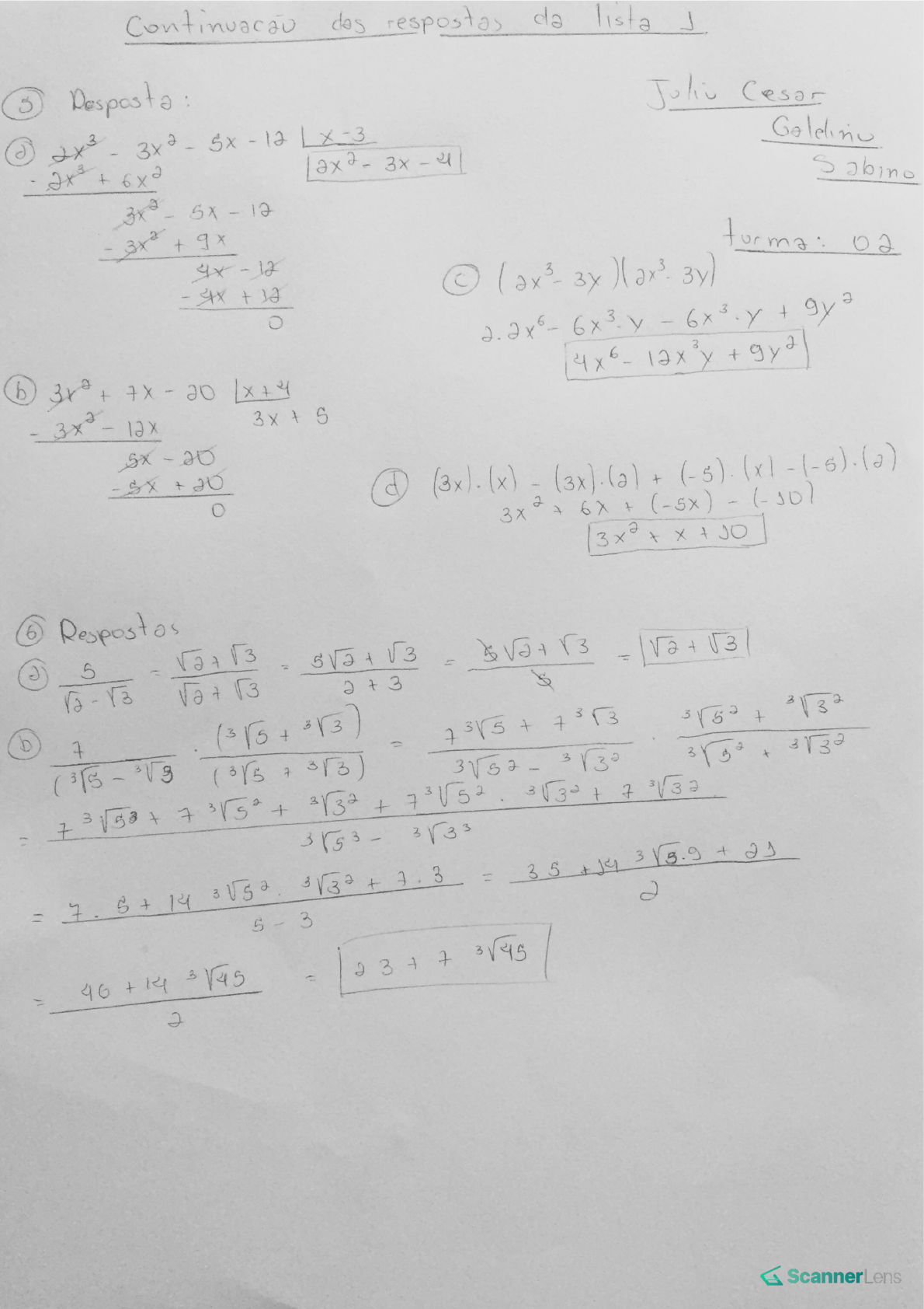 <p>Continuacau respostas da lista J Desposta : Julii Cesar 2x3 12 d Sabino 02 C + b 3x+5 d (x) - - 6 Respostos 5 = b 7 = = = = a 5-3 = = 2 Scanner Lens</p>