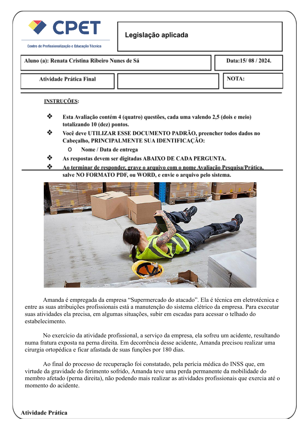 <p>Amanda é empregada da empresa “Supermercado do atacado”. Ela é técnica em eletrotécnica e</p><p>entre as suas atribuições profissionais está a manutenção do sistema elétrico da empresa. Para executar</p><p>suas atividades ela precisa, em algumas situações, subir em escadas para acessar o telhado do</p><p>estabelecimento.</p><p>No exercício da atividade profissional, a serviço da empresa, ela sofreu um acidente, resultando</p><p>numa fratura exposta na perna direita. Em decorrência desse acidente, Amanda precisou realizar uma</p><p>cirurgia ortopédica e ficar afastada de suas funções por 180 dias.</p><p>Ao final do processo de recuperação foi constatado, pela perícia médica do INSS que, em</p><p>virtude da gravidade do ferimento sofrido, Amanda teve uma perda permanente da mobilidade do</p><p>membro afetado (perna direita), não podendo mais realizar as atividades profissionais que exercia até o</p><p>momento do acidente.</p><p>Com base nas informações, acima fornecidas, responda:</p><p>1 – O acidente sofrido por Amanda pode ser classificado como um acidente de trabalho? Justifique sua</p><p>resposta e forneça a fundamentação legal.</p><p>Sim, de acordo com a Lei nº 8.231/91, em seu artigo 19, acidente do trabalho é o que ocorre</p><p>pelo exercício do trabalho a serviço de empresa ou de empregador doméstico ou pelo</p><p>exercício do trabalho dos segurados, provocando lesão corporal ou perturbação funcional</p><p>que cause a morte ou a perda ou redução, permanente ou temporária, da capacidade para o</p><p>trabalho.</p><p>2 - Qual benefício previdenciário Amanda recebeu após o 16º dia de afastamento? Justifique sua</p><p>resposta e forneça a fundamentação legal.</p><p>Com base no Artigo 60 da Lei nº 8.213/91 após o 16º dia de afastamento, Amanda terá</p><p>direito ao benefício previdenciário de auxílio-acidente. O auxílio-acidente é um benefício</p><p>temporário que é concedido ao trabalhador que sofreu um acidente de trabalho e teve sua</p><p>capacidade para o trabalho reduzida, mas não de forma total. O valor do auxílio-acidente é</p><p>equivalente a 50% do salário de benefício, que é calculado com base no salário de</p><p>contribuição do trabalhador. A duração do auxílio-acidente é de 2 anos, mas pode ser</p><p>prorrogado por mais 2 anos, se for necessário.</p><p>3 – Qual benefício previdenciário Amanda fará jus, em decorrência da perda parcial premente da</p><p>capacidade para o trabalho que desenvolvia? Justifique sua resposta e forneça a fundamentação legal.</p><p>Amanda terá direito ao benefício previdenciário de auxílio-doença, em decorrência da perda</p><p>parcial e iminente da capacidade para o trabalho que desenvolvia. O auxílio-doença é um</p><p>benefício concedido pelo Instituto Nacional do Seguro Social (INSS) aos segurados que</p><p>estão temporariamente incapacitados para o trabalho em decorrência de doença ou acidente.</p><p>A fundamentação legal para o auxílio-doença está prevista na Lei nº 8.213/91, que dispõe</p><p>sobre os Planos de Benefícios da Previdência Social. De acordo com o artigo 59 da referida</p><p>lei, o auxílio-doença será devido ao segurado que, havendo cumprido a carência exigida,</p><p>ficar incapacitado para o seu trabalho ou para a sua atividade habitual por mais de 15 dias</p><p>consecutivos.</p><p>Para comprovar a incapacidade, Amanda deverá passar por uma perícia médica realizada</p><p>pelo INSS. O médico perito avaliará a extensão da incapacidade e determinará o tempo de</p><p>afastamento necessário. Durante o período em que estiver recebendo o auxílio-doença,</p><p>Amanda deverá se submeter a reavaliações periódicas para verificar se ainda está</p><p>incapacitada para o trabalho.</p><p>É importante ressaltar que, para ter direito ao auxílio-doença, Amanda precisa ser segurada</p><p>da Previdência Social, ou seja, estar contribuindo regularmente para o INSS. Além disso, é</p><p>necessário cumprir a carência, que é o número mínimo de contribuições mensais exigidas</p><p>para ter direito ao benefício.</p><p>Portanto, com base na legislação previdenciária, Amanda terá direito ao benefício de</p><p>auxílio-doença em decorrência da perda parcial e iminente da capacidade para o trabalho</p><p>que desenvolvia.</p><p>.</p><p>4 – Quais as obrigações a empresa deverá ter, do ponto de vista legal, com a empregada acidentada</p><p>durante os primeiros quinze dias após o seu acidente e no seu retorno ao trabalho, após o acidente?</p><p>Justifique sua resposta e forneça a fundamentação legal.</p><p>Nos primeiros quinze dias após o acidente, a empresa é obrigada a arcar com o</p><p>pagamento do salário integral da empregada acidentada, conforme disposto no artigo 60 da</p><p>Lei nº 8.213/91. Essa atribuição é conhecida como Responsabilidade Civil do</p><p>Empregador. No retorno da empregada ao trabalho após o acidente, a empresa deve</p><p>proporcionar todas as condições necessárias para a reintegração da trabalhadora, levando</p><p>em consideração sua capacidade de trabalho após a lesão, conforme previsto no artigo 118</p><p>da Lei nº 8.213/91. Além disso, a empresa também deve se preocupar em promover ações</p><p>de prevenção de acidentes, conforme estabelece a Norma Regulamentadora NR-4 do</p><p>Ministério do Trabalho e Emprego.</p><p>OBS:</p><p>I - Para responder as questões você deve consultar a Lei 8.213/91 e a CLT.</p><p>II - Utilize suas palavras, NÃO COPIE TEXTOS da internet e de outras fontes, com exceção para</p><p>a citação de artigo, parágrafo, alínea, título etc. das Leis com as quais irá fundamentar suas respostas.</p>