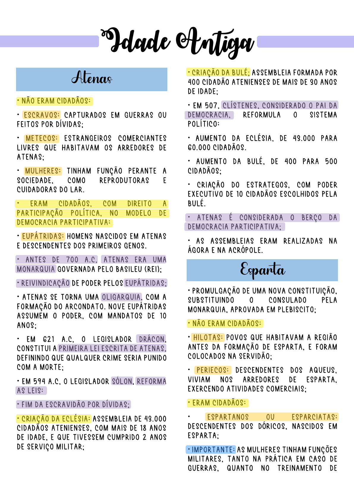 <p>Idade Antiga Atenas CRIAÇÃO DA ASSEMBLEIA FORMADA POR 400 CIDADÃO ATENIENSES DE MAIS DE 30 ANOS DE IDADE: NÃO ERAM CIDADÃOS: EM 507, CONSIDERADO 0 PAI DA ESCRAVOS: CAPTURADOS EM GUERRAS DEMOCRACIA, REFORMULA 0 SISTEMA FEITOS POR DÍVIDAS: POLÍTICO: METECOS: ESTRANGEIROS COMERCIANTES AUMENTO DA DE 43.000 PARA LIVRES QUE HABITAVAM ARREDORES DE 60.000 CIDADÃOS. AUMENTO DA BULÉ, DE 400 PARA 500 MULHERES: TINHAM FUNÇÃO PERANTE A SOCIEDADE, COMO REPRODUTORAS E . CRIAÇÃO DO COM PODER CUIDADORAS DO LAR. EXECUTIVO DE 10 CIDADÃOS ESCOLHIDOS PELA ERAM COM DIREITO A BULÉ. PARTICIPAÇÃO POLÍTICA, NO MODELO DE ATENAS É CONSIDERADA 0 BERÇO DA DEMOCRACIA PARTICIPATIVA: DEMOCRACIA HOMENS NASCIDOS EM ATENAS AS ASSEMBLEIAS ERAM REALIZADAS NA E DESCENDENTES DOS PRIMEIROS GENOS. ÁGORA E NA ANTES DE 700 A.C. ATENAS ERA UMA MONARQUIA GOVERNADA PELO BASILEU Esparta REIVINDICAÇÃO DE PODER PELOS PROMULGAÇÃO DE UMA NOVA CONSTITUIÇÃO. ATENAS SE TORNA UMA COM A SUBSTITUINDO 0 CONSULADO PELA FORMAÇÃO DO ARCONDATO. NOVE EUPÁTRIDAS MONARQUIA, APROVADA EM ASSUMEM 0 PODER, COM MANDATOS DE 10 ANOS; NÃO ERAM CIDADÃOS: EM 621 A.C. 0 LEGISLADOR HILOTAS: POVOS QUE HABITAVAM A REGIÃO A PRIMEIRA LEI ESCRITA DE ATENAS, ANTES DA FORMAÇÃO DE ESPARTA, E FORAM DEFININDO QUE QUALQUER CRIME SERIA PUNIDO COLOCADOS NA COM A PERIECOS: DESCENDENTES DOS EM 594 A.C. 0 LEGISLADOR REFORMA VIVIAM NOS ARREDORES DE ESPARTA, AS LEIS: EXERCENDO ATIVIDADES FIM DA ESCRAVIDÃO POR DÍVIDAS: ERAM CIDADÃOS: CRIAÇÃO DA ECLÉSIA: ASSEMBLEIA DE 43.000 ESPARTANOS ESPARCIATAS: ATENIENSES, COM MAIS DE 18 ANOS DESCENDENTES DOS NASCIDOS EM DE E QUE TIVESSEM CUMPRIDO 2 ANOS DE SERVIÇO IMPORTANTE: AS MULHERES TINHAM FUNÇÕES TANTO NA PRÁTICA EM CASO DE GUERRAS. QUANTO NO TREINAMENTO DE</p>