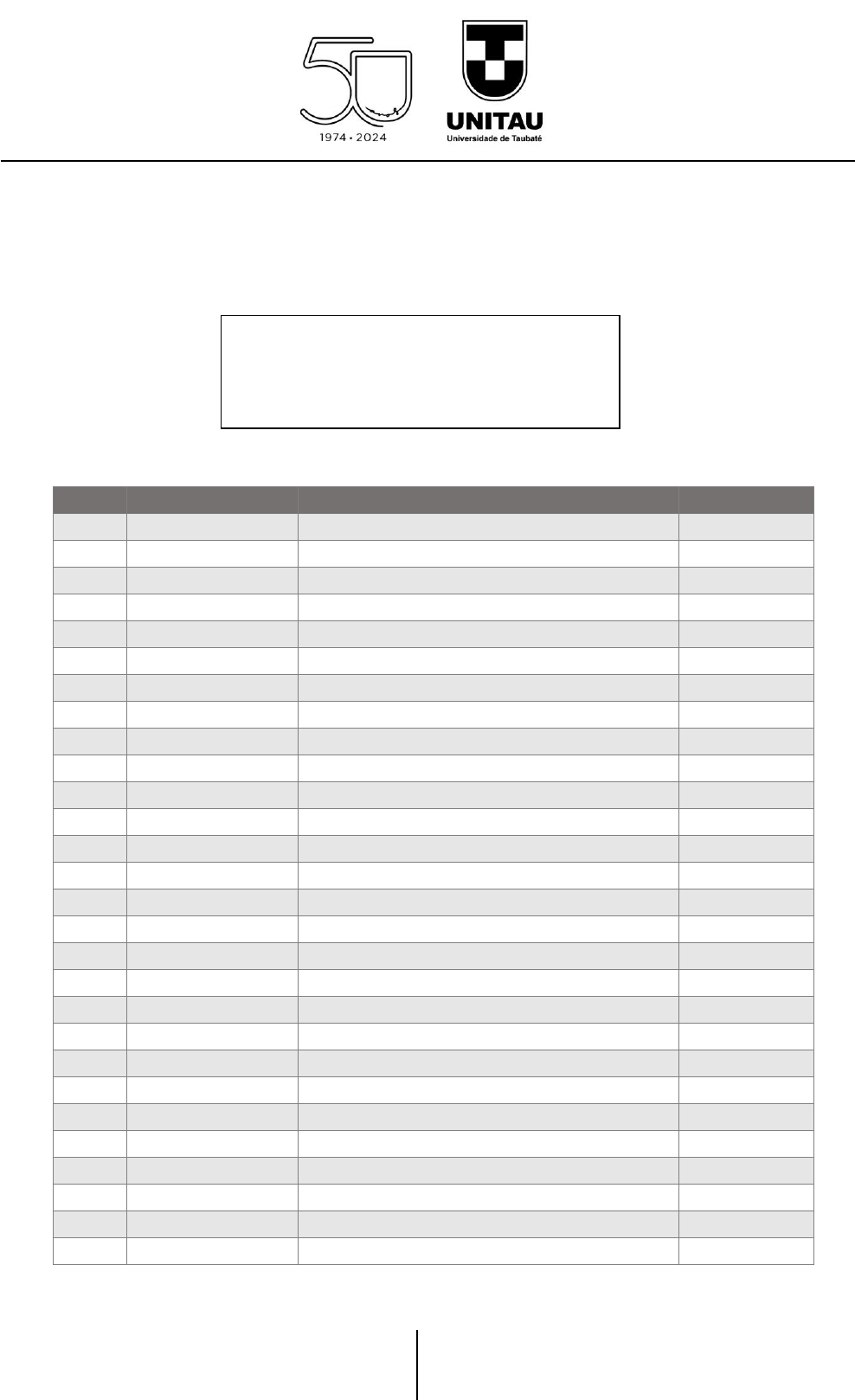 <p>Endereço: Rua Quatro de Março, 432 – Centro – Taubaté/SP</p><p>Telefone: (12) 3625-4100</p><p>E-mail: vest@unitau.br</p><p>Autarquia Municipal de Regime Especial</p><p>Reconhecida pelo Decreto Federal nº 78.924/76</p><p>Recredenciada pelo CEE-SP</p><p>CNPJ 45.176.153/0001-22</p><p>Classificação geral</p><p>Concurso: Vestibular de Inverno 2024 – Medicina</p><p>Medicina - Campus Taubaté</p><p>Turno: Integral</p><p>Posição Inscrição Nome do candidato Status</p><p>061 CAN-31130-UNITAU Felipe Monteiro De Andrade Aprovado</p><p>062 CAN-29495-UNITAU João Vitor Peluso Barbosa Guarizi Aprovado</p><p>063 CAN-30532-UNITAU Ana Laura De Castro Ribeiro Verardo Aprovado</p><p>064 CAN-29470-UNITAU Kevin Francisco Aprovado</p><p>065 CAN-29435-UNITAU Isabelle Oliveira Silva Aprovado</p><p>066 CAN-31279-UNITAU Maria Luísa Morato Reis Aprovado</p><p>067 CAN-29748-UNITAU Giovanna Rossi Chrispim Guedes Aprovado</p><p>068 CAN-31263-UNITAU Giovana Cristovam Barbosa Gomes Aprovado</p><p>069 CAN-29859-UNITAU Arthur Monteiro Prado Aprovado</p><p>070 CAN-30927-UNITAU Pedro Henrique Magalhães Barbosa Aprovado</p><p>071 CAN-30267-UNITAU Yara De Aguiar Venancio Costa Aprovado</p><p>072 CAN-29351-UNITAU Davi Antero Bitencourt Barreto Aprovado</p><p>073 CAN-29293-UNITAU Paola Martins Di Santis Aprovado</p><p>074 CAN-29730-UNITAU Luiza Fidelis Alcolea Aprovado</p><p>075 CAN-29572-UNITAU Tamires Rocha Guimarães Aprovado</p><p>076 CAN-30288-UNITAU Maria Fernanda Da Cunha Santos Aprovado</p><p>077 CAN-29547-UNITAU Sofia Lara Richter Aprovado</p><p>078 CAN-29407-UNITAU Gabriela Angelini Bravo De Souza Aprovado</p><p>079 CAN-29423-UNITAU João Manoel Hessel Almeida Aprovado</p><p>080 CAN-30966-UNITAU Pedro Macedo Aprovado</p><p>081 CAN-29309-UNITAU Maria Eduarda Carvalho Honório Aprovado</p><p>082 CAN-31261-UNITAU Mariana Leopoldo Vasconcellos Oliveira Aprovado</p><p>083 CAN-29440-UNITAU Laura De Oliveira Canova Aprovado</p><p>084 CAN-29489-UNITAU Nicolle Gonçalves Santos Resende Aprovado</p><p>085 CAN-29702-UNITAU Samuel Klauberg De Camargo Aprovado</p><p>086 CAN-30191-UNITAU Kamily Victória Araujo De Souza Aprovado</p><p>087 CAN-30717-UNITAU Giovana Elache Maciel Aprovado</p><p>088 CAN-31224-UNITAU Julia Alcantara De Andrade Aprovado</p><p>Endereço: Rua Quatro de Março, 432 – Centro – Taubaté/SP</p><p>Telefone: (12) 3625-4100</p><p>E-mail: vest@unitau.br</p><p>Autarquia Municipal de Regime Especial</p><p>Reconhecida pelo Decreto Federal nº 78.924/76</p><p>Recredenciada pelo CEE-SP</p><p>CNPJ 45.176.153/0001-22</p><p>089 CAN-31210-UNITAU Bárbara Eva Carvalho Oliveira Aprovado</p><p>090 CAN-30801-UNITAU Larissa Miranda Mörth Aprovado</p><p>091 CAN-30732-UNITAU Erika Megumi Honda Santos Aprovado</p><p>092 CAN-31045-UNITAU Ana Luiza Matias Ferreira Aprovado</p><p>093 CAN-29599-UNITAU Ana Clara Ruggiero Silva Aprovado</p><p>094 CAN-29783-UNITAU Manuela Fermi Consiglio Aprovado</p>