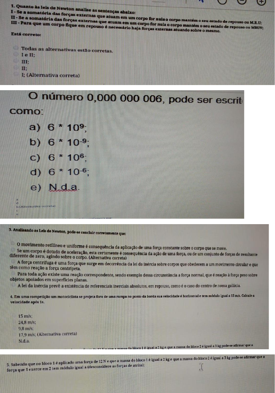 <p>1. Quanto às leis de Newton analise as sentenças abaixo: II Se Se a a somatória somatória das das forças forças externas que atuam em um corpo for nula o corpo mantém estado III Para que um corpo em externas repouso que é atuam necessário em um haja corpo forças for externas nula o corpo atuando mantém sobre o o seu o seu mesmo. estado de de repouso repouso ou ou M.R.U MRUV: Está correto: Todas as alternativas estão I e II: III: II; I: (Alternativa correta) número pode ser como: a) 6 * b) 6 * 10-9- 6 * d) 6 * 10-6- e) N.d.a. a a (Alternativa 3. Analisando as Leis de Newton, concluir corretamente que: o movimento retilíneo e uniforme é consequência da aplicação de uma força constante sobre corpo que se move. Se um corpo é dotado de esta certamente é consequência da ação de uma força, ou de um conjunto de forças de resultante diferente de zero, agindo sobre corpo. (Alternativa correta) A força centrifuga é uma força que surge em decorrência da lei da inércia sobre corpos que obedecem a um movimento circular e que têm como reação a força centripeta. Para toda ação existe uma reação sendo exemplo dessa circunstância a força normal, que é reação à força peso sobre objetos apolados em superfícies planas. A lei da inércia prevê a existência de referenciais inerciais em repouso, como é caso do centro de nossa galáxia. 4. Em uma competição um se projeta fora de uma rampa no ponto da borda sua velocidade horizontal e tem módulo 15 m/s. Calcule a velocidade após 1s. 15 m/s: 24,8 9,8 m/s: (Alternativa correta) N.d.a. bloco 1 a 2 kg e que a massa do bloco 2 Igual a 3 kg pode se afirmar que a Sabendo que no 1 é aplicado uma força de 12 N que a massa do atrito): bloco 1 igual a 2 kg que a massa do bloco 2 igual a 3 kg pode afirmar que a 5. força que 1 exerce em 2 tem módulo igual a (desconsidere as forças de</p><p>2 1 N: N: (Alternativa correta) 12 N: N.d.a. N: calibrado para medir a velocidade em metros por segundo ao de quilômetros por hora Sabendo que a velocidade 6. máxima Um permitida foi equivocadamente em uma via de 90 a velocidade máxima que veículo poderá atingir metros por segundo ultrapassar o limite de velocidade será 20 25 (Alternativa correta) 90 3.6 7. Uma força pode ser definida como uma grandeza: Constante: N.d.a. Vetorial: (Alternativa correta) Escalar: Os freios de um carro podem produzir uma desaceleração constante da ordem de Um motorista que está a 35 m/s avista um policial Assinale a alternativa que apresenta tempo mínimo necessário para que o carro atinja a velocidade máxima permitida da via (90km/h). N.d.a. (Alternativa correta) 10 9. Em um objeto de R kg são aplicadas duas forças F1 sabendo que o módulo das forças são respectivamente e que as forças possuem sentidos opostos. correto afirmar (desconsidere forças de atrito). O módulo da aceleração do objeto é igual a 0,25 m/s2: (Alternativa correta) módulo da aceleração do objeto é igual a -0,25 módulo da aceleração do objeto igual a 1.75 m/s2: N.d.a. da aceleração do objeto igual a 1.75 de entrega trajeto indicado figura abaixo determine do deslocamento</p><p>10. 2006) Um empregado do correio dirige um caminhão de entrega e faz o trajeto Indicado na figura determine módulo do (Circulo Indica a origem do movimento o vermelho ponto de km UNIMESTRE IBM Internet Explorer 7.1 km: 1.1 N.da 6.6 (Alternativa correta) Voce realizau unica tentativa Desenvolvido por Unimestre Sistemas de Gestão Educacional</p>