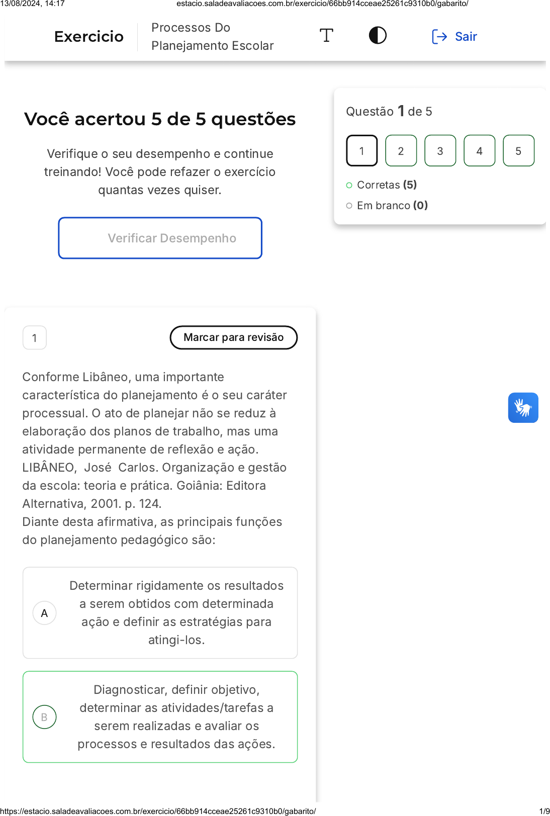 <p>Você acertou 5 de 5 questões</p><p>Verifique o seu desempenho e continue</p><p>treinando! Você pode refazer o exercício</p><p>quantas vezes quiser.</p><p>Verificar Desempenho</p><p>A</p><p>B</p><p>1 Marcar para revisão</p><p>Conforme Libâneo, uma importante</p><p>característica do planejamento é o seu caráter</p><p>processual. O ato de planejar não se reduz à</p><p>elaboração dos planos de trabalho, mas uma</p><p>atividade permanente de reflexão e ação.</p><p>LIBÂNEO, José Carlos. Organização e gestão</p><p>da escola: teoria e prática. Goiânia: Editora</p><p>Alternativa, 2001. p. 124.</p><p>Diante desta afirmativa, as principais funções</p><p>do planejamento pedagógico são:</p><p>Determinar rigidamente os resultados</p><p>a serem obtidos com determinada</p><p>ação e definir as estratégias para</p><p>atingi-los.</p><p>Diagnosticar, definir objetivo,</p><p>determinar as atividades/tarefas a</p><p>serem realizadas e avaliar os</p><p>processos e resultados das ações.</p><p>Questão 1 de 5</p><p>Corretas �5�</p><p>Em branco �0�</p><p>1 2 3 4 5</p><p>Exercicio</p><p>Processos Do</p><p>Planejamento Escolar</p><p>Sair</p><p>13/08/2024, 14:17 estacio.saladeavaliacoes.com.br/exercicio/66bb914cceae25261c9310b0/gabarito/</p><p>https://estacio.saladeavaliacoes.com.br/exercicio/66bb914cceae25261c9310b0/gabarito/ 1/9</p><p>C</p><p>D</p><p>E</p><p>Transpor os princípios de determinada</p><p>instituição para um plano de</p><p>atividades educacionais a serem</p><p>realizadas.</p><p>Estabelecer metas e objetivos</p><p>precisos para verificar se os</p><p>mesmos foram atingidos ao final do</p><p>processo educativo.</p><p>Construir justificativas teórico-</p><p>reflexivas para legitimar as ações a</p><p>serem realizadas nos processos</p><p>educativos.</p><p>Resposta correta</p><p>Parabéns, você selecionou a</p><p>alternativa correta. Confira o</p><p>gabarito comentado!</p><p>Gabarito Comentado</p><p>A alternativa correta é a B, que afirma que</p><p>as principais funções do planejamento</p><p>pedagógico são: diagnosticar, definir</p><p>objetivo, determinar as atividades/tarefas a</p><p>serem realizadas e avaliar os processos e</p><p>resultados das ações. Essas funções são</p><p>fundamentais para um planejamento</p><p>eficaz, pois permitem identificar as</p><p>necessidades e objetivos, planejar as</p><p>ações necessárias para atingir esses</p><p>objetivos e, por fim, avaliar se os</p><p>resultados foram alcançados. Essa</p><p>avaliação é crucial, pois permite ajustar o</p><p>planejamento conforme necessário,</p><p>tornando-o um processo contínuo de</p><p>reflexão e ação, conforme mencionado por</p><p>Libâneo. Além disso, cada etapa do</p><p>planejamento deve ser avaliada para</p><p>13/08/2024, 14:17 estacio.saladeavaliacoes.com.br/exercicio/66bb914cceae25261c9310b0/gabarito/</p><p>https://estacio.saladeavaliacoes.com.br/exercicio/66bb914cceae25261c9310b0/gabarito/ 2/9</p><p>A</p><p>B</p><p>C</p><p>garantir que os objetivos sejam alcançados</p><p>e fornecer informações suficientes para o</p><p>replanejamento, se necessário.</p><p>2 Marcar para revisão</p><p>A reflexão sobre o ato de planejar é um</p><p>procedimento fundamental ao exercício da</p><p>docência. Por isso podemos afirmar que o:</p><p>O planejamento deve ser entendido</p><p>como o ato de realizar o</p><p>preenchimento de formulários para o</p><p>controle do que será realizado pelo</p><p>professor em sala de aula.</p><p>A ação de planejar deve levar em</p><p>consideração as situações didáticas</p><p>que ocorrem em sala de aula como</p><p>importante suporte ao trabalho</p><p>docente.</p><p>O trabalho no âmbito educacional, o</p><p>planejamento, é uma atividade</p><p>inerente à função do professor sem</p><p>correlação com os demais segmentos</p><p>da comunidade escolar.</p><p>13/08/2024, 14:17 estacio.saladeavaliacoes.com.br/exercicio/66bb914cceae25261c9310b0/gabarito/</p><p>https://estacio.saladeavaliacoes.com.br/exercicio/66bb914cceae25261c9310b0/gabarito/ 3/9</p><p>D</p><p>E</p><p>O planejamento funciona como uma</p><p>bússola que indica a direção que o</p><p>professor deve seguir</p><p>independentemente do que está</p><p>previsto no Projeto Político</p><p>Pedagógico da instituição.</p><p>O professor, ao elaborar seu</p><p>planejamento, deve ter, como</p><p>referência, o livro didático adotado,</p><p>sem perder de vista o cumprimento de</p><p>todo o conteúdo previsto para a turma.</p><p>Resposta correta</p><p>Parabéns, você selecionou a</p><p>alternativa correta. Confira o</p><p>gabarito comentado!</p><p>Gabarito Comentado</p><p>A alternativa correta é a B, que afirma que</p><p>a ação de planejar deve levar em</p><p>consideração as situações didáticas que</p><p>ocorrem em sala de aula como importante</p><p>suporte ao trabalho docente. Isso significa</p><p>que o planejamento não é um ato isolado,</p><p>mas sim um processo que deve estar em</p><p>constante diálogo com a prática</p><p>pedagógica. O planejamento deve ser</p><p>flexível e adaptável, levando em conta as</p><p>necessidades, interesses e o contexto dos</p><p>alunos. Portanto, as situações didáticas</p><p>que ocorrem em sala de aula são</p><p>fundamentais para orientar e enriquecer o</p><p>planejamento do professor.</p><p>13/08/2024, 14:17 estacio.saladeavaliacoes.com.br/exercicio/66bb914cceae25261c9310b0/gabarito/</p><p>https://estacio.saladeavaliacoes.com.br/exercicio/66bb914cceae25261c9310b0/gabarito/ 4/9</p><p>A</p><p>B</p><p>C</p><p>D</p><p>E</p><p>3 Marcar para revisão</p><p>O planejamento é um processo amplo, incluindo</p><p>nele o modo de funcionamento escolar. Sobre</p><p>esta temática, analise as afirmativas abaixo:</p><p>I. As atividades meio devem contribuir para a</p><p>realização das atividades-fim</p><p>II. A logística da escola não faz parte do</p><p>planejamento e não deve ser considerada, pois</p><p>pertence ao aspecto administrativo.</p>