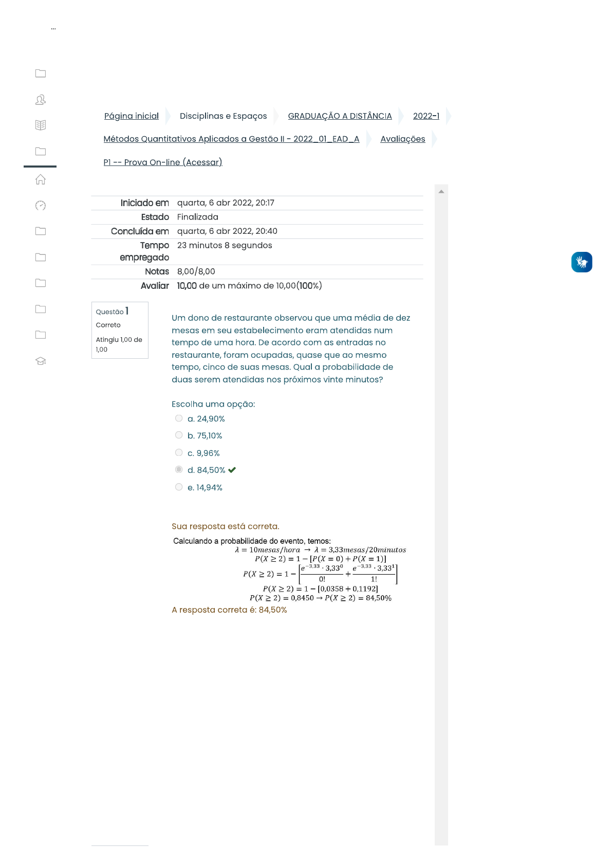 <p>Página inicial Disciplinas e Espaços GRADUAÇÃO A DISTÂNCIA 2022-1 Métodos Quantitativos Aplicados a Gestão - 2022 01 EAD A Avaliações P1 Prova On-line (Acessar) Iniciado em quarta, 6 abr 2022, 20:17 Estado Finalizada Concluída em quarta, 6 abr 2022, 20:40 Tempo 23 minutos 8 segundos empregado Notas 8,00/8,00 10,00 de um máximo de 10,00(100%) Questão 1 Um dono de restaurante observou que uma média de dez Correto mesas em seu estabelecimento eram atendidas num Atingiu 1,00 de tempo de uma hora. De acordo com as entradas no 1,00 restaurante, foram ocupadas, quase que ao mesmo tempo, cinco de suas mesas. Qual a probabilidade de duas serem atendidas nos próximos vinte minutos? Escolha uma opção: a. 24,90% b. 75,10% C. 9,96% d. 84,50% e. 14,94% Sua resposta está correta. Calculando a = 3,33mesas/20minutos + 0! 1! A resposta correta é: 84,50%</p><p>Questão 2 Numa empresa que envaza azeite de oliva, verificou-se Correto que 5% de seus frascos saem da linha de produção sem o Atingiu 1,00 de "bico dosador". Uma caixa possui doze frascos. Qual a 1,00 probabilidade de, num lote de quatro caixas, existirem quatro fracos sem o "bico dosador"? Escolha uma opção: a. 12,97% b. 9,06% C. 21,79% d. 90,94% e. 78,21% Sua resposta está correta. A resposta correta é: 21,79% Questão 3 Numa cidade do interior, no Estado do Rio de Janeiro, com Correto mais de habitantes, foi realizada uma pesquisa Atingiu 1,00 de com um grupo de pessoas, sobre qual dos problemas: 1,00 Desemprego, Transporte, Segurança ou Saúde era para eles o mais crítico, que gerou a seguinte tabela: Problema Transporte 10 Desemprego 19 Saúde 7 Segurança 4 Após o tratamento inicial dos dados, podemos afirmar que as Frequências Relativas para os valores pesquisados (na ordem apresentada na tabela) serão, respectivamente: Escolha uma opção: a. 25,0%; 50,0%; 15,0%; b. 50,0%; 25,0%; 15,0%; C. 25,0%; 47,5%; 17,5%; d. 10,0%; 15,0%; 50,0%; e. 10,0%; 17,5%; 47,5%; Sua resposta está correta. A resposta correta é: 25,0%; 47,5%; 17,5%; 10,0%.</p><p>Questão 4 Em observações anteriores, realizadas numa Correto concessionária, a troca de uma peça que controla o Atingiu 1,00 de sistema eletrônico de seus carros, apresenta 5% de 1,00 probabilidade de ser realizada durante o tempo de garantia dos mesmos. Foram vendidos no último feirão, realizado no sábado, 25 de seus carros. A probabilidade de, no máximo dois dos carros vendidos retornarem à concessionária para realizar troca da peça é de: Escolha uma opção: a. 27,74% b. 23,05% C. 12,71% d. 87,29% Sua resposta está correta. A resposta correta é: 87,29%</p><p>Questão 5 gráfico de setores abaixo, representa a produção Correto mensal de espécies de peixes de uma grande empresa Atingiu 1,00 de do ramo, localizada na Região dos Lagos, Litoral do rio de 1,00 Janeiro. Produção Tilápia (43%) Dourado (24%) Truta (21%) Salmão (?) Considerando que a produção de Salmão é de 120 g/mês, a produção total de pescado dessa empresa é de: Escolha uma opção: a. 1100kg/mês b. 1200kg/mês C. 100kg/mês d. 1000kg/mês Sua resposta está correta. Determinando o percentual de produção do Salmão, temos (Salmão) Considerando o percentual do Salmão com valor igual a 120kg/mês, podemos determinar o total assim: 12%---120kg/mês 100%---X x=12000/12 x=1000kg/m A resposta correta é: 1000kg/mês</p><p>Questão 6 Um mecânico, que trabalha numa Grande Correto Concessionária no interior do Rio de Janeiro, recebe um Atingiu 1,00 de acréscimo no salário pelo número de carros atendidos 1,00 por semana. Se forem atendidos de 5 a 10 carros ele receberá 15% de R$ 1500,00 e se forem atendidos de 10 a 20 carros ele receberá 18% de R$ 2000,00. Durante a segunda semana de trabalho do mês de Agosto de 2019, a esperança de acréscimo no salário deste mecânico é de: Escolha uma opção: a. R$ 585,00 b. R$ 660,00 C. R$ 360,00 d. R$ 460,00 e. R$ 225,00 Sua resposta está correta. A resposto correta é: R$ 585,00</p><p>Questão 7 Após realizar um estudo verificando a idade das pessoas Correto atendidas num consultório médico durante uma semana, Atingiu 1,00 de foi desenvolvida a seguinte Distribuição de Frequências. 1,00 53 Idade Pacientes i (anos) (Frequência) 1 0 10 24 20 9 30 12 430 40 6 540 50 3 650 60 6 Considerando a tabela desenvolvida, o Gráfico de Setores que melhor a representa, será: Escolha uma opção: 10% 5% 30% 10% 30% 15% 1 (30%) . 2 (15%) . 3 (30%) 4 (10%) . 5 (5%) 6 (10%) 10% 5% 40% 15% 20% 10% 1 (40%) 2 (10%) 3 (20%) 4 (15%) . 5 (5%) 6 (10%)</p><p>10% 5% 40% 10% 20% 15% 1 (40%) . 2 (15%) . 3 (20%) 4 (10%) . 5 (5%) . 6 (10%) 10% 5% 30% 20% 15% 20% 1 (30%) . 2 (15%) . 3 (20%) 4 (20%) . 5 (5%) 6 (10%) 10% 20% 15% 10% 25% 20% 1 (20%) . 2 (25%) . 3 (20%) 4 (10%) . 5 (15%) . 6 (10%) Sua resposta está correta.</p><p>A resposta correta é: 10% 5% 40% 10% 20% 15% 1 (40%) . 2 (15%) . 3 (20%) 4 (10%) . 6 (10%) Questão 8 Durante uma palestra online, realizada para os cursos de Correto Engenharia e de Análise de Sistemas (ADS), a palestrante Atingiu 1,00 de solicitou a participação dos ouvintes, dos quais, após o 1,00 questionamento, somente um deles se levantou para responde-la. Considerando que no auditório existiam 35 alunos de ADS, 40 de Engenharia e 15 deles faziam os dois cursos, qual a probabilidade do aluno que respondeu a palestrante ser do curso de ADS? Escolha uma opção: a. 55,25% O b. 58,33% C. 25,00% d. 33,33% e. 66,66% Sua resposta está correta. A resposta correta é: 58,33%</p>