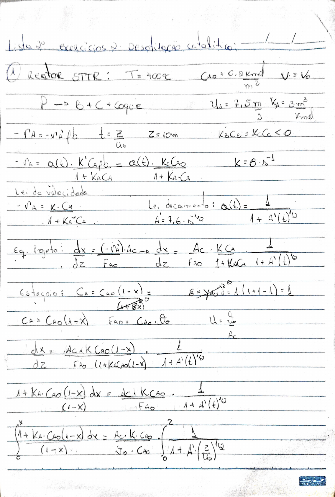 <p>/ / 1 STTR : T= 400°C + Us=7,5m - Z=10m us - SA= K'Capb - a(t) K.CAO 1 + KACA - 1 1+ Eq. dx = = 1 dz FAO dz 1+ KACA CA Do Ac L dz dx = 1 (1-x) FAO 2 dx = 1 -</p><p>/ / 10 1+3.02(1-x) dx = 1 dz = 7.5 = 1,6869 5 0,741 74,1% C</p><p>/ / 2 STTR Co = Eq dx - md J2 Ed= 15000cal 80 kgcd mol Lei do als = 2.5 m - K. alt) Us FAO = t de It Kd. a da a = = - = = - lne + = - lna = kd.t - D alt) = e PA = E= (1+8x) dx = e (1+x) 2 (1+x) dx K fb AcPto e MAD DOMINGOS</p><p>/ dx = (1-x) = 773K 0.189 exp = 773 673 k exp 673 773 15 dx = X-4 0,9118 X- L X= 0,4425 44,25%</p><p>/ / 3 W= 100 Kg -4 B = dm3 dx = 5 min lei t Lei do Kd a2 = It u 1 W Us a a L CA= x) Fao = dx = 1+ kd.w Us u W = said 4 Ent u l l = dw 4 u 1-X Do -5 = 0.3 kg In = 1.2322 1-X (1.2322) 1 = e = 70,8% 3,429</p><p>/ / de leite 4 1000 = R FAO : CAO = h I 1 tq 2.) dx = = 200 FAO - CA = CAO (1 at XA W dx - 200 dx = dw 5000 5000 XA = 200. XA = 5000 1 -XA 5000 100 a - D XA = 100a so Ca 1-XA 1- XA It 100a CAO 1-XA = 1000 = CA = 141000 CAO b total no inicial: XA 100.1 = 0.99 99%</p><p>C - do = 10 a -D = It a alt) = e XA = -0.5.12 = 0,198 19,8% a eq = 100a que e - 1+100a X1=0,984 Xs Xa Xo = X10 = 0.402 X=0,698 X7 = 0.751 X11 = 0,290 0.647 X12 = 0,198 69.8%</p>