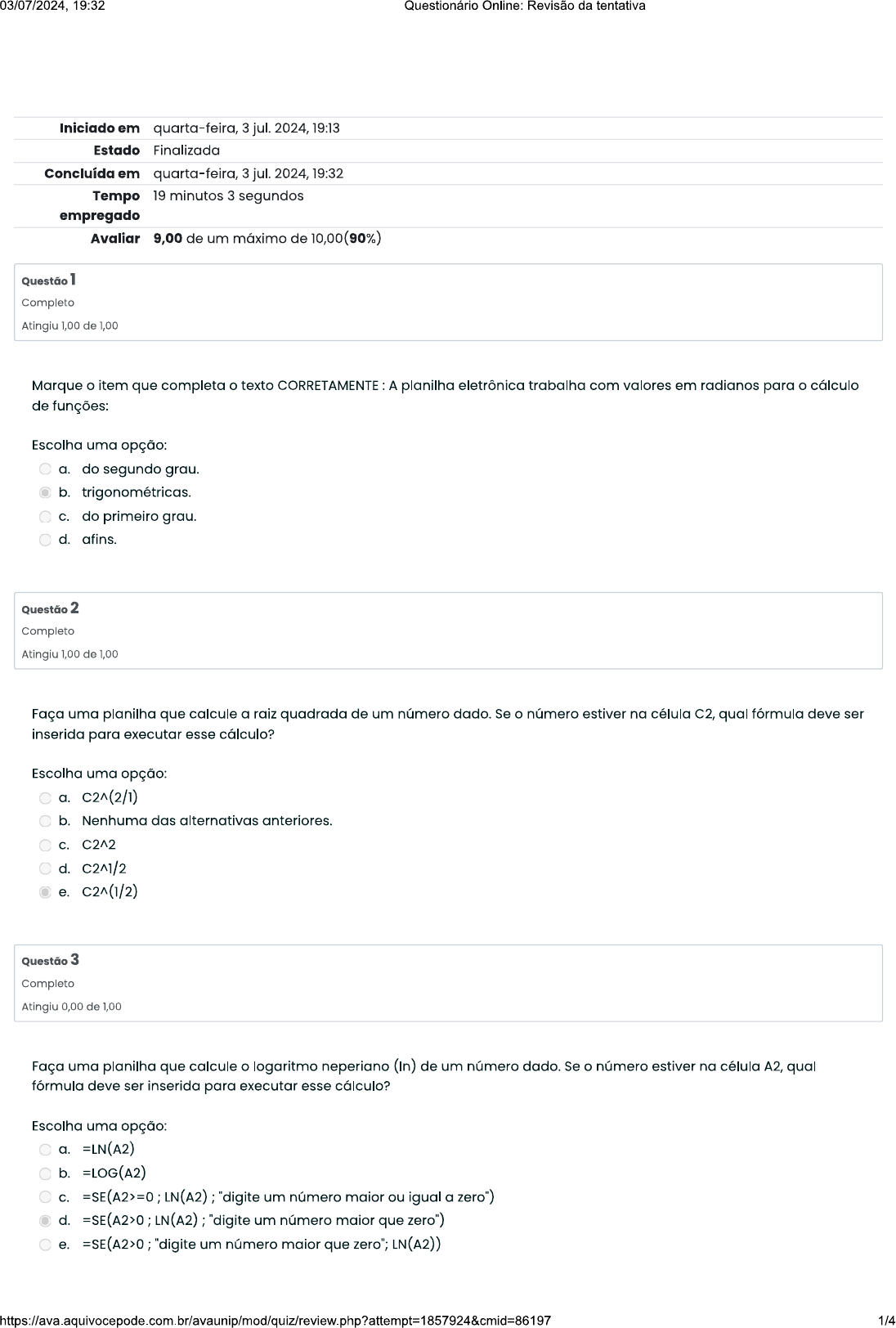 <p>03/07/2024, 19:32 Questionário Online: Revisão da tentativa Iniciado em quarta-feira, 3 jul. 2024, 19:13 Estado Concluída em quarta-feira, 3 jul. 2024, 19:32 Tempo 19 minutos 3 segundos empregado Avaliar 9,00 de um máximo de 10,00(90%) Questão 1 Completo Atingiu 1,00 de 1,00 Marque o item que completa o texto CORRETAMENTE : A planilho eletrônica trabalha com valores em radianos para cálculo de funções: Escolha uma opção: a. do segundo grau. b. trigonométricas. C. do primeiro grau. d. afins. Questão 2 Completo Atingiu 1,00 de 1,00 Faça uma planilha que calcule a raiz quadrada de um número dado. Se número estiver na célula C2, qual fórmula deve ser inserida para executar esse cálculo? Escolha uma opção: a. C2^(2/1) b. Nenhuma das alternativas anteriores. C. C2^2 d. C2^1/2 e. C2^(1/2) Questão 3 Completo Atingiu 0,00 de 1,00 Faça uma planilha que calcule o logaritmo neperiano (In) de um número dado. Se o número estiver na célula A2, qual fórmula deve ser inserida para executar esse cálculo? Escolha uma opção: a. =LN(A2) b. =LOG(A2) C. =SE(A2>=0 ; LN(A2) ; "digite um número maior ou igual a zero") d. =SE(A2>0 LN(A2) ; "digite um número maior que zero") e. =SE(A2>0 "digite um número maior que zero"; LN(A2)) 1/4</p><p>03/07/2024, 19:32 Questionário Online: Revisão da tentativa Questão 4 Completo Atingiu 1,00 de 1,00 Leia o texto a seguir e marque a opção CORRETA: São funções matemáticas periódicas de período 2TT, ou seja, a cada radianos, os valores obtidos no calculo das funções voltam a se repetir: Escolha uma opção: a. trigonométrica e quadrática b. tangente e seno C. seno e cosseno d. afim e simples Questão 5 Completo Atingiu 1,00 de 1,00 Marque a opção que preenche CORRETAMENTE a lacuna do texto apresentado na questão: Relações lineares são frequentes em Por exemplo, que afirma que a forca resultante F e igual ao produto da massa m de um corpo pela sua aceleração a (F=m.a), e uma relação linear. Escolha uma opção: a. a quarta lei de Newton b. a terceira lei de Newton C. a segunda lei de Newton d. a primeira lei de Newton Questão 6 Completo Atingiu 1,00 de 1,00 Qual o resultado numérico esperado para a expressão matemática (aproxime para uma casa decimal se necessário)? Escolha uma opção: a. 14,7 b. Nenhuma das alternativas. C. 19,4 d. 2405223 e. 5 2/4</p><p>03/07/2024, 19:32 Questionário Online: Revisão da tentativa Questão 7 Completo Atingiu 1,00 de 1,00 Elabore uma planilha eletrônica que calcule a área de um círculo para dado valor de raio R. A área A de um círculo é dada por: Acirculo = Qual o valor esperado para a área de um círculo de raio 7cm? Escolha uma opção: a. 706,8 b. 113,1 C. 21,9 d. 153,9 e. Nenhuma das alternativas anteriores. Questão 8 Completo Atingiu 1,00 de 1,00 Quando precisamos calcular o volume de sólidos simples, podemos pensar no produto da área da base: Escolha uma opção: a. pela largura b. pela pressão C. pela densidade d. pela altura Questão 9 Completo Atingiu 1,00 de 1,00 Marque a opção CORRETA: Escolha uma opção: a. coeficiente a da equação DO SEGUNDO GRAU nos dá informação sobre a concavidade da parábola: se a>0, a parábola tem concavidade para cima, porém se a<0, a concavidade é para b. coeficiente a da equação DO SEGUNDO GRAU nos da informação sobre a concavidade da parábola: se a>0, a parábola tem concavidade para baixo, porem se a<0, a concavidade é para baixo. C. coeficiente a da equação DO PRIMEIRO GRAU nos da informação sobre a concavidade da se a>0, a parábola tem concavidade para baixo, porem se a<0, a concavidade é para baixo. d. coeficiente a da equação DO SEGUNDO GRAU nos da informação sobre a concavidade da parábola: se a>0, a parábola tem concavidade para cima, porem se a<0, a concavidade é para cima. 3/4</p><p>03/07/2024, 19:32 Questionário Online: Revisão da tentativa Questão 10 Completo Atingiu 1,00 de 1,00 Faça uma planilha que, dados três números a, b e C, calcule a soma deles se a>b. Caso contrário, calcule produto dos três números. Qual a saída para a=4, b=2, c=3? Escolha uma opção: a. 24 b. Nenhuma das alternativas anteriores. C. 9 d. 4 e. 2 Sobre nós Nossa visão de futuro e nossos objetivos Aqui são sintetizados na missão de formar cidadão através da educação. voce Pode Contatos Download Moodle 0800.725.0045 GET IT ON WhatsApp: (85) 3535.5819 Google Play www.aquivocepode.com.br Download on the App Store Copyright Grupo Aqui Você Pode - Todos os direitos reservados. Política de privacidade e Termos de uso 4/4</p>