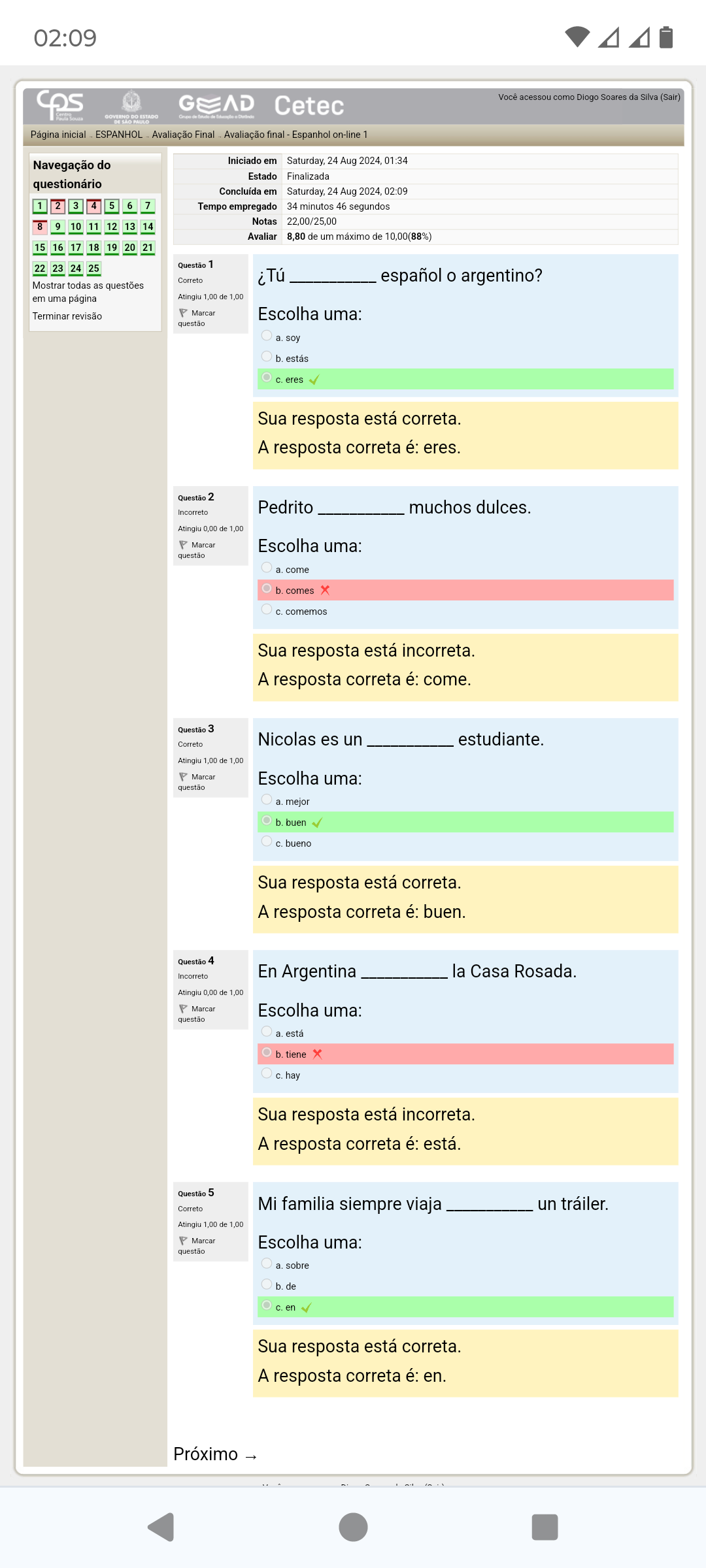 <p>02:09 GEAD Cetec Você acessou como Diogo Soares da Silva (Sair) ESTADO Página inicial ESPANHOL Avaliação Final Avaliação final Espanhol on-line 1 Navegação do Iniciado em Saturday, 24 Aug 2024, 01:34 Estado Finalizada questionário Concluída em Saturday, 24 Aug 2024, 02:09 1 2 3 4 5 6 7 Tempo empregado 34 minutos 46 segundos Notas 22.00/25.00 8 9 10 11 12 13 14 Avaliar 8,80 de um máximo de 10,00(88%) 15 16 17 18 19 20 21 22 23 24 25 Questão 1 Correto ¿Tú español o argentino? todas as questões em uma página Atingiu Terminar revisão Marcar Escolha uma: questão soy b. estás eres Sua resposta está correta. A resposta correta é: eres. Questão 2 Incorreto Pedrito muchos dulces. Atingiu 0.00 de 1.00 Marcar Escolha uma: questão a. come b. comes comemos Sua resposta está incorreta. A resposta correta é: come. Questão 3 Correto Nicolas es un estudiante. Atingiu 1,00 de 1,00 Marcar Escolha uma: questão mejor b. buen bueno Sua resposta está correta. A resposta correta é: buen. Questão 4 Incorreto En Argentina la Casa Rosada. Atingiu 0.00 1.00 Marcar Escolha uma: questão está b. tiene hay Sua resposta está incorreta. A resposta correta é: Questão 5 Correto Mi familia siempre viaja un tráiler. 1.00 de 1,00 P Marcar Escolha uma: questão a. sobre de Sua resposta está correta. A resposta correta é: en. Próximo</p>