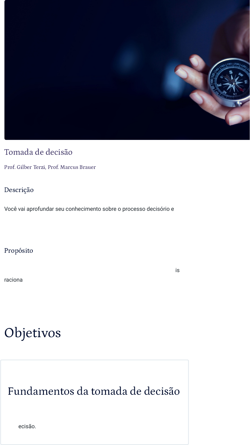 <p>Tomada de decisão</p><p>Prof. Gilber Terzi, Prof. Marcus Brauer</p><p>Descrição</p><p>Você vai aprofundar seu conhecimento sobre o processo decisório e</p><p>entender as estratégias e ferramentas que podem ser utilizadas para</p><p>melhorar suas decisões.</p><p>Propósito</p><p>Capacitar os futuros profissionais de gestão a tomarem decisões mais</p><p>racionais e menos enviesadas, de forma ética, criativa, ágil e lógica, para</p><p>desenvolverem bons hábitos e serem eficazes na resolução de</p><p>problemas.</p><p>Objetivos</p><p>Módulo 1</p><p>Fundamentos da tomada de decisão</p><p>Reconhecer as definições, os modelos e as ferramentas de tomada</p><p>de decisão.</p><p>Módulo 2</p><p>Formas alternativas para tomada de</p><p>decisão</p><p>Reconhecer formas diferentes na tomada de decisão pessoal.</p><p>Módulo 3</p><p>Melhorando a tomada de decisão</p><p>Reconhecer estratégias e técnicas para melhores decisões e</p><p>resolução de problemas.</p><p>Introdução</p><p>Estimativas publicadas no The Wall Street Journal afirmam que</p><p>uma pessoa toma em média 35 mil decisões diárias. Decisões</p><p>podem ser simples, como qual meia vestir, mas também</p><p>complexas, como qual pós-graduação cursar. A maioria de</p><p>nossas decisões é subconsciente, mas isso não significa que</p><p>elas não podem ser melhoradas.</p><p>Ao estudar o processo decisório, você ganhará uma</p><p>compreensão mais aprofundada não apenas das suas decisões,</p><p>mas também das decisões de outros. Neste contexto,</p><p>examinaremos obras de alguns dos autores mais influentes. Com</p><p>sólidos conhecimentos sobre hábitos, tomada de decisão, vieses,</p><p>e resolução de problemas, provavelmente suas decisões serão</p><p>mais rápidas, lógicas, éticas e criativas.</p><p>Vamos começar!</p><p></p><p>Material para download</p><p>Clique no botão abaixo para fazer o download do</p><p>conteúdo completo em formato PDF.</p><p>Download material</p><p>1 - Fundamentos da tomada de decisão</p><p>Ao �nal deste módulo, você será capaz de reconhecer as de�nições, os</p><p>modelos e as ferramentas de tomada de decisão.</p><p>O que é tomada de decisão?</p><p>Assista ao vídeo e explore o conceito de tomada de decisão. Conheça</p><p>os tipos de tomada de decisão programada e não programada,</p><p>juntamente com suas respectivas características.</p><p>javascript:CriaPDF()</p><p>Moneyball, livro escrito por Michael Lewis em 2003 e posteriormente</p><p>adaptado para o cinema em 2011, narra a trajetória de Billy Beane,</p><p>gerente geral do time Oakland Athletics. Beane revolucionou o beisebol</p><p>ao questionar o excesso de confiança na intuição dos profissionais do</p><p>esporte. Ao longo de quatro anos como líder da equipe, Beane conduziu</p><p>o Oakland Athletics do 11º para o 1º lugar entre os 14 times da liga em</p><p>2002, alcançando o segundo melhor recorde na Major League Baseball e</p><p>uma das duas melhores folhas de pagamento em toda a Liga</p><p>Americana.</p><p>Cartaz do filme Moneyball</p><p>Tal sucesso foi alcançado porque Beane, ajudado por Paul Pedrosa,</p><p>recém-formado em economia em Havard, percebeu que os executivos</p><p>do beisebol faziam suas avaliações utilizando uma intuição limitada e</p><p>sistematicamente enviesada, que afetava inclusive a administração de</p><p>pessoal, gerando enormes ineficiências. Os dirigentes</p><p>supergeneralizavam a partir de suas experiências pessoais, eram</p><p>extremamente influenciados pelo desempenho recente dos jogadores e</p><p>apenas pelo que viam com seus próprios olhos, embora houvesse</p><p>registros de vários anos dos atletas que forneciam dados muito</p><p>melhores.</p><p>Beane e Pedrosa provaram que as estatísticas superavam o</p><p>desempenho dos experts e, depois de mais de 100 anos prevalecendo a</p><p>intuição na tomada de decisão, finalmente as equipes passaram a</p><p>substituir seus experts por “nerds” que sabem lidar com equações de</p><p>regressão e análises estatísticas para melhorarem seus julgamentos.</p><p>O termo julgamento faz referência aos componentes requeridos durante</p><p>a tomada de decisões. Para compreendê-lo plenamente, é necessário</p><p>primeiramente reconhecer os elementos cognitivos envolvidos no</p><p>processo decisório. Considere as seguintes situações de decisão.</p><p>Vamos lá!</p><p>Você está terminando seu mestrado; e agora, o que fazer? Concurso</p><p>público, carreira acadêmica ou área privada? Essa situação até virou um</p><p>caso de ensino de título Terminei o mestrado. E agora?, escrito pela</p><p>renomada professora Lúcia Barbosa.</p><p>Se você é o diretor de uma empresa que presta serviços especializados</p><p>e precisa modernizar seus sistemas e implementar tecnologias de</p><p>informação e comunicação (TIC) para aumentar a eficiência e</p><p>competitividade no mercado, quais sistemas de TIC deveria</p><p>implementar?</p><p>Como proprietário de uma loja de varejo que vem fazendo muito</p><p>sucesso e com clientela crescente, você vê necessidade de expandir seu</p><p>negócio, comprando ou alugando lojas adjacentes, abrindo novas lojas</p><p>em outros locais ou construindo um novo andar em seu</p><p>estabelecimento atual. Qual opção de expansão seria a mais adequada?</p><p>Se você é funcionário público, juiz ou advogado, no Brasil, precisa tomar</p><p>decisões éticas e justas em conformidade jurídica no país.</p><p>O que essas situações têm em comum?</p><p>O que essas situações compartilham é o fato de que cada uma propõe</p><p>um problema a ser resolvido. Porém, cada problema geralmente possui</p><p>várias alternativas de solução. Se a solução para cada uma dessas</p><p>questões fosse única, você não teria alternativas para escolher, e, se não</p><p>tem alternativas, não tem uma decisão a tomar.</p><p>Entretanto, se há alternativas, o que frequenteme