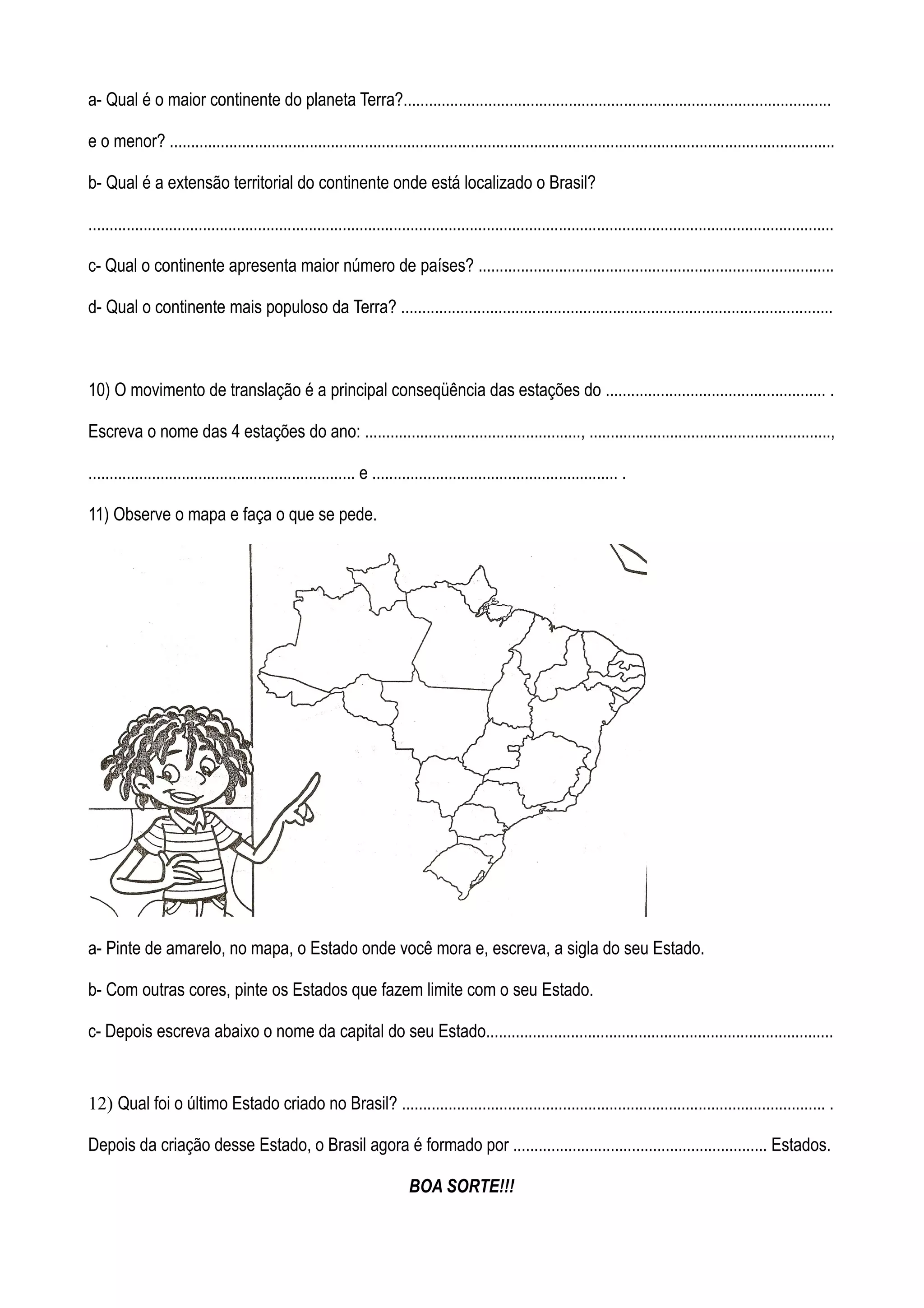 <p>a- Qual é o maior continente do planeta Terra? e o menor? b- Qual é a extensão territorial do continente onde está localizado o Brasil? C- Qual o continente apresenta maior número de países? d- Qual o continente mais populoso da Terra? 10) O movimento de translação é a principal das estações do Escreva nome das 4 estações do ano: e 11) Observe o mapa e faça o que se pede. a- Pinte de amarelo, no mapa, o Estado onde você mora e, escreva, a sigla do seu Estado. b- Com outras cores, pinte os Estados que fazem limite com o seu Estado. C- Depois escreva abaixo o nome da capital do seu Estado 12) Qual foi o último Estado criado no Brasil? Depois da criação desse Estado, o Brasil agora é formado por Estados. BOA SORTE!!!</p>