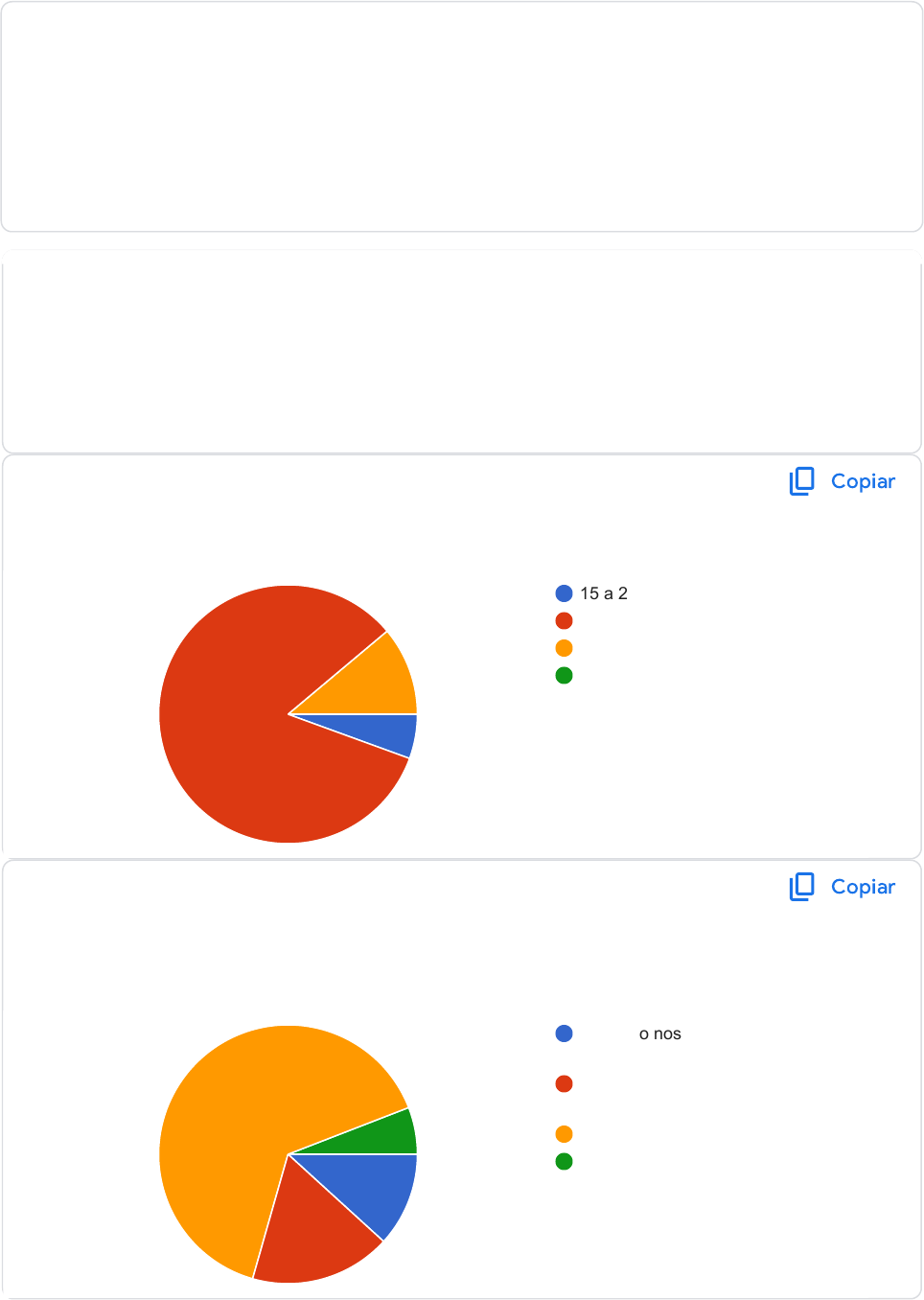 <p>1. Qual a sua idade?</p><p>18 respostas</p><p>2. Na sua opinião, qual o principal beneficio da prática de exercícios</p><p>físico?</p><p>17 respostas</p><p>A in�uencia da pandemia de COVID-19 na</p><p>pratica de exercícios físico e sua relação</p><p>com saúde emocional/mental</p><p>18 respostas</p><p>Copiar</p><p>15 a 20</p><p>21 a 40</p><p>41 a 64</p><p>65 +11,1%</p><p>83,3%</p><p>Copiar</p><p>Redução nos sintomas da</p><p>ansiedade</p><p>Controle da obesidade/</p><p>doenças cronicas</p><p>Aumento do bem estar físico</p><p>Melhora da saúde ,</p><p>condicionamento físico boa</p><p>alimentação bons hábitos e</p><p>uma boa terapia</p><p>11,8%</p><p>64,7%</p><p>17,6%</p><p>20/08/2024, 16:30 A influencia da pandemia de COVID-19 na pratica de exercícios físico e sua relação com saúde emocional/mental</p><p>https://docs.google.com/forms/d/1Ry2tV-N9hyk1ux7A8F-yalu0PF3CREvEHuPCCnoe6LY/viewanalytics 1/6</p><p>3. Durante a pandemia você ficou em "Lockdown" ou seguiu sua rotina</p><p>normal?</p><p>18 respostas</p><p>4. Antes da pandemia, quantas horas você estudava/ trabalhava por</p><p>dia?</p><p>18 respostas</p><p>5. Antes da pandemia, quantos dias por semana praticava exercícios</p><p>físico?</p><p>18 respostas</p><p>Copiar</p><p>Sim</p><p>Não</p><p>22,2%</p><p>77,8%</p><p>Copiar</p><p>4 h</p><p>6 h</p><p>8 h</p><p>10 h +</p><p>11,1%</p><p>22,2%</p><p>38,9%</p><p>27,8%</p><p>Copiar</p><p>1</p><p>2</p><p>3</p><p>4</p><p>5 ou mais</p><p>Não praticava</p><p>11,1%</p><p>27,8%</p><p>27,8%</p><p>27,8%</p><p>20/08/2024, 16:30 A influencia da pandemia de COVID-19 na pratica de exercícios físico e sua relação com saúde emocional/mental</p><p>https://docs.google.com/forms/d/1Ry2tV-N9hyk1ux7A8F-yalu0PF3CREvEHuPCCnoe6LY/viewanalytics 2/6</p><p>6. Durante a pandemia, quantas horas você estudava/ trabalhava por</p><p>dia?</p><p>18 respostas</p><p>7. Durante a pandemia, quantos dias por semana continuou praticando</p><p>exercícios físico?</p><p>18 respostas</p><p>8. Qual era a sua maior dificuldade para a pratica de exercícios físico</p><p>durante a pandemia?</p><p>17 respostas</p><p>Copiar</p><p>4 h</p><p>6 h</p><p>8 h</p><p>10 h ou mais</p><p>22,2%</p><p>11,1%</p><p>61,1%</p><p>Copiar</p><p>1</p><p>2</p><p>3</p><p>4</p><p>5 ou mais</p><p>Não praticava</p><p>Zero</p><p>Nenhum</p><p>11,1%</p><p>38,9%</p><p>22,2%</p><p>Copiar</p><p>Motivação</p><p>Medo</p><p>Preguiça</p><p>Falta de orientação</p><p>Academias fechadas</p><p>SEGUI NORMALMENTE</p><p>SEGUINDO OS</p><p>PROTOCOLOS</p><p>17,6%</p><p>23,5%</p><p>41,2%</p><p>20/08/2024, 16:30 A influencia da pandemia de COVID-19 na pratica de exercícios físico e sua relação com saúde emocional/mental</p><p>https://docs.google.com/forms/d/1Ry2tV-N9hyk1ux7A8F-yalu0PF3CREvEHuPCCnoe6LY/viewanalytics 3/6</p><p>9. Hoje em dia, quantas horas você estuda/ trabalha por dia?</p><p>18 respostas</p><p>10. Hoje em dia, quantos dias na semana você pratica exercícios físico?</p><p>18 respostas</p><p>11. Como era seu estado emocional antes da pandemia?</p><p>18 respostas</p><p>Copiar</p><p>4 h</p><p>6 h</p><p>8 h</p><p>10 h ou mais</p><p>Estou afastado</p><p>11,1%</p><p>11,1%</p><p>27,8%</p><p>44,4%</p><p>Copiar</p><p>1</p><p>2</p><p>3</p><p>4</p><p>5 ou mais</p><p>Nenhum</p><p>11,1%</p><p>38,9%</p><p>11,1%</p><p>27,8%</p><p>Copiar</p><p>Bom</p><p>Regular</p><p>Ruim</p><p>Péssimo</p><p>11,1%</p><p>83,3%</p><p>20/08/2024, 16:30 A influencia da pandemia de COVID-19 na pratica de exercícios físico e sua relação com saúde emocional/mental</p><p>https://docs.google.com/forms/d/1Ry2tV-N9hyk1ux7A8F-yalu0PF3CREvEHuPCCnoe6LY/viewanalytics 4/6</p><p>12. Como ficou seu estado emocional durante a pandemia?</p><p>18 respostas</p><p>13. Como ficou seu estado emocional após a pandemia?</p><p>18 respostas</p><p>14. Durante ou após pandemia, você precisou de alguma assistência</p><p>psicológica ou psiquiátrica?</p><p>18 respostas</p><p>Este conteúdo não foi criado nem aprovado pelo Google. Denunciar abuso - Termos de Serviço - Política de</p><p>Privacidade</p><p>Copiar</p><p>Bom</p><p>Regular</p><p>Ruim</p><p>Péssimo</p><p>11,1%</p><p>27,8%</p><p>55,6%</p><p>Copiar</p><p>Bom</p><p>Regular</p><p>Ruim</p><p>Péssimo</p><p>16,7%</p><p>11,1%</p><p>11,1%</p><p>61,1%</p><p>Copiar</p><p>Sim</p><p>Não</p><p>72,2%</p><p>27,8%</p><p>Formulários</p><p>20/08/2024, 16:30 A influencia da pandemia de COVID-19 na pratica de exercícios físico e sua relação com saúde emocional/mental</p><p>https://docs.google.com/forms/d/1Ry2tV-N9hyk1ux7A8F-yalu0PF3CREvEHuPCCnoe6LY/viewanalytics 5/6</p><p>https://docs.google.com/forms/d/1Ry2tV-N9hyk1ux7A8F-yalu0PF3CREvEHuPCCnoe6LY/reportabuse</p><p>https://policies.google.com/terms</p><p>https://policies.google.com/privacy</p><p>https://policies.google.com/privacy</p><p>https://www.google.com/forms/about/?utm_source=product&utm_medium=forms_logo&utm_campaign=forms</p><p>https://www.google.com/forms/about/?utm_source=product&utm_medium=forms_logo&utm_campaign=forms</p><p>https://www.google.com/forms/about/?utm_source=product&utm_medium=forms_logo&utm_campaign=forms</p><p>20/08/2024, 16:30 A influencia da pandemia de COVID-19 na pratica de exercícios físico e sua relação com saúde emocional/mental</p><p>https://docs.google.com/forms/d/1Ry2tV-N9hyk1ux7A8F-yalu0PF3CREvEHuPCCnoe6LY/viewanalytics 6/6</p>