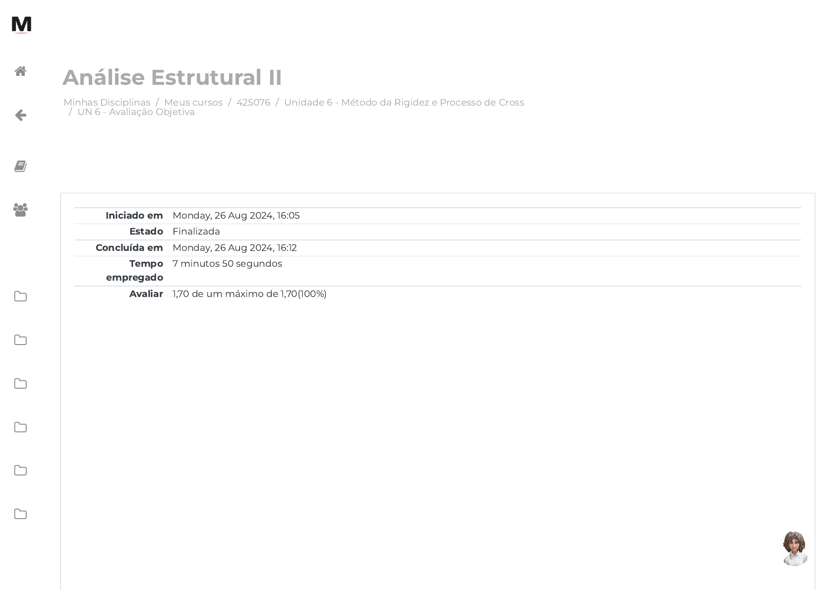 <p>Minhas Disciplinas / Meus cursos / 425076 / Unidade 6 - Método da Rigidez e Processo de Cross</p><p>/ UN 6 - Avaliação Objetiva</p><p>Análise Estrutural II</p><p>Iniciado em Monday, 26 Aug 2024, 16:05</p><p>Estado Finalizada</p><p>Concluída em Monday, 26 Aug 2024, 16:12</p><p>Tempo</p><p>empregado</p><p>7 minutos 50 segundos</p><p>Avaliar 1,70 de um máximo de 1,70(100%)</p><p></p><p></p><p></p><p></p><p></p><p></p><p></p><p></p><p></p><p></p><p></p><p>https://avap.multivix.edu.br/my/</p><p>https://avap.multivix.edu.br/course/view.php?id=29701</p><p>https://avap.multivix.edu.br/course/view.php?id=29701§ion=7</p><p>https://avap.multivix.edu.br/mod/quiz/view.php?id=1721637</p><p>https://avap.multivix.edu.br/my/</p><p>https://avap.multivix.edu.br/course/view.php?id=29701</p><p>https://avap.multivix.edu.br/user/index.php?id=29701</p><p>https://avap.multivix.edu.br/course/view.php?id=29701§ion=1</p><p>https://avap.multivix.edu.br/course/view.php?id=29701§ion=2</p><p>https://avap.multivix.edu.br/course/view.php?id=29701§ion=3</p><p>https://avap.multivix.edu.br/course/view.php?id=29701§ion=4</p><p>https://avap.multivix.edu.br/course/view.php?id=29701§ion=5</p><p>https://avap.multivix.edu.br/course/view.php?id=29701§ion=6</p><p>https://avap.multivix.edu.br/course/view.php?id=29701§ion=7</p><p>https://avap.multivix.edu.br/course/view.php?id=29701§ion=8</p><p>https://avap.multivix.edu.br/</p><p>https://avap.multivix.edu.br/</p><p>https://avap.multivix.edu.br/</p><p>https://avap.multivix.edu.br/</p><p>https://avap.multivix.edu.br/</p><p>https://avap.multivix.edu.br/</p><p>Questão 1</p><p>Correto</p><p>Atingiu 0,34</p><p>de 0,34</p><p>Questão 2</p><p>Correto</p><p>Atingiu 0,34</p><p>de 0,34</p><p>O processo de Cross e o método da rigidez são utilizados na análise de estruturas lineares na engenharia civil.</p><p>Sobre esses métodos, é correto a�rmar que:</p><p>Escolha uma opção:</p><p>a. ambos os métodos usam a mesma matriz de rigidez global, mas o processo de Cross é mais e�ciente para análises de</p><p>estruturas com muitas condições de contorno diferentes.</p><p>b. o processo de Cross é um método de análise estática, enquanto o método da rigidez é um método de análise dinâmica.</p><p>c. o processo de Cross é mais e�ciente que o método da rigidez para análises de estruturas com elementos não lineares.</p><p>d. o método da rigidez é mais preciso que o processo de Cross para cálculos de deslocamentos nodais em estruturas com</p><p>múltiplos graus de liberdade.</p><p></p><p>e. o método da rigidez é um método iterativo, enquanto o processo de Cross é um método direto.</p><p>O processo de Cross é uma metodologia colaborativa que pode ser aplicada em diversas áreas do conhecimento, incluindo a</p><p>engenharia civil. Essa abordagem busca integrar diferentes perspectivas e experiências para gerar soluções inovadoras para</p><p>problemas complexos.</p><p>Com base nesse contexto, assinale a alternativa correta sobre as características do processo de Cross.</p><p>Escolha uma opção:</p><p>a. Requer um ambiente de competição para estimular a criatividade dos participantes.</p><p>b. Permite a convergência de diferentes perspectivas para gerar soluções criativas e e�cazes. </p><p>c. Não é adequado para lidar com problemas complexos e desa�adores.</p><p>d. É uma metodologia que valoriza a individualidade e o trabalho isolado.</p><p>e. Exige que todas as decisões sejam tomadas em consenso.</p><p>https://avap.multivix.edu.br/</p><p>https://avap.multivix.edu.br/</p><p>https://avap.multivix.edu.br/</p><p>https://avap.multivix.edu.br/</p><p>https://avap.multivix.edu.br/</p><p>https://avap.multivix.edu.br/</p><p>Questão 3</p><p>Correto</p><p>Atingiu 0,34</p><p>de 0,34</p><p>O processo de Cross e o método da rigidez são dois métodos amplamente utilizados na análise estrutural de elementos lineares.</p><p>Sobre esses métodos, é correto a�rmar que:</p><p>Escolha uma opção:</p><p>a. o processo de Cross é utilizado para calcular os deslocamentos nodais de uma estrutura, enquanto o método da rigidez é</p><p>utilizado para obter as equações de equilíbrio da estrutura.</p><p>b. o processo de Cross é utilizado para obter as equações de equilíbrio de uma estrutura, enquanto o método da rigidez é</p><p>utilizado para calcular os deslocamentos nodais da estrutura.</p><p>c. o processo de Cross e o método da rigidez utilizam matrizes de rigidez para obter as equações de equilíbrio e os</p><p>deslocamentos nodais da estrutura.</p><p></p><p>d. processo de Cross e método da rigidez são termos diferentes para o mesmo método de análise estrutural.</p><p>e. o processo de Cross e o método da rigidez são utilizados apenas na análise de estruturas metálicas, não sendo aplicáveis a</p><p>outros tipos de materiais.</p><p>https://avap.multivix.edu.br/</p><p>https://avap.multivix.edu.br/</p><p>https://avap.multivix.edu.br/</p><p>https://avap.multivix.edu.br/</p><p>https://avap.multivix.edu.br/</p><p>https://avap.multivix.edu.br/</p><p>Questão 4</p><p>Correto</p><p>Atingiu 0,34</p><p>de 0,34</p><p>Um engenheiro civil está projetando uma estrutura para suportar uma carga vertical uniformemente distribuída. Para determinar as</p><p>cargas em cada elemento estrutural, ele decide utilizar o processo de Cross. Qual é o primeiro passo que ele deve seguir para aplicar</p><p>esse método?</p><p>Escolha uma opção:</p><p>a. Identi�car as cargas aplicadas na estrutura.</p><p>b. De�nir os elementos da estrutura e as propriedades mecânicas deles.</p><p>c. Desenhar um diagrama de corpo livre da estrutura.</p><p>d. Identi�car os nós da estrutura e as coordenadas de cada nó. </p><p>e. Desenhar os vínculos da estrutura.</p><p>https://avap.multivix.edu.br/</p><p>https://avap.multivix.edu.br/</p><p>https://avap.multivix.edu.br/</p><p>https://avap.multivix.edu.br/</p><p>https://avap.multivix.edu.br/</p><p>https://avap.multivix.edu.br/