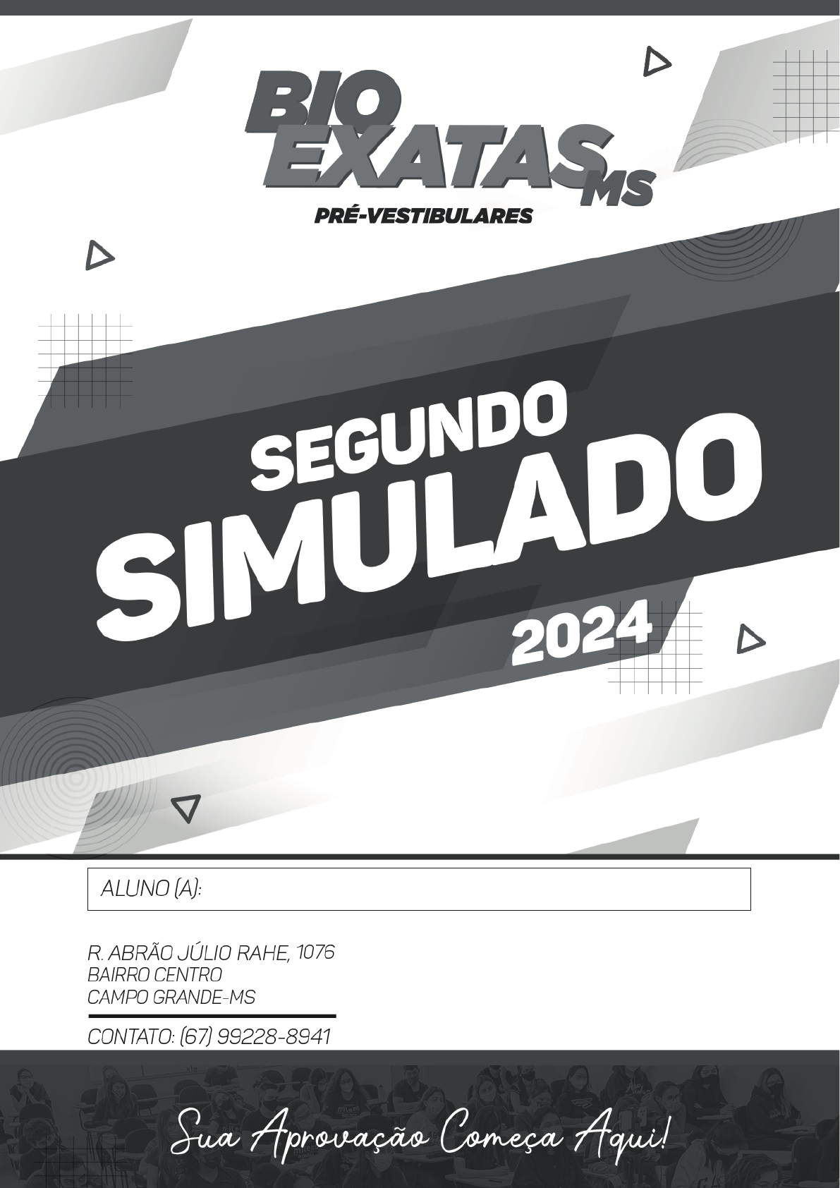 <p>1</p><p>-------------------------------------------------------------</p><p>LEIA ATENTAMENTE AS INSTRUÇÕES</p><p>1. Este simulado contém 60 questões objetivas</p><p>– com 4 ou 5 alternativas, sendo apenar uma</p><p>alternativa correta.</p><p>2. Confira a quantidade e a ordem das</p><p>questões, se conferem com as observações</p><p>anteriores. Comunique se houver divergências</p><p>ao responsável pela aplicação do simulado.</p><p>3. O tempo disponível para a realização do</p><p>simulado é de 5 horas.</p><p>4. Reserve o tempo para preencher o</p><p>CARTÃO RESPOSTA E A FOLHA PARA</p><p>REDAÇÃO.</p><p>As anotações realizadas na FOLHA DE</p><p>QUESTÕES, não serão consideradas na</p><p>avaliação.</p><p>-------------------------------------------------------------</p><p>BIOLOGIA</p><p>QUESTÃO 01 ---------------------------------------------</p><p>Existe um número muito grande de substâncias com</p><p>funções antibióticas. Essas substâncias diferem</p><p>quanto à maneira pela qual interferem no</p><p>metabolismo celular. Assim, a TETRACICLINA liga-</p><p>se aos ribossomos e impede a ligação do RNA</p><p>transportador; a MITOMICINA inibe a ação da</p><p>polimerase do DNA e a ESTREPTOMICINA causa</p><p>erros na leitura dos códons do RNA mensageiro.</p><p>Essas informações permitem afirmar que</p><p>I - a TETRACICLINA impede a transcrição e leva a</p><p>célula bacteriana à morte por falta de RNA</p><p>mensageiro.</p><p>II - a MITOMICINA, por inibir a duplicação do DNA,</p><p>impede a multiplicação da célula bacteriana.</p><p>III - a ESTREPTOMICINA interfere na tradução e</p><p>leva a célula bacteriana a produzir proteínas</p><p>defeituosas.</p><p>Assinale a alternativa que reúne as afirmações</p><p>corretas.</p><p>a) apenas I é correta.</p><p>b) apenas I e II são corretas.</p><p>c) apenas II e III são corretas.</p><p>d) apenas I e III são corretas.</p><p>e) I, II e III são corretas.</p><p>QUESTÃO 02 ---------------------------------------------</p><p>Bactérias foram cultivadas em um meio nutritivo</p><p>contendo timina radioativa, por centenas de</p><p>gerações. Dessa cultura, foram isoladas 100</p><p>bactérias e transferidas para um meio sem</p><p>substâncias radioativas. Essas bactérias sofreram</p><p>três divisões no novo meio, produzindo 800</p><p>bactérias.</p><p>2</p><p>A análise dos ácidos nucléicos mostrou que dessas</p><p>800 bactérias</p><p>a) 100 apresentavam o DNA marcado, mas não o</p><p>RNA.</p><p>b) 200 apresentavam o DNA marcado, mas não o</p><p>RNA.</p><p>c) 400 apresentavam o DNA marcado, mas não o</p><p>RNA.</p><p>d) 200 apresentavam o DNA e o RNA marcados.</p><p>e) todas apresentavam o DNA e o RNA marcados.</p><p>QUESTÃO 03 --------------------------------------------</p><p>Há uma impressionante continuidade entre os seres</p><p>vivos (...). Talvez o exemplo mais marcante seja o</p><p>da conservação do código genético (...) em</p><p>praticamente todos os seres vivos. Um código</p><p>genético de tal maneira “universal” é evidência de</p><p>que todos os seres vivos são aparentados e</p><p>herdaram os mecanismos de leitura do RNA de um</p><p>ancestral comum.</p><p>Morgante & Meyer, Darwin e a Biologia, O Biólogo 10:12–20, 2009.</p><p>O termo “código genético” refere-se</p><p>a) ao conjunto de trincas de bases nitrogenadas,</p><p>cada trinca correspondendo a um determinado</p><p>aminoácido.</p><p>b) ao conjunto de todos os genes dos</p><p>cromossomos de uma célula, capazes de sintetizar</p><p>diferentes proteínas.</p><p>c) ao conjunto de proteínas sintetizadas a partir de</p><p>uma sequência específica de RNA.</p><p>d) a todo o genoma de um organismo, formado pelo</p><p>DNA de suas células somáticas e reprodutivas.</p><p>e) à síntese de RNA a partir de uma das cadeias do</p><p>DNA, que serve de modelo.</p><p>QUESTÃO 04 --------------------------------------------</p><p>Uma mutação, responsável por uma doença</p><p>sanguínea, foi identificada numa família. Abaixo</p><p>estão representadas sequências de bases</p><p>nitrogenadas, normal e mutante; nelas estão</p><p>destacados o sítio de início da tradução e a base</p><p>alterada.</p><p>O ácido nucleico representado acima e o número de</p><p>aminoácidos codificados pela sequência de bases,</p><p>entre o sítio de início da tradução e a mutação, estão</p><p>corretamente indicados em:</p><p>a) DNA; 8.</p><p>b) DNA; 24.</p><p>c) DNA; 12.</p><p>d) RNA; 8.</p><p>e) RNA; 24.</p><p>QUESTÃO 05 ---------------------------------------------</p><p>A engenharia genética possibilitou grandes avanços</p><p>para a medicina, com destaque para produção de</p><p>organismos transgênicos capazes de produzir</p><p>proteínas com atividades biológicas diversas.</p><p>Considerando a figura abaixo, analise o processo de</p><p>produção de tais proteínas:</p><p>3</p><p>Sobre este processo, é correto concluir:</p><p>a) Os transgênicos são produzidos pelo cruzamento</p><p>entre espécies diferentes, obtendo-se uma espécie</p><p>nova que não ocorre naturalmente.</p><p>b) As bactérias transgênicas têm seu cromossomo</p><p>substituído por DNA de outros organismos</p><p>contendo genes de interesse.</p><p>c) Os plasmídios são elementos genéticos que</p><p>naturalmente expressam genes em eucariontes e</p><p>procariontes.</p><p>d) A enzima DNA polimerase tem o papel de ligar</p><p>genes de interesse em plasmídios bacterianos,</p><p>utilizados como vetores de clonagem.</p><p>e) As enzimas de restrição são utilizadas para</p><p>cortar seções do DNA com genes de interesse que</p><p>serão clonados e expressos em bactérias.</p><p>QUESTÃO 06 --------------------------------------------</p><p>Uma maneira de se obter um clone de ovelha é</p><p>transferir o núcleo de uma célula somática de uma</p><p>ovelha adulta A para um óvulo de uma outra ovelha</p><p>B do qual foi previamente eliminado o núcleo. O</p>