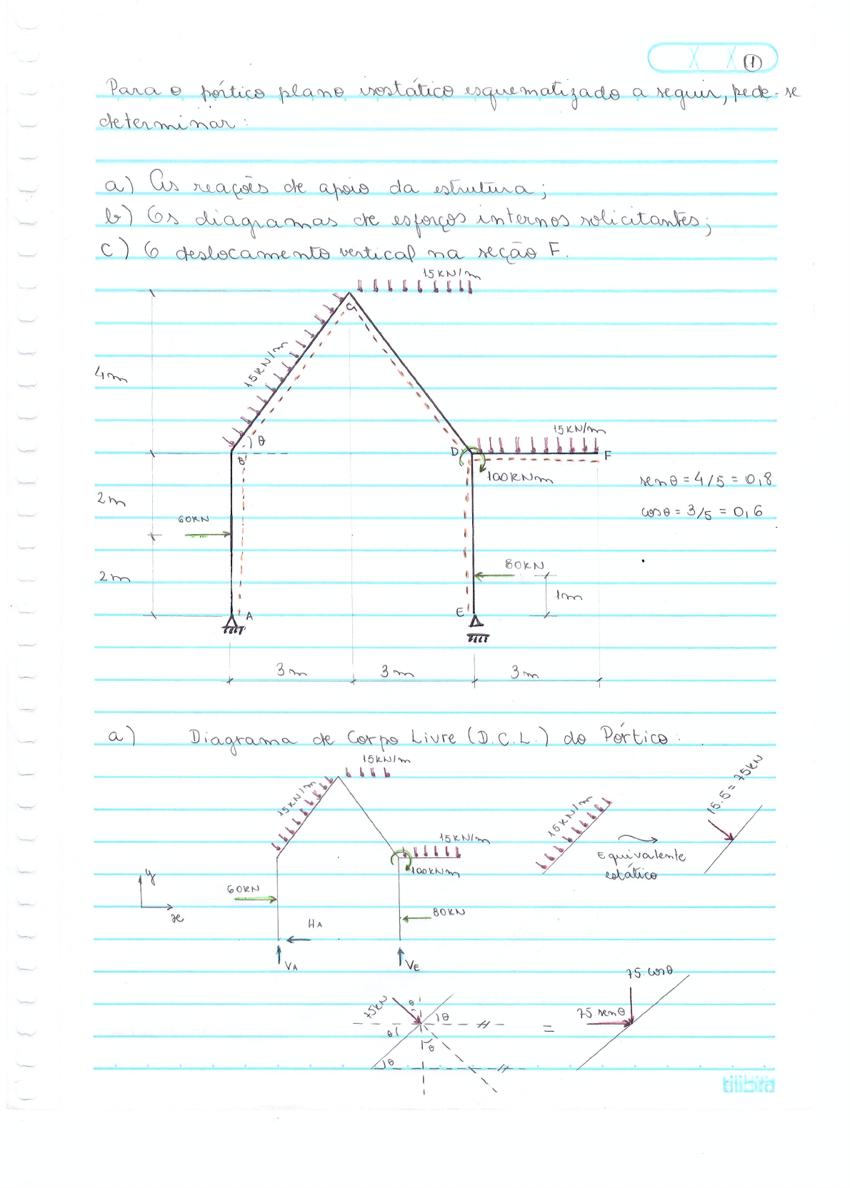 <p>1 portico plano isostatico a se determinar a) da b) diagramas che esforces internos c) 6 deslocamento vertical na F 4m 15KN/m F 2m = 2m E' 3m 3m 3m Diagrama Corpo Livre (D.C.L.) do Portico Equivalente y estatico 80KN HA VA VE 10 H 75</p><p>2 HA = 2 (3+3) 15.3 VE = 2215 = 184,583 KN 12 75 VA+VE = 15.5 was = D VA = - = 12 b) das barras ( as sem mo- mentos fletores) - na barra = ly = e ly Pre = D D duas devem ten mesmo equivalente estatico =D =D = leo =D = no caso especifico deste ly=4m j 5m eq= = =D = 15.3 = 5 tilibra</p><p>3 Podemos ainda decomper a carregamento has componentes areial e P Pseno q ~D = + q't q'e = cost = = of Pre = of = = q ly = of Pre ly = of PCD PCD PCD no a ser resolvido = 15.32 = 15.3.4 = 52 52 dos esforces normal - Barra BC pela 49,583 83 = 3 = 27,6KN 40KN - 45,75RN = ha taxea na a funçao do normal na barra e constan- dN =D dN =D N constante are = - 15.5 a do esforce cortante na barra linear, dQ are = qy e qy= 15 = constante =D tilibra</p><p>4 pela 15.3=45RN 479 3 = - = - = - 19,75 KN 184,583 Q>0 a barra do no D ha relative a de da barra BC 15.3=45KN = + 45 sent = -371 3 + = as do esforce normal l do esforce cortante saw lineares na barra, = = constante = ainda determinado or valores de + = KN = + Diagramas de DN e DQ: -123,6 -159,6 - 49,583 -184,583 tilibra</p><p>7,75 5 7,75 -120,75 A7 A3 = = 19,75 -19,75 5 - d A2 + d 145 108 A6 + S A, 40,0 do momento utilizamos a equa- de equilimio dM = a algumas Se >0 =D i crescente no sentido de crescimento da da barra Se =D decrescente no sentido de crescimento da da mudança de indica um ponto de maximo de minimo de to na Se = na mudança de sinal a te a curva e paralela ao used da a mudança de for descontinua um ponto anguloro na</p><p>6 Ex: Q=0 DQ DM tg P + DQ DM - + Ponto dM = = = > = - = da de ate do em conta O area> se >0 e se com sinal = =D = it tracar diagrama do esforce a integral longo de toda a to a tado igual do - to que e igual momento concentrado total aplicado a ( das cargas momento concentradas com as de Para O can em questas Ail= 100 KNm Por analisemos a da momento = dM do = dre2 e du = - qy =</p><p>7 >0 x y y re <0 y que, como dM = = constante comstante =D linear linear =D quachatico Calculando as areas de DQ: - - 416,25 2 A4= 1=4205 RNM 108 2 864 A5 19,75 ( 31205 = - 36,1169RNM 108 2 864 A7= 45.3 = 67,5KNm 2 7 4 Ai</p><p>8 20 E tg horiz 40,0 - DM (KNm) Partindo de valores de M(x) = Mmax = = Mmax AB = 80-40 do no =D = B = Mic + A3 = - do no C : C =D - 376,25RNM = 864 864 = Mmax CD + A5 = - 320875 - 31205 = - 407,5 864 864</p><p>9 = + = A7 = do no = + A6 = -240 + c) Utilizando M.C.U. D.C.L. do Portico 1KN y VE" + KN O=D + = 1 =D 2 Diagramas de dN e KQ70 IRN 3/2 Q20 1/2 NBC = = - + 1 2 + = tilibra</p><p>X 10 A2 A3 1,0 3 & OK! Diagram a de -3,0 310 - I Partindo de valores de : e constante=0 MAB = constante) MDE= ( do MBC A1</p><p>11 Equilibrio dono C = A2 = = +A3 = D = A3 = Calculo do deslocamento = EI M ds Para utilizar a de que as dM para as barras AB, BC e CD representação na tabela, procedemos a analise individual desas Para representar qualquer de 2 inferior como das existentes na de basta a te em cada barra em momentos de e de Barra AB B B 4 + + + A A A A tilibra</p><p>12 Barra BC + ~D 15.52 46,875 B B 8 MA esta a de uma tabela l ar com valores de zero na Pode ser utilizada para funcous crescentes e de- Gs valores podem ser positives basta observar valor has da no da barra MA = e MB = M°BC 376,25 Barra CD 15KN/m + + D D D 8 Para a barra DF pode se utilizar a existente na tabela ( uma vez que OF = a tangencia a barra na D + D F F ~D A + 15.32 8 de Swi -1,5 46,875 40 = l + + + EI B 5m B 5m B 5m tilibra</p><p>3,0 376,25 407,5 16,875 -3,0 13 -1,5 + X + + A = tg horiz 5m D 5m D D 3m I = 1 + + 5 EI 6 3 6 - 3 16,875 + 4 = = EI { 7125 1875 + 35425 2025 + 1215 = 41815 8 16 8 16 8 8EI = = 41815 8EI as barras AB e DE fram computadas, has = =</p>