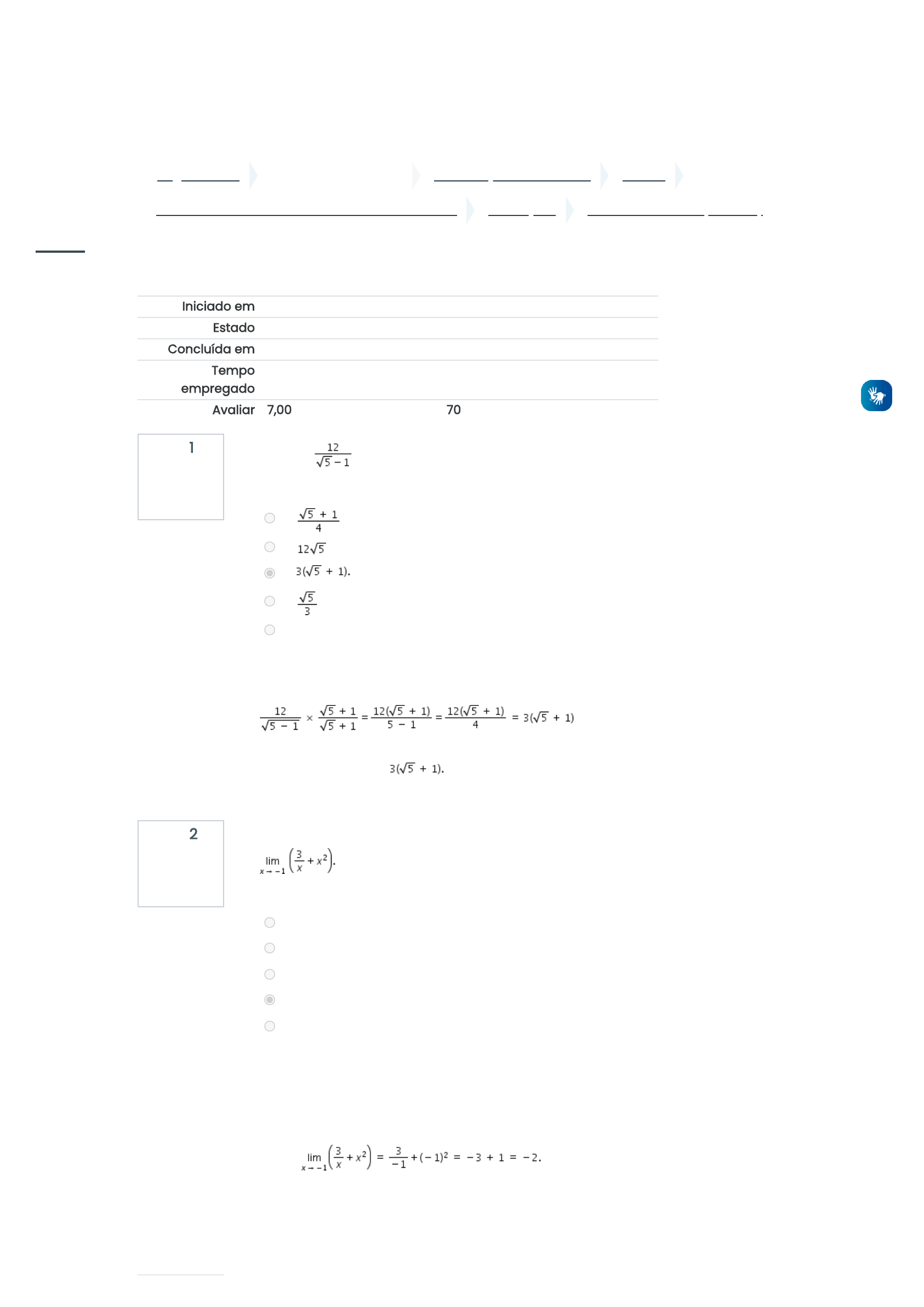 07/10/2022 10:49 P2 - Prova On-line (Acessar) https://ava.candidomendes.edu.br/moodle/mod/quiz/review.php?attempt=268732&cmid=330501 1/4 ... Página inicial Disciplinas e Espaços GRADUAÇÃO A DISTÂNCIA 2022-3 Fundamentos da Matemática - 2022_03_EAD_A Avaliações P2 - Prova On-line (Acessar) Questão 1 Correto Atingiu 1,00 de 1,00 Questão 2 Correto Atingiu 1,00 de 1,00 Iniciado em terça, 4 out 2022, 11:19 Estado Finalizada Concluída em terça, 4 out 2022, 11:56 Tempo empregado 37 minutos 14 segundos Avaliar 7,00 de um máximo de 10,00(70%) A fração é igual a Escolha uma opção: a. . b. . c. d. . e. 3. Sua resposta está correta. A resposta correta é: Assinale o item em que se encontra o valor correto do Escolha uma opção: a. -1. b. 1. c. 2 d. -2. e. 0. Sua resposta está correta. O primeiro passo no cálculo de um limite é substituir a variável x pelo valor para o qual ela está tendendo. Assim, A resposta correta é: -2. https://ava.candidomendes.edu.br/moodle/ https://ava.candidomendes.edu.br/moodle/course/index.php?categoryid=8 https://ava.candidomendes.edu.br/moodle/course/index.php?categoryid=122 https://ava.candidomendes.edu.br/moodle/course/view.php?id=10461 https://ava.candidomendes.edu.br/moodle/course/view.php?id=10461§ion=4 https://ava.candidomendes.edu.br/moodle/mod/quiz/view.php?id=330501 javascript:void(0); https://ava.candidomendes.edu.br/moodle/user/index.php?id=10461 https://ava.candidomendes.edu.br/moodle/course/view.php?id=10461&stopjsnav=1 https://ava.candidomendes.edu.br/moodle/course/view.php?id=10461&datapref=1 https://ava.candidomendes.edu.br/moodle/ https://ava.candidomendes.edu.br/moodle/my/ https://ava.candidomendes.edu.br/moodle/course/view.php?id=10500 https://ava.candidomendes.edu.br/moodle/course/view.php?id=10312 https://ava.candidomendes.edu.br/moodle/course/view.php?id=10461 https://ava.candidomendes.edu.br/moodle/course/view.php?id=396 https://ava.candidomendes.edu.br/moodle/course/view.php?id=892 javascript:void(0); 07/10/2022 10:49 P2 - Prova On-line (Acessar) https://ava.candidomendes.edu.br/moodle/mod/quiz/review.php?attempt=268732&cmid=330501 2/4 Questão 3 Correto Atingiu 1,00 de 1,00 Questão 4 Correto Atingiu 1,00 de 1,00 Duas retas distintas são concorrentes se, e somente se, têm um ponto comum. Uma das maneiras de se determinar as coordenadas do ponto de intersecção é resolver o sistema composto pelas equações das retas. Dadas as equações das retas , é correto afirmar que Escolha uma opção: a. a abscissa do ponto de intersecção é positiva. b. o ponto de intersecção é (10, 3). c. a ordenada do ponto de intersecção é igual -11. d. as duas retas se intersectam na origem do plano cartesiano e. o ponto de intersecção pertence ao 2º. quadrante. Sua resposta está correta. Conforme o enunciado mesmo sugere, o caminho para resolver essa questão é compor o sistema com as equações das retas e, em seguida, resolvê – lo. A ordenada do ponto de intersecção pode ser determinada substituindo o valor de x = –4 em qualquer uma das duas equações. Assim o valor de y = – 4 – 7= –11. A resposta correta é: a ordenada do ponto de intersecção é igual -11. Sobre a expressão podemos afirmar que Escolha uma opção: a. impossível em IR. b. é igual a c. é menor do que d. é negativa. e. é maior do que Sua resposta está correta. Resposta: é menor do que . Tomando a potência e comparando-a com podemos escrever assim: porque se as bases estão entre 0 e 1 então a maior potência é aquela que tem o menor expoente e nesse caso A resposta correta é: é menor do que javascript:void(0); https://ava.candidomendes.edu.br/moodle/user/index.php?id=10461 https://ava.candidomendes.edu.br/moodle/course/view.php?id=10461&stopjsnav=1 https://ava.candidomendes.edu.br/moodle/course/view.php?id=10461&datapref=1 https://ava.candidomendes.edu.br/moodle/ https://ava.candidomendes.edu.br/moodle/my/ https://ava.candidomendes.edu.br/moodle/course/view.php?id=10500 https://ava.candidomendes.edu.br/moodle/course/view.php?id=10312 https://ava.candidomendes.edu.br/moodle/course/view.php?id=10461 https://ava.candidomendes.edu.br/moodle/course/view.php?id=396 https://ava.candidomendes.edu.br/moodle/course/view.php?id=892 javascript:void(0); 07/10/2022 10:49 P2 - Prova On-line (Acessar) https://ava.candidomendes.edu.br/moodle/mod/quiz/review.php?attempt=268732&cmid=330501 3/4 Questão 5 Correto Atingiu 1,00 de 1,00 Questão 6 Incorreto Atingiu 0,00 de 1,00 Questão 7 Completo Atingiu 2,00 de 2,00 Sobre as funções reais de variáveis reais definidas por e , a informação FALSA está indicada no item Escolha uma opção: a. . b. c. d. e. Sua resposta está correta. Calculando os valores das funções nos seguintes pontos: Calculando a soma Logo, o item que contém a sentença é FALSO. A resposta correta é: Uma das formas equivalentes da fração , para , está indicada no item Escolha uma opção: a. b. c. d. . e. . Sua resposta está incorreta. Padrão de Respostas Observe que para se obter a expressão na forma final apresentada, basta colocar em evidência. A resposta correta é: . Calcular o , se possível. Desenvolvimento em anexo questao 7.jpeg Comentário: https://ava.candidomendes.edu.br/moodle/pluginfile.php/448738/question/response_attachments/338300/7/9825232/questao%207.jpeg?forcedownload=1 javascript:void(0); https://ava.candidomendes.edu.br/moodle/user/index.php?id=10461 https://ava.candidomendes.edu.br/moodle/course/view.php?id=10461&stopjsnav=1 https://ava.candidomendes.edu.br/moodle/course/view.php?id=10461&datapref=1 https://ava.candidomendes.edu.br/moodle/ https://ava.candidomendes.edu.br/moodle/my/ https://ava.candidomendes.edu.br/moodle/course/view.php?id=10500 https://ava.candidomendes.edu.br/moodle/course/view.php?id=10312 https://ava.candidomendes.edu.br/moodle/course/view.php?id=10461 https://ava.candidomendes.edu.br/moodle/course/view.php?id=396 https://ava.candidomendes.edu.br/moodle/course/view.php?