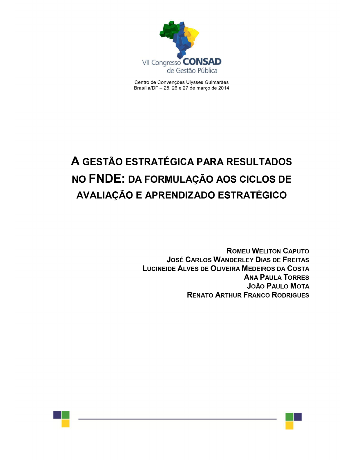 <p>VII Congresso CONSAD de Gestão Pública Centro de Convenções Ulysses Guimarães Brasília/DF - 25, 26 e 27 de março de 2014 A GESTÃO ESTRATÉGICA PARA RESULTADOS NO FNDE: DA FORMULAÇÃO AOS CICLOS DE AVALIAÇÃO E APRENDIZADO ESTRATÉGICO ROMEU WELITON CAPUTO JOSÉ WANDERLEY DE FREITAS LUCINEIDE ALVES DE OLIVEIRA MEDEIROS DA COSTA ANA PAULA TORRES PAULO MOTA RENATO ARTHUR FRANCO RODRIGUES</p><p>2 Painel 17/050 Monitoramento e avaliação na prática A GESTÃO ESTRATÉGICA PARA RESULTADOS NO FNDE: DA FORMULAÇÃO AOS CICLOS DE AVALIAÇÃO E APRENDIZADO ESTRATÉGICO Romeu Weliton Caputo José Carlos Wanderley Dias de Freitas Lucineide Alves de Oliveira Medeiros da Costa Ana Paula Torres João Paulo Mota Renato Arthur Franco Rodrigues RESUMO O FNDE é o órgão responsável pelo financiamento das principais ações educacionais no país. Possui o orçamento superior a 50 bilhões de reais e um conjunto de desafios que vão desde manutenção e desenvolvimento da educação, incluindo livros didáticos, bolsas e transporte para a população escolar, à construção de novas escolas, creches, quadras esportivas etc. Nos últimos anos, o FNDE tem amadurecido em sua forma de formular a estratégia e, sobretudo, na implementação e avaliação da estratégia. Nesse sentido, a autarquia tem executado as Reuniões de Avaliação da Estratégia (RAE) com objetivo de promover a reflexão sobre a execução da estratégia e definir encaminhamentos para o alcance de melhores resultados. A reunião se destina a apurar o desempenho recente, sugerir correções de rumos e rotas e propiciar o aprimoramento da estratégia. Essa sistemática é parte de um modelo integrado de monitoramento e avaliação das diversas unidades da organização em prol da melhoria do desempenho global. O artigo apresenta o histórico de formulação da estratégia na autarquia, assim como a metodologia das RAE, descrevendo sua estrutura, resultados alcançados e fatores críticos para execução.</p><p>3 1 INTRODUÇÃO O Fundo Nacional de Desenvolvimento da Educação - FNDE, autarquia federal vinculada ao Ministério da Educação, criada pela Lei n° 5.537, de 21 de novembro de 1968, tem por finalidade captar recursos financeiros e canalizá-los para o financiamento de programas e projetos educacionais nas áreas de ensino, pesquisa, alimentação escolar, bolsas de estudo e outras ações, observadas as diretrizes do Plano Nacional de Educação (PNE) e da Lei de Diretrizes e Bases da Educação Nacional (LDB). Desde a sua criação, o FNDE tem passado por transformações e pela incorporação de novas responsabilidades, advindas do cumprimento de disposições constitucionais e dos desafios de tornar efetiva a política educacional do País, de reduzir a incidência dos baixos índices educacionais e de assegurar acesso e permanência à educação de qualidade a todo cidadão brasileiro. O presente artigo traz o histórico da construção do modelo de gestão adotado pelo FNDE, as ferramentas para a execução e aprimoramento da estratégia e os principais resultados alcançados. 2 HISTÓRICO DA FORMULAÇÃO DA ESTRATÉGIA NO FNDE E DESAFIOS DA GESTÃO ESTRATÉGICA O realiza continuamente ações paraaprimorar o seu planejamento estratégico. A primeira versão do Plano Estratégico da Autarquia, realizada em 2004, tinha por finalidade implementar oprojeto de fortalecimento institucional e ampliar a eficiência, a qualidade e a transparência da atuação do FNDE.Adotou-se, como princípios basilares, a ênfase nos resultados, a responsabilização, a autonomia, o estabelecimento de parcerias responsáveis, o trabalho em rede, a utilização da informação como instrumento gerencial, o diálogo público, o controle social, o monitoramento, a avaliação e a articulação com estados e municípios, com o propósito de obter maior efetividade na aplicação dos recursos do FNDE. Os resultados do projeto de fortalecimento institucional estiveram atrelados à execução de ações estratégicas, como a estruturação das carreiras de técnico e especialista em financiamento e execução de programas e projetos educacionais;a aquisição do prédio sede e posterior projeto de adequações e</p><p>4 reforma; a construção e implantação de um modelo de compras governamentais que propiciasse a padronização e a qualidade dos itens adquiridos; e a economia e transparência na aplicação dos recursos. Todas essas ações estruturantes estiveram vinculadas às diretrizes do Plano de Desenvolvimento da Educação (PDE) e do Ministério da Educação. Em 2010, a Autarquia retomou as ações de planejamento estratégico e o foco dos trabalhos pautou-se na construção de uma metodologia orientada para a estratégia. Foi elaborado um modelo de gestão capaz de apresentar, de forma organizada, a integração entre os seus sistemas com a estrutura organizacional e a cultura. A transformação da estratégia em tarefa de todos se deu por meio de processos de conexão "top-down", para compartilhar a estratégia e alinhar os colaboradores, e também processos "bottom-up", para incorporar e executar a estratégia. A figura a seguir ilustra os princípios orientadores do modelo de gestão da estratégia adotados pelo órgão. Mapa Estratégico Indicadores Mobilização para a Mudança Metas, Programas e Projetos Visão e Estratégia Mobilização das Tradução Lideranças Organização Orientada para a Alinhamento Estratégia Processo Contínuo Sinergias entre áreas e unidades Gestão Estratégica Gestão dos Programas e Projetos Tarefa de Todos Vínculo entre Orçamentos e Estratégia Sistemas de Informação Consciência Estratégica Comunicação Avaliação de Desempenho Figura 1 - Princípio de uma organização orientada para a estratégia As etapas para o desenvolvimento desse modelo contemplaram a realização da análise de cenários no campo da educação e das crescentes atribuições do FNDE: a elaboração daAn