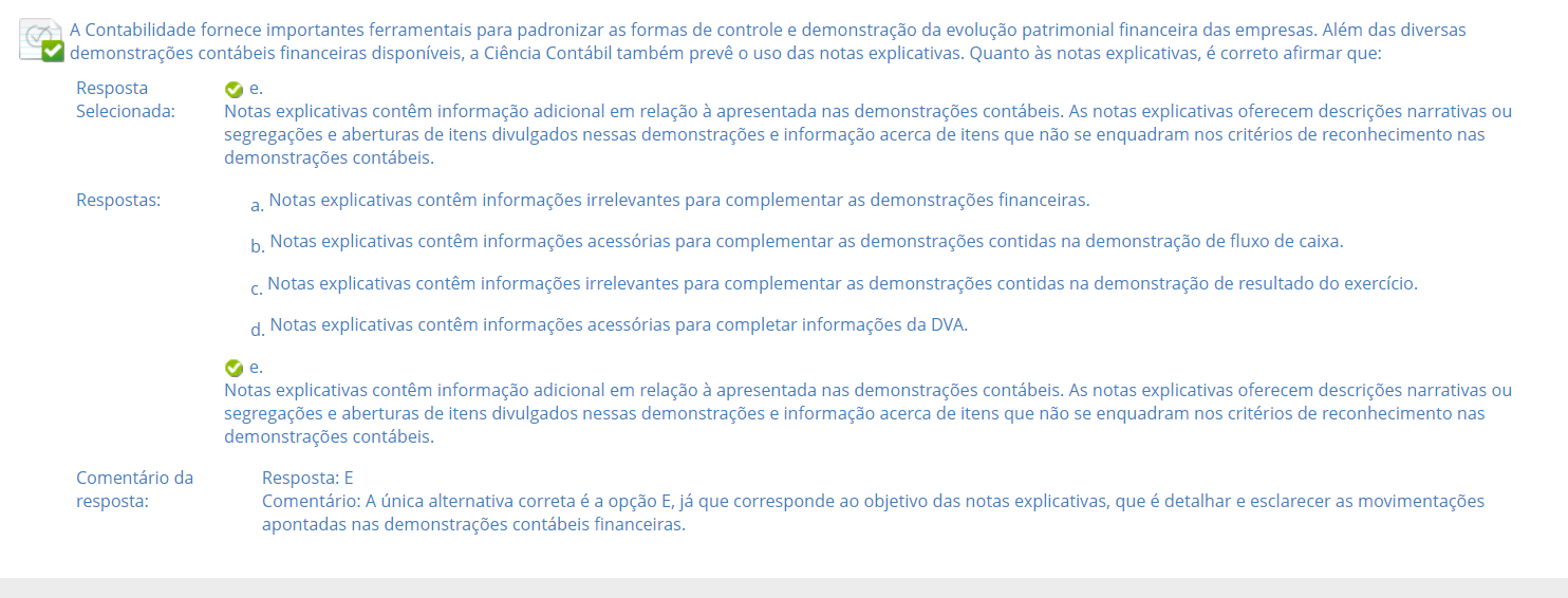 <p>A Contabilidade fornece importantes ferramentais para padronizar as formas de controle e demonstração da evolução patrimonial financeira das empresas. Além das diversas demonstrações contábeis financeiras disponíveis, a Ciência Contábil também prevê uso das notas explicativas. Quanto às notas explicativas, é correto afirmar que: Resposta e. Selecionada: Notas explicativas contêm informação adicional em relação à apresentada nas demonstrações As notas explicativas oferecem descrições narrativas ou segregações e aberturas de itens divulgados nessas demonstrações e informação acerca de itens que não se enquadram nos critérios de reconhecimento nas demonstrações Respostas: a. Notas explicativas contêm informações irrelevantes para complementar as demonstrações financeiras. b. Notas explicativas contêm informações acessórias para complementar as demonstrações contidas na demonstração de fluxo de caixa. C. Notas explicativas contêm informações irrelevantes para complementar as demonstrações contidas na demonstração de resultado do exercício. d. Notas explicativas contêm informações acessórias para completar informações da DVA. e. Notas explicativas contêm informação adicional em relação à apresentada nas demonstrações As notas explicativas oferecem descrições narrativas ou segregações e aberturas de itens divulgados nessas demonstrações e informação acerca de itens que não se enquadram nos critérios de reconhecimento nas demonstrações Comentário da Resposta: E resposta: Comentário: A única alternativa correta é a opção E, já que corresponde ao objetivo das notas explicativas, que é detalhar e esclarecer as movimentações apontadas nas demonstrações contábeis financeiras.</p>