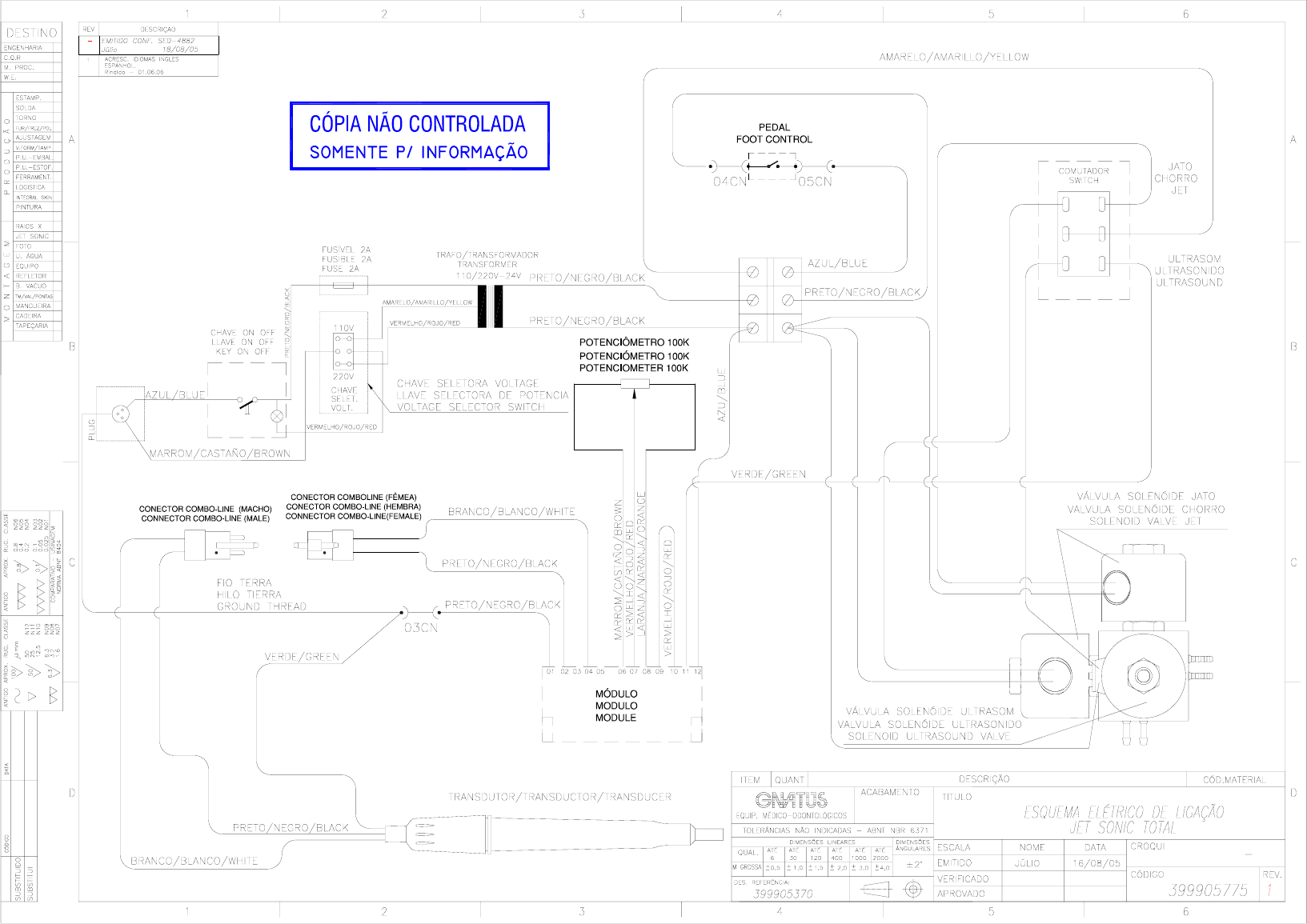 <p>1 2 3 4 5 6 DESTINO REV EMITIDO SED-4882 ENGENHARIA 18/08/05 C.Q.R 1 ACRESC. IDIOMAS INGLES AMARELO/AMARILLO/YELLOW M. ESPANHOL 01.06.06 W.E. SOLDA TORNO FUR/FREZ/POL CÓPIA NÃO CONTROLADA PEDAL AJUSTAGEM A FOOT CONTROL A V.FORM/TAMP P.U.-EMBAL SOMENTE P/ INFORMAÇÃO P.U JATO COMUTADOR FERRAMENT 04CN 05CN SWITCH CHORRO LOGISTICA JET INTEGRAL SKIN PINTURA RAIOS JET SONIC 0 0 > FOTO FUSÍVEL 2A ÁGUA TRAFO/TRANSFORMADOR FUSIBLE 2A EQUIPO TRANSFORMER AZUL/BLUE 0 ULTRASOM FUSE 2A ULTRASONIDO REFLETOR 110/220V-24V PRETO/NEGRO/BLACK ULTRASOUND B. VACUO PRETO/NEGRO/BLACK TM/VAL/PONTAS AMARELO/AMARILLO/YELLOW MANGUEIRA CADEIRA VERMELHO/ROJO/RED PRETO/NEGRO/BLACK 110V CHAVE ON OFF B LLAVE ON OFF 100K B KFY ON OFF o POTENCIÓMETRO 100K POTENCIOMETER 100K 220V CHAVE SELETORA VOLTAGE CHAVE AZUL/BLUE LLAVE SELECTORA DE POTENCIA VOLTAGE SELECTOR SWITCH VERMELHO/ROJO/RED VERDE/GREEN CONECTOR COMBOLINE (FÊMEA) VÁLVULA SOLENÓIDE JATO CONECTOR COMBO-LINE (MACHO) CONECTOR COMBO-LINE (HEMBRA) BRANCO/BLANCO/WHITE VALVULA SOLENÓIDE CHORRO CONNECTOR COMBO-LINE (MALE) CONNECTOR COMBO-LINE(FEMALE) SOLENOID VALVE JET RED C PRETO/NEGRO/BLACK C FIO TERRA HILO TIERRA GROUND THREAD PRETO/NEGRO/BLACK 03CN VERDE/GREEN 1001 01 02 06 07 08 09 10 11 12 B MÓDULO MODULO VÁLVULA SOLENÓIDE ULTRASOM MODULE VALVULA SOLENÓIDE ULTRASONIDO SOLENOID ULTRASOUND VALVE ITEM QUANT DESCRIÇÃO D ACABAMENTO TRANSDUTOR/TRANSDUCTOR/TRANSDUCER D GNATUS TÍTULO EQUIP. ESQUEMA ELÉTRICO DE LIGAÇÃO PRETO/NEGRO/BLACK TOLERÂNCIAS NÃO INDICADAS - ABNT NBR 6371 JET SONIC TOTAL DIMENSÕES LINEARES DIMENSÕES ATÉ ATÉ ATÉ ATÉ ATÉ ATÉ ANGULARES ESCALA NOME DATA CROQUI BRANCO/BLANCO/WHITE 6 30 120 400 1000 2000 M GROSSA +0.5 + + 2,0 + 3.0 EMITIDO JÚLIO 16/08/05 CÓDIGO REV. VERIFICADO REFERENCIA 399905370 APROVADO 399905775 1 1 2 3 4 5 6</p>