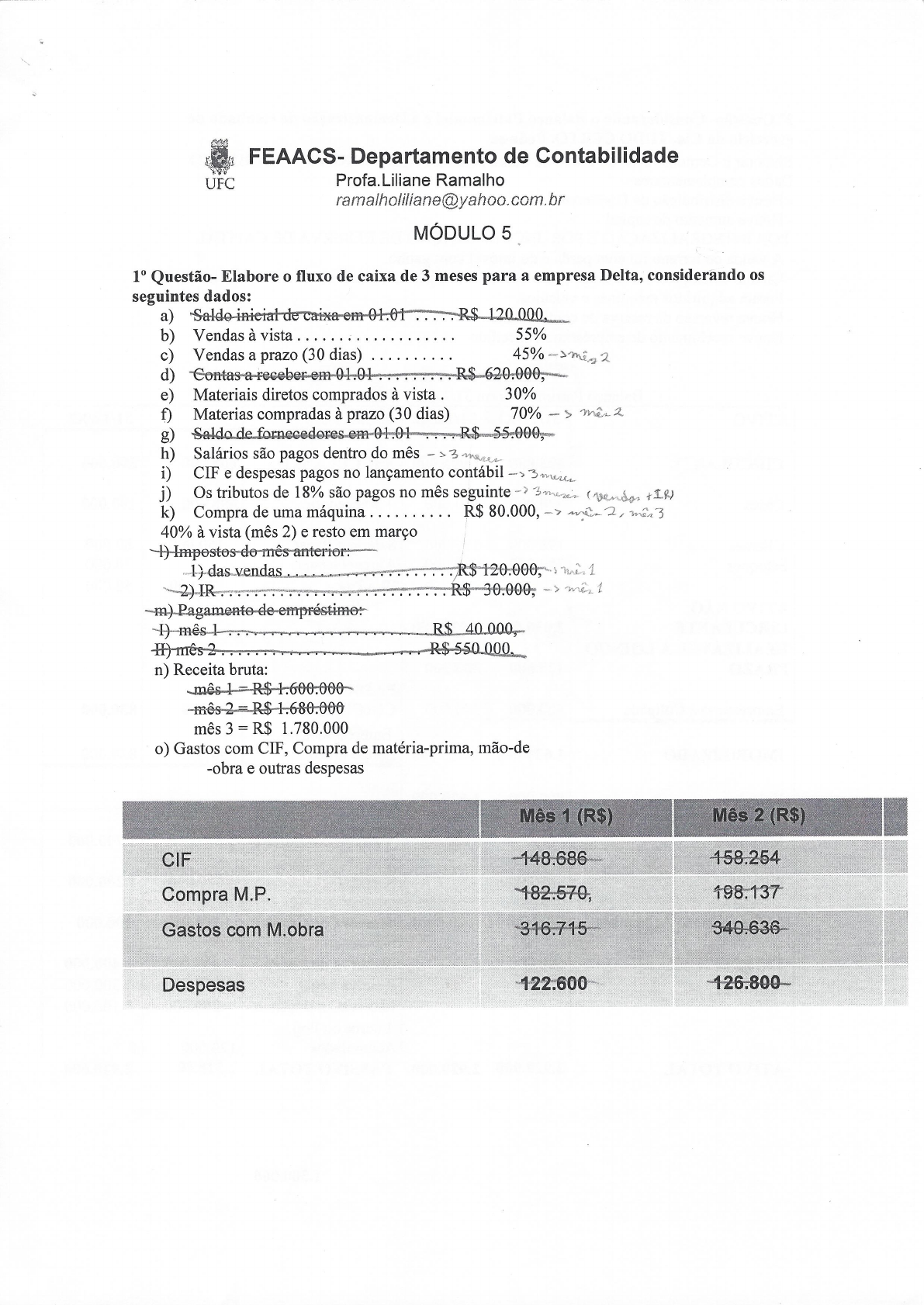 <p>FEAACS- Departamento de Contabilidade UFC Profa.Liliane Ramalho ramalholiliane@yahoo.com.br MÓDULO 5 1° Questão- Elabore o fluxo de caixa de 3 meses para a empresa Delta, considerando os seguintes dados: a) Saldo inicial de caixa em 01.01 R$ b) Vendas à vista 55% c) Vendas a prazo (30 dias) 45% 2 d) Contas a receber em 01.01 R$ 620.000, e) Materiais diretos comprados à vista 30% f) Materias compradas à prazo (30 dias) 70% > g) Saldo de fornecedores em 01.01 R$ 55.000, h) Salários são pagos dentro do mês - >3 i) CIF e despesas pagos no lançamento contábil j) Os tributos de 18% são pagos no mês seguinte k) Compra de uma máquina.......... R$ 80.000, 40% à vista (mês 2) e resto em março 1) Impostos do mês anterior: 1) das vendas R$ 120.000, 2) IR R$ 30.000, m) Pagamente de empréstimo: I) mês 1 R$ 40.000, mês 2 R$ n) Receita bruta: - - R$ 1.680.000 mês 3 = R$ 1.780.000 o) Gastos com CIF, Compra de matéria-prima, mão-de -obra e outras despesas Mês 1 (R$) Mês 2 (R$) CIF 148.686 158.254 Compra M.P. 182.570, 198.137 Gastos com M.obra 316.715 Despesas 122.600</p><p>2° Questão- Considerando Balanço Patrimonial e a Demonstração de resultado do exercício da Cia. TUDO CERTO. Pede-se Elaborar a Demonstração do Fluxo de Caixa pelo MÉTODO DIRETO E INDIRETO Dados complementares: - Houve distribuição de Dividendos - Houve aumento de capital POR INTEGRALIZAÇÃO E POR INCORPORAÇÃO DE RESERVA DE CAPITAL - A venda do terreno foi com perda e do imóvel com ganho. - Quanto ao empréstimo a longo prazo ocorreu variação monetária no valor de R$ 30.000,00. - Foram adquiridos máquinas e veículos. - Houve reversão da reserva de contingência - Houve recebimento de empréstimo concedido Cia." TUDO CERTO" Balanço Patrimonial(em 31/12/x2) - valores em R$) ATIVO 31/12/X1 31/12/X2 PASSIVO 31/12/X2 CIRCULANTE 898.000 1.000.000 CIRCULANTE 668.000 390.000 Caixa 320.000 150.000 Fornecedores 498.000 190.000 Clientes 198.000 370.000 Salário a Pagar 150.000 80.000 Estoques 380.000 480.000 Aluguel a pagar - 70.000 IR a Pagar 20.000 50.000 ATIVO NÃO CIRCULANTE 2.030.000 1.920.000 REALIZÁVEL A LOINGO PRAZO 400.000 300.000 PASSIVO NÃO Empréstimo a Coligada 400.000 300.000 CIRCULANTE 690.000 830.000 Empréstimos de IMOBILIZADO 1.630.000 1.620.000 Longo Prazo 690.000 830.000 Veículos 800.000 1.620.000 Máquinas 120.000 Patrimônio Líquido 1.570.000 1.700.000 Imóveis 400.000 - Capital 800.000 1.200.000 (-) Depreciação Acumulada (70.000) (120.000) Reserva de Capital 200.000 100.000 Terrenos 500.000 Reserva de Lucro 450.000 400.000 Reserva Legal 250.000 300.000 ReservaContingência 200.000 100.000 Lucros ou Prej. Acumulados 120.000 0 ATIVO TOTAL 2.928.000 2.920.000 PASSIVO TOTAL 2.928.00 2.920.000 1.500.000</p><p>Receitas de Vendas (-) Custo de Produtos Vendidos (500.000) (=) Lucro Bruto 1.000.000 (-) Despesas Operacionais (320.000) DespesaAdministrativas (230.000) Despesa de Salário ( 90.000) Despesa de Aluguel (70.000) Despesa de Material de expediente (20.000) Despesa de Depreciação (50.000) Despesa de Vendas (60.000) Despesa Financeira (30.000) (=) Resultado Operacional 680.000 (+/-) Resultado Não Operacional 150.000 Outras receitas 200.000 Outras Despesas (50.000) Lucro antes dos Impostos 830.000 Provisão IR 199.200 Lucro Líquido 630.800</p><p>3° Balanço Patrimonial e a Demonstração de resultado do exercício da Cia.FÉRIAS Pede-se Elaborar a Demonstração do Fluxo de Caixa pelo MÉTODO DIRETO E INDIRETO Dados complementares: - Houve distribuição de Dividendos - Houve aumento de capital EM DINHEIRO POR INTEGRALIZAÇÃO E POR INCORPORAÇÃO DE RESERVA DE CAPITAL - A venda do terreno foi com perda e do imóvel com ganho. - Quanto ao empréstimo a longo prazo ocorreu variação monetária no valor de R$ 50.000,00. - Foram adquiridos máquinas e veículos. - Houve reversão da reserva de contingência - Houve concessão de empréstimo Cia." FERIAS" Balanço Patrimonial(em 31/12/x2) - valores em R$) ATIVO 31/12/X1 31/12/X2 PASSIVO 31/12/X2 CIRCULANTE 798.000 1.100.000 CIRCULANTE 768.000 390.000 Caixa 320.000 250.000 Fornecedores 298.000 190.000 Clientes 198.000 370.000 Salário a Pagar 350.000 90.000 Estoques 280.000 480.000 Aluguel a pagar - 60.000 NÃO CIRCULANTE IR a Pagar 120.000 50.000 REALIZÁVEL A LONGO PRAZO 300.000 500.000 NÃO Empréstimo a Coligada 300.000 500.000 CIRCULANTE 600.000 930.000 Empréstimos de IMOBILIZADO 1.840.000 1.820.000 Longo Prazo 600.000 930.000 Veículos 700.000 1.620.000 PATRIMÔNIO Máquinas 320.000 LÍQUIDO 1.570.000 2.100.000 Imóveis 910.000 Capital 890.000 1.500.000 (-) Depreciação Acumulada (70.000) (120.000) Reserva de Capital 110.000 100.000 Terrenos 300.000 Reserva de Lucro 450.000 500.000 Reserva Legal 150.000 300.000 Reserva de Lucro a Realizar 100.000 ReservaContingência 300.000 100.000 Lucros ou Prej. Acumulados 120.000</p><p>ATIVO TOTAL 2.938.000 3.420.000 PASSIVO TOTAL 2.938.00 3.420.000 Receitas de Vendas 1.800.000 (-) Custo de Produtos Vendidos (500.000) (=) Lucro Bruto 1.300.000 (-) Despesas Operacionais (470.000) DespesaAdministrativas (340.000) Despesa de Salário ( 70.000) Despesa de Aluguel (90.000) Despesa de Material de expediente (130.000) Despesa de Depreciação (50.000) Despesa de Vendas (80.000) Despesa Financeira (50.000) (=) Resultado Operacional 830.000 Outras Receitas 150.000 Outras Despesas (200.000) Lucro antes dos Impostos 780.000 Provisão IR 187.200 Lucro Líquido 592.800</p>