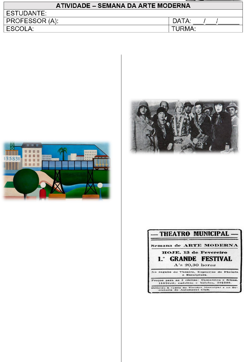 <p>SEMANA DA ARTE MODERNA</p><p>No começo do Século XX, diante de tantas</p><p>transformações industriais, econômicas e sociais</p><p>no mundo, a Arte aqui no Brasil também buscava</p><p>uma renovação social. Os artistas envolvidos</p><p>nessa nova cultura, inspirados nas vanguardas</p><p>europeias, propunham várias vertentes que</p><p>refletissem a busca do homem pela liberdade total</p><p>de criação. Logo, houve um rompimento com a arte</p><p>acadêmica tradicional, colaborando para uma</p><p>mudança estética e para o Movimento Modernista</p><p>no Brasil.</p><p>MOVIMENTO ARTÍSTICO: O</p><p>MODERNISMO</p><p>Tarsila do Amaral</p><p>Todo movimento artístico rompe com os padrões</p><p>de movimentos anteriores. Isso geralmente ocorre</p><p>em todas as formas de expressão: música, pintura,</p><p>escultura e literatura. Entretanto, o novo nem</p><p>sempre é bem acolhido, o que ficou evidente no</p><p>caso do Modernismo que, a princípio, chocou a</p><p>sociedade por fugir totalmente da estética</p><p>conservadora. O Modernismo surgiu como rejeição</p><p>ao passado e como busca incessante da liberdade</p><p>radical de expressão. Oficialmente, o movimento</p><p>Modernista surgiu, no Brasil, com a Semana de</p><p>Arte Moderna, que apresentou novas ideias</p><p>artísticas em três festivais realizados no Teatro</p><p>Municipal de São Paulo.</p><p>SEMANA DE 22</p><p>Realizada nos dias 13,15 e 17 de fevereiro de 1922,</p><p>no Teatro Municipal de São Paulo, a</p><p>Semana de Arte Moderna exibiu concertos,</p><p>conferências e exposições. Os escritores Mário de</p><p>Andrade e Oswald de Andrade e o artista plástico</p><p>Di Cavalcanti foram os grandes mobilizadores do</p><p>evento.</p><p>Foto de 1922 durante a Semana da Arte Moderna</p><p>Muitos artistas da época, como: Graça Aranha,</p><p>Tarsila do Amaral, Heitor Villa-Lobos, Anita Malfatti</p><p>e Guilherme de Almeida participaram do evento.</p><p>Apesar de ter sido uma explosão de ideias</p><p>inovadoras que aboliram completamente a</p><p>perfeição estética apreciada no século XIX, a</p><p>Semana de Arte Moderna só obteve importância</p><p>com a divulgação de suas ideias com o passar do</p><p>tempo.</p><p>Cartaz do primeiro dia do Festival</p><p>Os artistas envolvidos na Semana de 22 tinham</p><p>como objetivo revolucionar a arte no Brasil.</p><p>Portanto, eles buscaram impressionar o público</p><p>que ainda estava envolvido com o</p><p>conservadorismo da arte e seguia padrões</p><p>tradicionais europeus. A utilização da linguagem</p><p>coloquial e vulgar, o abandono do formalismo, a</p><p>valorização da identidade nacional com temáticas</p><p>nacionalistas e abordagem da realidade cotidiana</p><p>brasileira e a liberdade de expressão foram</p><p>características desse movimento.</p><p>Chegou um momento no Brasil que os intelectuais</p><p>e os artistas sentiram a necessidade de abandonar</p><p>os valores estéticos antigos e dar lugar a um novo</p><p>estilo completamente contrário e, ao mesmo</p><p>tempo, uma arte mais próxima à realidade</p><p>brasileira, por isso que a Arte se multiplicou em</p><p>vários estilos, correntes e movimentos, buscando</p><p>de forma incessante uma liberdade radical de</p><p>expressão.</p><p>ATIVIDADE SOBRE O QUE VOCÊ</p><p>APRENDEU</p><p>1. A Semana da Arte Moderna no Brasil buscava:</p><p>a) impressionar o público com apresentações</p><p>clássicas e tradicionais.</p><p>b) a liberdade total da criação, seguindo</p><p>padrões europeus conservadores.</p><p>c) a liberdade de criação artística totalmente</p><p>oposta aos padrões já existentes.</p><p>d) a formalização da linguagem, seguindo a</p><p>cultura predominante na época.</p><p>2. Segundo o texto, o que impulsionou tantas</p><p>transformações na arte aqui no Brasil em 1922?</p><p>_____________________________________</p><p>____________________________________</p><p>____________________________________</p><p>3. Sobre a Semana da Arte Moderna, assinale</p><p>a alternativa FALSA:</p><p>a) O Modernismo surgiu como rejeição ao</p><p>passado e como busca da liberdade radical de</p><p>expressão.</p><p>b) O movimento Modernista surgiu aqui no</p><p>Brasil a partir da Semana da Arte Moderna.</p><p>c) Os artistas que se envolveram diretamente</p><p>na Semana de 22 tinham como objetivo</p><p>revolucionar a arte no Brasil.</p><p>d) Após a Semana de Arte Moderna, as ideias</p><p>apresentadas nos festivais de imediato ganharam</p><p>importância em todo o Brasil.</p><p>4. Cite três características do movimento</p><p>artístico apresentado na semana de arte</p><p>moderna.</p><p>__________________________________</p><p>__________________________________</p><p>__________________________________</p><p>5. O Modernismo Brasileiro propôs:</p><p>a) o apego às normas clássicas brasileiras.</p><p>b) a ruptura com as vanguardas europeias.</p><p>c) a focalização do mundo mais psicológico.</p><p>d) uma literatura com expressões populares.</p><p>6. Observe a imagem abaixo:</p><p>A obra acima é de Cândido Portinari,</p><p>importante artista plástico do movimento</p><p>modernista, chamada “Os Retirantes” (1944).</p><p>Em suas obras, Cândido explora diversos</p><p>temas de caráter social. Que mensagem o</p><p>artista quis mostrar nessa obra?</p><p>_____________________________________</p><p>_____________________________________</p><p>_____________________________________</p><p>7. O Trenzinho do Caipira é uma composição de</p><p>Heitor Villa-Lobos. A obra se caracteriza por</p><p>imitar o movimento de uma locomotiva com os</p><p>instrumentos da orquestra: “Lá vai o trem com o</p><p>menino / Lá vai a vida a rodar / Lá vai ciranda e</p><p>destino / Cidade noite a girar”. Agora, imagine que</p><p>você está fazendo uma viagem de trem. Faça um</p><p>desenho, no espaço em branco, registrando a</p><p>sensação dessa viagem.</p>