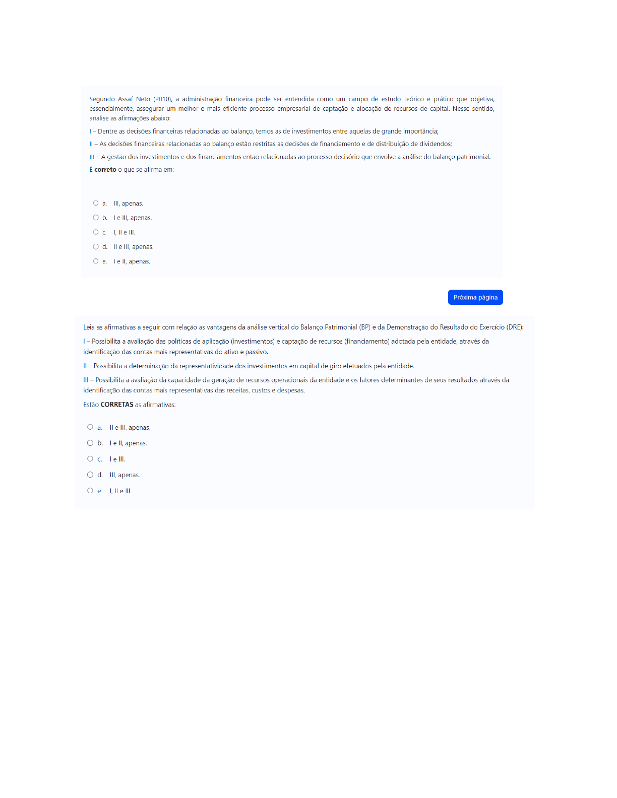 <p>Segundo Assaf Neto (2010), a administração financeira pode ser entendida como um campo de estudo teórico e prático que objetiva, essencialmente, assegurar um melhor e mais eficiente processo empresarial de captação e alocação de recursos de capital. Nesse sentido, analise as afirmações abaixo: - Dentre as decisões financeiras relacionadas ao balanço, temos as de investimentos entre aquelas de grande importância; As decisões financeiras relacionadas ao balanço estão restritas as decisões de financiamento e de distribuição de dividendos; III - A gestão dos investimentos e dos financiamentos então relacionadas ao processo decisório que envolve a análise do balanço patrimonial. É correto o que se afirma em: a. III, apenas. b. I III, apenas. C. I, e III. d. II e III, apenas. e. I e II, apenas. Próxima página Leia as afirmativas a seguir com relação as vantagens da análise vertical do Balanço Patrimonial (BP) e da Demonstração do Resultado do Exercício (DRE): - Possibilita a avaliação das políticas de aplicação (investimentos) e captação de recursos (financiamento) adotada pela entidade, através da identificação das contas mais representativas do ativo e passivo. II - Possibilita a determinação da representatividade dos investimentos em capital de giro efetuados pela entidade. III - Possibilita a avaliação da capacidade da geração de recursos operacionais da entidade e os fatores determinantes de seus resultados através da identificação das contas mais representativas das receitas, custos e despesas Estão CORRETAS as afirmativas: a. e III, apenas. b. I e II, apenas. C. e III. d. III, apenas. e. I, II e III.</p><p>Leia as afirmativas a seguir com relação as vantagens da análise vertical do Balanço Patrimonial (BP) e da Demonstração do Resultado do Exercício (DRE): I - Possibilita a avaliação das políticas de aplicação (investimentos) e captação de recursos (financiamento) adotada pela entidade, através da identificação das contas mais representativas do ativo e passivo. II - Possibilita a determinação da representatividade dos investimentos em capital de giro efetuados pela entidade. III Possibilita a avaliação da capacidade da geração de recursos operacionais da entidade e os fatores determinantes de seus resultados através da identificação das contas mais representativas das receitas, custos e despesas. Estão CORRETAS as afirmativas: a. III. b. II III, apenas. C. III, apenas. d. e. II, apenas. A gestão financeira, entre outras prerrogativas, requer que sejam feitas as análises das demonstrações e, adicionalmente, a utilização de diversos índices. Estes são essenciais para o processo da tomada de decisão. É comum que as empresas que utilizam estas ferramentas tenham bases já definidas, de acordo com o setor em que atuam. Isto permite, por exemplo, que elas entendam como estão e ainda que observem a concorrência. Analise as assertivas a seguir, em seguida, escolha a alternativa que corretamente caracteriza a técnica: a. A análise vertical é elaborada apenas com base no Balanço Patrimonial. b. A análise vertical compara os valores do mesmo período. C. A análise horizontal precisa de um período. d. A análise horizontal é feita com base trimestral. e. A análise vertical precisa de dois ou mais períodos. Balanço Patrimonial tem a função básica de evidenciar o Patrimônio de uma entidade, cujo modelo é dividido em duas partes que estão diretamente relacionadas pela equação (Ativo = Passivo + Patrimônio Líquido). Nesse contexto, os saldos das contas do Balanço Patrimonial de uma determinada entidade, em determinada data, estão apresentados a seguir: Empréstimos a pagar R$ 150.000 Estoque de mercadorias R$ 250.000 Notas promissórias a pagar R$ 60.000 Imóveis em uso R$ $ 470.000 Bancos conta movimento R$ 90.000 Capital Social R$ 600.000 Duplicatas a receber - R$ 330.000 Salários a pagar R$ 170.000 Com base nos dados disponibilizados, determine o valor total dos recursos de terceiros e selecione a alternativa correta:</p><p>a. 380.000 O b. 240.000 210.000 d. 450.000 e. 600.000 Limpar minha escolha A análise horizontal e vertical é a forma mais comum de expressar a Análise de Demonstrações É por meio desse método que serão identificadas variações importantes que servirão como base para interpretação dos Demonstrativos Financeiros. Nesse sentido, calcule os percentuais e marque a opção correta: 2021 AV AH 2020 AV Ativo circulante R$150.000,00 R$135.000,00 Caixa e equivalentes R$15.000,00 R$5.000,00 Clientes R$100.000,00 R$80.000,00 Estoque R$35.000,00 R$50.000,00 Ativo não circulante R$360.000,00 R$350.000,00 Realizável a longo prazo R$30.000,00 R$40.000,00 Investimentos R$50.000,00 R$50.000,00 Imobilizado R$200.000,00 R$180.000,00</p><p>Intangível R$80.000,00 R$80.000,00 Ativo total R$510.000,00 R$485.000,00 - Podemos afirmar que o imobilizado é a conta mais representativa de 2021. II - o grupo Ativo Não Circulante sofreu uma variação de 4,9% entre os exercícios de 2020 e 2021. III - Em 2021, as contas de curto prazo representam 29,4% do ativo total. É correto o que se afirma em: a. I e II, apenas. b. III, apenas. C. II e III, apenas. d. Todas as alternativas estão corretas e. I e III, apenas. Limpar minha escolha Considerando que o passivo total de 2021 foi de R$ 610.000,00 e em 2020 foi de R$ 525.000,00, calcule os percentuais da análise vertical e horizontal do grupo do Passivo Circulante e marque a opção correta. 2021 2020 Fornecedores R$ 110.000,00 R$ 80.000,00 Salários a pagar R$ 150.000,00 R$ 180.000,00 Impostos a pagar R$ 22.000,00 R$ 31.000,00 Empréstimo CP R$ 12.000,00 R$ - I - A análise vertical de 2021 da conta de salários a pagar foi de 25%. II - A análise vertical de 2020 da conta impostos a pagar foi de 6%. III - A análise horizontal dos fornecedores foi de 27,50%. É correto o que se afirma em: a. I e II, apenas. b. I e III, apenas.