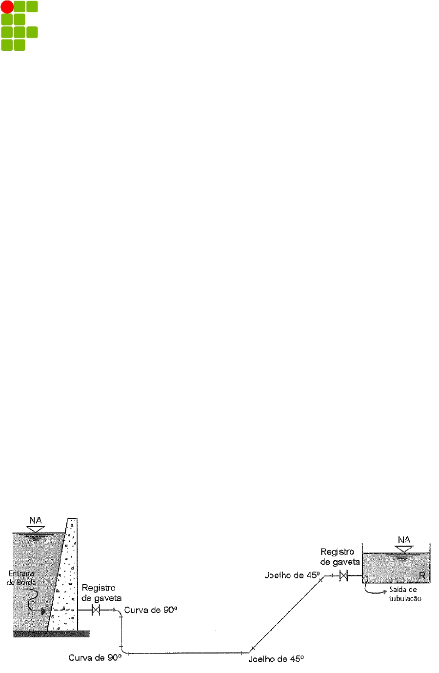 <p>INSTITUTO FEDERAL DE EDUCAÇÃO CIÊNCIA E TENCNOLOGIA DE PERNAMBUCO</p><p>DEPARTAMENTO DE INFRA- ESTRTRUTURA E CONSTRUÇÃO CIVIL</p><p>DISCIPLINA – HIDRÁULICA</p><p>1</p><p>NOME:______________________________________________________________________</p><p>MATRÍCULA: ______________________________ DATA _________________________</p><p>ATIVIDADE 2</p><p>1º) Utilize a fórmula Universal de perda de carga para estimar a perda de carga em uma tubulação de Ferro</p><p>Fundido de 200 mm, com 100 metros de comprimento, e que conduz água a uma vazão de 221,76 m3/h.</p><p>Considere: rugosidade específica do Ferro Fundido () = 0,25 mm; Água na Temperatura de 20ºC - = 10-6</p><p>m2/s;</p><p>2º) Uma adutora fornece a vazão de 150 l/s, através de uma tubulação de aço soldado, revestido com</p><p>esmalte diâmetro de 400 mm e 2 Km de extensão. Determinar a perda de carga na tubulação por meio da</p><p>equação de Hazen-Williams.</p><p>3º) A tubulação de PVC, com 200 metros de comprimento e 100 mm de diâmetro, transporta água para um</p><p>reservatório a vazão de 12 l/s. No conduto há algumas conexões e aparelhos que estão mostrados na figura</p><p>abaixo, pede-se calcular:</p><p>a) Perda de carga contínua</p><p>b) Soma das perdas de cargas locais e sua porcentagem em relação a perda de carga contínua;</p><p>c) Perda de carga total</p><p>INSTITUTO FEDERAL DE EDUCAÇÃO CIÊNCIA E TENCNOLOGIA DE PERNAMBUCO</p><p>DEPARTAMENTO DE INFRA- ESTRTRUTURA E CONSTRUÇÃO CIVIL</p><p>DISCIPLINA – HIDRÁULICA</p><p>2</p><p>5º) Uma adutora que interliga dois reservatórios cuja diferença de nível é 15 metros Esta adutora é</p><p>composta por dois trechos ligados em série sendo o primeiro de 1000 metros de extensão e diâmetro de</p><p>400 mm e outro de 800 metros de comprimento e 300 mm de diâmetro, ambos os trechos com coeficiente</p><p>de perda de carga da fórmula Universal igual a 0,020. Desconsiderando as perdas de cargas localizadas.</p><p>Determine:</p><p>a) a vazão escoada na adutora;</p><p>b) a perda de carga contínua em cada trecho</p>