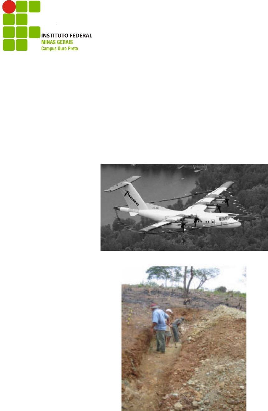 <p>Apostila de Pesquisa Mineral</p><p>INSTITUTO FEDERAL DE CIÊNCIA, EDUCAÇÃO E TECNOLOGIA DE</p><p>MINAS GERAIS – CAMPUS OURO PRETO</p><p>APOSTILA DE PESQUISA MINERAL</p><p>FELIPE DE ORQUIZA MILHOMEM</p><p>3º BIMESTRE DE 2012</p><p>Apostila de Pesquisa Mineral</p><p>2</p><p>Felipe de Orquiza Milhomem</p><p>1. PROSPECÇÃO DE SUPERFÍCIE – PROSPECÇÃO COM MARTELO</p><p>Uma vez que se tenham iniciado os trabalhos de pesquisa, o responsável deve se</p><p>encarregar de direcionar os trabalhos para etapas de maior detalhamento, como a</p><p>sondagem. Antes do aprofundamento em técnicas mais detalhadas, entretanto, é</p><p>realizada a pesquisa com técnicas de superfície e subsuperfície.</p><p>Tais técnicas incluem a prospecção com martelo, por poços e trincheiras,</p><p>geofísica, entre outras.</p><p>A prospecção com martelo é utilizada como etapa preliminar, permitindo a</p><p>observação de afloramentos e características gerais do terreno. Pode também ser</p><p>utilizada na etapa de elaboração do mapa geológico. Em geral, a experiência do</p><p>pesquisador conta muito nesta etapa.</p><p>Nesta etapa, a pesquisa é realizada através da busca por indícios de</p><p>mineralizações. Esses indícios podem ser:</p><p>• toponímia nas cartas topográficas,</p><p>• geomorfologia,</p><p>• vegetação,</p><p>• coloração de solos,</p><p>• minerais guias e</p><p>• gossans.</p><p>A toponímia (topo [lugar] + nímia [nome]) estuda nomeação de locais que</p><p>possam identificar existência de mineralizações pré-conhecidas. Exemplos = faisqueira:</p><p>lugar onde se encontram restos de cascalho; grupiara: cascalho encontrado em topo de</p><p>morros; altos do Nordeste brasileiro: presença de quartzo; córrego do ouro, etc.</p><p>As características das rochas também auxiliam na identificação de</p><p>mineralizações. Pode ser realizada, por exemplo, observação dos aspectos morfológicos</p><p>da área. Afloramentos promissores percebidos por isso podem ser, por exemplo, cristas</p><p>de morros silicificadas e gossans [chapéus de ferro]. Gossans ou Chapéu de Ferro são</p><p>rochas que originalmente continham sulfetos e que foram submetidas a um processo de</p><p>alteração supergênica. A cor avermelhada é uma característica importante dos Gossans.</p><p>Ela se debe a transformação de sulfetos originais ricos em ferro em compostos</p><p>Apostila de Pesquisa Mineral</p><p>3</p><p>Felipe de Orquiza Milhomem</p><p>oxidados. Os Gossans são o resultado da alteração física e química das rochas como</p><p>conseqüência da ação de agentes como a chuva, o vento, sol ou as águas subterrâneas.</p><p>Esses processos produzem a alteração dos sulfetos, dissolução e precipitação de outros</p><p>minerais e uma importante lixiviação nas rochas.</p><p>A formação de um Gossan depende de fatores distintos, como a paragênese</p><p>original dos sulfetos, clima, relevo, tipo de rocha encaixante, nível freático, etc.</p><p>Ocorrências de gossan são importantes pois indicam a possível existência de minério</p><p>em profundidade.</p><p>Exemplo de formação de Gossan.</p><p>Gossans indicam presença de ferro em profundidade.</p><p>Apostila de Pesquisa Mineral</p><p>4</p><p>Felipe de Orquiza Milhomem</p><p>Cada tipo de rocha apresenta um padrão próprio de topografia, vegetação,</p><p>drenagem e solo. Este padrão poderá se diversificar substancialmente com pequenas</p><p>alterações de composição mineralógica da rocha, mas, por outro lado, rochas bem</p><p>diferentes poderão ter padrões semelhantes.</p><p>Observação de plantas também pode demonstrar a presença de mineralizações.</p><p>planta violácea calamina se desenvolve sobre alguns depósitos de zinco. Fosfato é</p><p>nutriente de plantas. Plantas exuberantes podem indicar presença de fosfato no local.</p><p>1.1 DICAS</p><p>Algumas dicas sobre o procedimento a ser adotado para as anotações de campo,</p><p>para que se tenha o maior detalhamento possível dos dados coletados é colocada a</p><p>seguir:</p><p>Os dados de campo são registrados em uma caderneta de campo cuja capa deve</p><p>ser dura tanto para proteção quanto para auxiliar na tomada de medidas de camadas com</p><p>a bússola. As dimensões aproximadas são de 15x20cm. As folhas devem ser, de</p><p>preferência, quadriculadas em tom cinza esmaecido facilitando o desenho esquemático</p><p>de afloramentos e de seções geológicas.</p><p>Anote o roteiro de cada percurso e os valores de quilometragem se o mesmo for</p><p>realizado com jipe. A descrição dos dados é, normalmente, puntual: descreve-se</p><p>afloramento por afloramento e estes são numerados sequencialmente na caderneta. Esta</p><p>descrição é acompanhada de seções (perfis longitudinais) e colunas (empilhamento de</p><p>camadas) geológicas esquemáticas correspondentes a cada percurso ou local.</p><p>Apostila de Pesquisa Mineral</p><p>5</p><p>Felipe de Orquiza Milhomem</p><p>A linguagem deve ser clara, direta, sem palavras desnecessárias. Frases curtas</p><p>facilitam a compreensão do assunto. Evite usar termos rebuscados que dificultem o</p><p>entendimento. O uso de abreviaturas nas descrições de afloramento é fato corriqueiro ao</p><p>se buscar ganhar tempo e espaço na caderneta. Procure manter, entretanto, uma</p><p>padronização de abreviaturas para que a caderneta não se torne um amontoado</p><p>hieroglífico incompreensível para colegas que trabalham na equipe ou para quem vai</p><p>transcrever as informações para banco de dados em computador.</p><p>Na 1a página da caderneta, além do nome do responsável, coloque o telefone de</p><p>contato (se a caderneta for extraviada esta informação é importante), a empresa, a</p><p>campanha de campo ou o projeto, a data de início (e fim) do serviço, a lista de</p><p>abreviaturas (se não seguirem um padrão), a declinação magnética usada na bússola e</p><p>outros dado