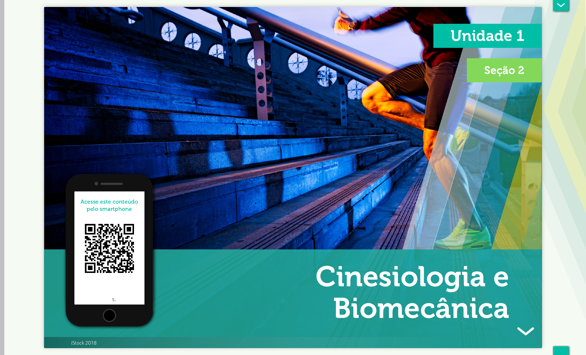 <p>Unidade 1</p><p>Seção 2</p><p>iStock 2018</p><p>Cinesiologia e</p><p>Biomecânica</p><p>1. Acesse a loja de</p><p>aplicativos do seu</p><p>smartphone e baixe</p><p>um leitor de QR CODE.</p><p>2. Abra o leitor e</p><p>fotografe o código.</p><p>3. Você será</p><p>direcionado a este</p><p>conteúdo.</p><p>Bons estudos!</p><p>Acesse este conteúdo</p><p>pelo smartphone</p><p>O que é isso?</p><p>Clique no código e saiba</p><p>mais.</p><p>1</p><p>Webaula 2</p><p>Conceitos cinemáticos do</p><p>movimento humano</p><p>Nesta webaula conheceremos a cinemática,</p><p>sua divisão e quais são suas formas de</p><p>avaliação.</p><p>Fonte:<https://goo.gl/CVDvMy>. Acesso em: 31 out. 2017.</p><p>2</p><p>Segundo McGinnis (2012), a cinemática pode</p><p>ser entendida como a parte da dinâmica</p><p>relacionada à descrição do movimento. Assim,</p><p>podemos compreender a importância das</p><p>principais informações que acompanhamos em</p><p>eventos esportivos.</p><p>A cinemática pode ser dividida em duas formas,</p><p>a saber:</p><p>Cinemática linear</p><p>Cinemática angular</p><p>3</p><p>As classificações cinemática linear e cinemática angular possuem relação com os conceitos de</p><p>movimento linear e movimento angular.</p><p>O movimento linear está relacionado com o movimento ao longo de um trajeto (retilíneo ou curvilíneo), no qual</p><p>as partes do corpo não apresentam movimentação entre si. E a cinemática linear está relacionada com o</p><p>movimento linear.</p><p>No movimento angular, as partes do corpo não apresentam a mesma distância de movimento durante um</p><p>período de tempo. A cinemática angular provém do movimento angular.</p><p>4</p><p>Formas de avaliação na</p><p>cinemática</p><p>A análise cinemática pode auxiliar na</p><p>compreensão de movimentos específicos,</p><p>identificação de erros, avaliações quantitativas</p><p>ou qualitativas, avaliação postural, entre outros.</p><p>iStock 20185</p><p>Fotogrametria</p><p>Cinemetria</p><p>Essas análises podem ser realizadas a partir do registro de imagens, podendo consistir na</p><p>fotogrametria ou cinemetria. Clique nas abas e saiba mais sobre esses tipos de análise.</p><p>Obtenção de informações das</p><p>pessoas a partir do registro e das</p><p>interpretações de imagens. Este</p><p>método é muito utilizado para</p><p>identificação de possíveis desvios</p><p>posturais. Normalmente, é realizado</p><p>com uma câmera fotográfica.</p><p>Fonte: Moura (2016, p. 64).</p><p>6</p><p>Na cinemetria, a frequência da imagem deve</p><p>estar de acordo com a frequência natural em</p><p>que ocorre o movimento. Os sistemas mais</p><p>utilizados são aqueles baseados no</p><p>processamento digital, ou seja, registro em</p><p>vídeo, e processamento e interpretação</p><p>mediante softwares no computador. Fatores</p><p>como o número e o posicionamento das</p><p>câmeras, luminosidade do ambiente,</p><p>frequência de registro da imagem e</p><p>familiarização com o sistema podem</p><p>influenciar as análises.</p><p>iStock 20187</p><p>Nesta webaula você relembrou os conceitos de</p><p>movimento linear e movimento angular e</p><p>conheceu as classificações cinemática linear,</p><p>cinemática angular e formas de avaliação na</p><p>cinemática.</p><p>Fonte:<https://goo.gl/CVDvMy>. Acesso em: 31 out. 2017.</p><p>8</p><p>Android:</p><p>https://goo.gl/yAL2Mv</p><p>iPhone e iPad - IOS:</p><p>https://goo.gl/OFWqcq</p><p>Aqui você tem na palma da sua mão a biblioteca digital para</p><p>sua formação profissional.</p><p>Estude no celular, tablet ou PC em qualquer hora e lugar</p><p>sem pagar mais nada por isso.</p><p>Mais de 450 livros com interatividade, vídeos, animações e</p><p>jogos para você.</p><p>Você já conhece o Saber?</p><p>9</p><p>Bons estudos!</p><p>10</p>