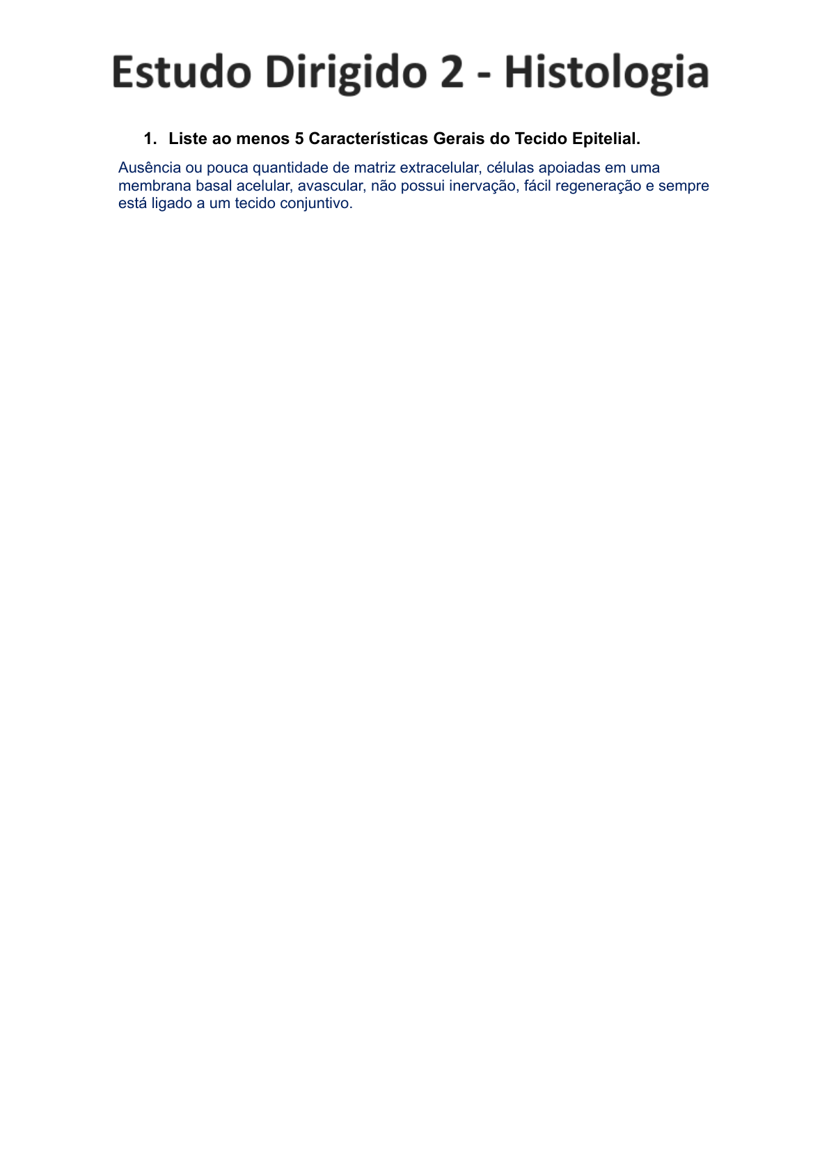 <p>1. Liste ao menos 5 Características Gerais do Tecido Epitelial.</p><p>Ausência ou pouca quantidade de matriz extracelular, células apoiadas em uma</p><p>membrana basal acelular, avascular, não possui inervação, fácil regeneração e sempre</p><p>está ligado a um tecido conjuntivo.</p><p>2. Defina e caracterize Lâmina Basal.</p><p>A lâmina basal é uma camada de glicoproteínas (laminina, colágeno do tipo IV e</p><p>entactina) e proteoglicanas secretadas pelas células epiteliais, que, como o nome diz,</p><p>se situa na base do tecido. A lâmina basal permite a adesão entre o epitélio e o tecido</p><p>conjuntivo e é uma barreira de filtração seletiva para as substâncias que se</p><p>movimentam entre esses dois tecidos. Ela influencia a diferenciação e a proliferação</p><p>das células epiteliais. Quando as células perdem o contato com a lâmina basal, elas</p><p>morrem: sofrem apoptose. A lâmina basal serve ainda de apoio para a migração</p><p>durante o desenvolvimento embrionário e a regeneração.</p><p>3. Sobre as especializações de membrana defina e diferencie:</p><p>a) Cílios</p><p>Os cílios são especializações celulares, comumente mais longas e de maior calibre</p><p>que as microvilosidades. Essas projeções apicais são estáveis, sendo preenchidas e</p><p>sustentadas por um complexo arranjo de microtúbulos (MT) e várias proteínas</p><p>associadas, formando o chamado axonema do cílio.</p><p>b) Microvilosidades</p><p>São projeções da membrana plasmática frequentemente digitiformes, ou seja, em</p><p>forma de dedo de luva. São especializações do tipo estável ou permanente na</p><p>superfície das células. Estas projeções são sustentadas por citoesqueleto</p><p>polimerizado por proteína actina, os microfilamentos. Sua ocorrência é</p><p>predominantemente apical nas células epiteliais, mas podem, eventualmente, ocorrer</p><p>nas regiões laterais de células polarizadas. As microvilosidades ampliam a superfície</p><p>da membrana plasmática aumentando sua eficiência para as trocas com a cavidade</p><p>ou o meio extracelular.</p><p>c) Esteriocílios</p><p>Os estereocílios são microvilosidades especializadas cuja estrutura, citoesqueleto de</p><p>preenchimento e ancoragem são idênticos ao de uma microvilosidade comum, no</p><p>entanto, podem ainda revelar algumas características distintas. Seu comprimento e</p><p>calibre podem assemelhar-se aos cílios móveis, ou mostrarem ramificações. Por</p><p>causa das eventuais semelhanças com os cílios, mas sem realizarem os movimentos</p><p>ritmados destes, foram então denominados “falsos cílios” ou estereocílios. Essas</p><p>projeções têm ocorrência em epitélios absortivos e secretores, como o do epidídimo e</p><p>canal deferente no sistema reprodutor masculino.</p><p>4. Defina e diferencie um tecido epitelial de revestimento de tecido</p><p>epitelial glandular.</p><p>Tecido epitelial de revestimento – A justaposição das células epiteliais permite a</p><p>formação de camadas celulares contínuas que revestem superfícies, como a</p><p>superfície externa do corpo, a superfície dos órgãos, das cavidades, dos vasos ou dos</p><p>ductos. O epitélio de revestimento é classificado segundo a forma das células e o</p><p>número de camadas celulares. A morfologia da célula está relacionada à sua função e</p><p>é determinada por fatores extrínsecos e intrínsecos, como, por exemplo, pressões</p><p>externas, organização do citoesqueleto, quantidade de citoplasma e de organelas e</p><p>acúmulo de produtos de reserva ou secreção.</p><p>Tecido epitelial glandular – Em alguns epitélios de revestimento, há a presença de</p><p>células secretoras que são consideradas glândulas unicelulares, como as células</p><p>caliciformes no epitélio dos intestinos e da traqueia. A necessidade de uma quantidade</p><p>maior de secreção é suprida por um aumento da área do epitélio secretor com a sua</p><p>invaginação, o seu enovelamento ou a sua ramificação, formando as glândulas</p><p>pluricelulares.Elas podem ser envolvidas por uma cápsula de tecido conjuntivo que</p><p>emite septos, dividindo-as em lobos, que, por sua vez, são subdivididos em unidades</p><p>menores, os lóbulos. Através dos septos, vasos sanguíneos e fibras nervosas</p><p>penetram na glândula.</p><p>5. Caracterize as classificações do tecido epitelial de revestimento:</p><p>a) Quanto ao número de estratos (simples, estratificado,</p><p>pseudoestratificado)</p><p>Se houver somente uma camada de células, o epitélio é dito simples. Se houver mais</p><p>de uma, estratificado. Se as células de um epitélio simples forem pavimentosas, ele é</p><p>denominado epitélio simples pavimentoso, como é o caso do revestimento dos vasos</p><p>sanguíneos; se forem cúbicas, epitélio simples cúbico, que constitui, por exemplo, os</p><p>túbulos renais, e se forem colunares (prismáticas ou cilíndricas), epitélio simples</p><p>colunar (prismático ou cilíndrico), como o dos intestinos. Um tipo especial de epitélio</p><p>simples é o epitélio pseudoestratificado. Todas as células apoiam-se na lâmina basal,</p><p>mas possuem diferentes tamanhos: células baixas, que são as basais, e células mais</p><p>altas, colunares. Os núcleos estão, portanto, em diferentes alturas, lembrando o</p><p>epitélio estratificado. Epitélio pseudoestratificado colunar com estereocílios é</p><p>encontrado no trato reprodutor masculino, como, por exemplo, no epidídimo, e epitélio</p><p>pseudoestratificado colunar ciliado com células caliciformes é encontrado nas vias</p><p>respiratórias, como na traqueia.</p><p>b) Quanto ao formato da célula (pavimentoso, cúbico, cilíndrico)</p><p>Quando a largura e o comprimento da célula são maiores que a altura, a célula é dita</p><p>pavimentosa. Quando a altura é igual à largura e ao comprimento, ela é denominada</p><p>cúbica. Quando a altura 