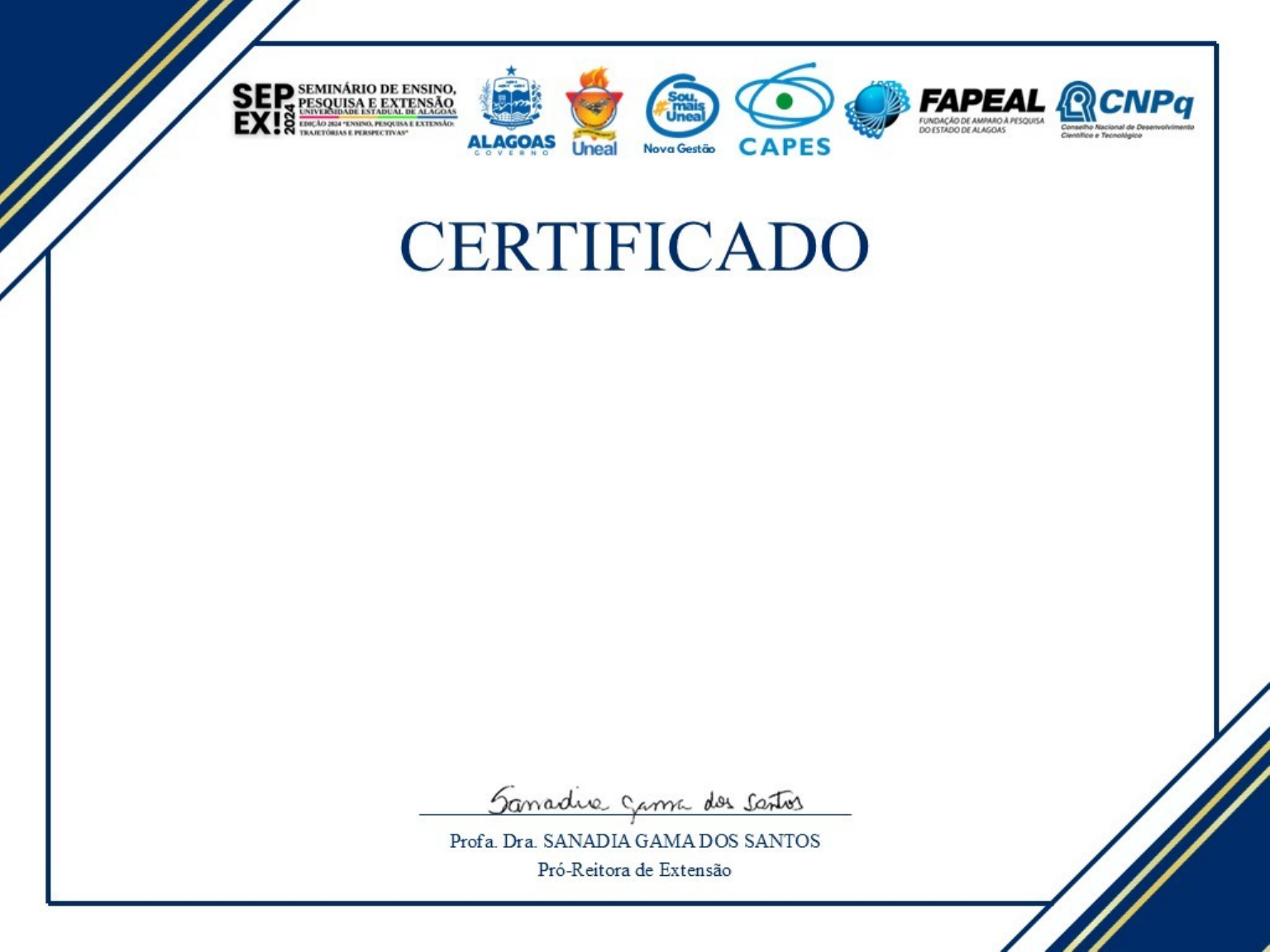 <p>Certificamos, para os devidos fins, que MOISÉS SANTOS SOUZA atuou como</p><p>participante do evento de extensão “Roda de Conversa sobre Programas e</p><p>projetos de extensão”, durante o VI Seminário de ensino, pesquisa e extensão -</p><p>SEPEX - UNEAL - 2024, realizado pela Universidade Estadual de Alagoas -</p><p>UNEAL, no dia 08 de agosto de 2024, com carga horária de 3h.</p><p>Arapiraca/AL, 21 de agosto de 2024.</p><p>Slide 1</p>