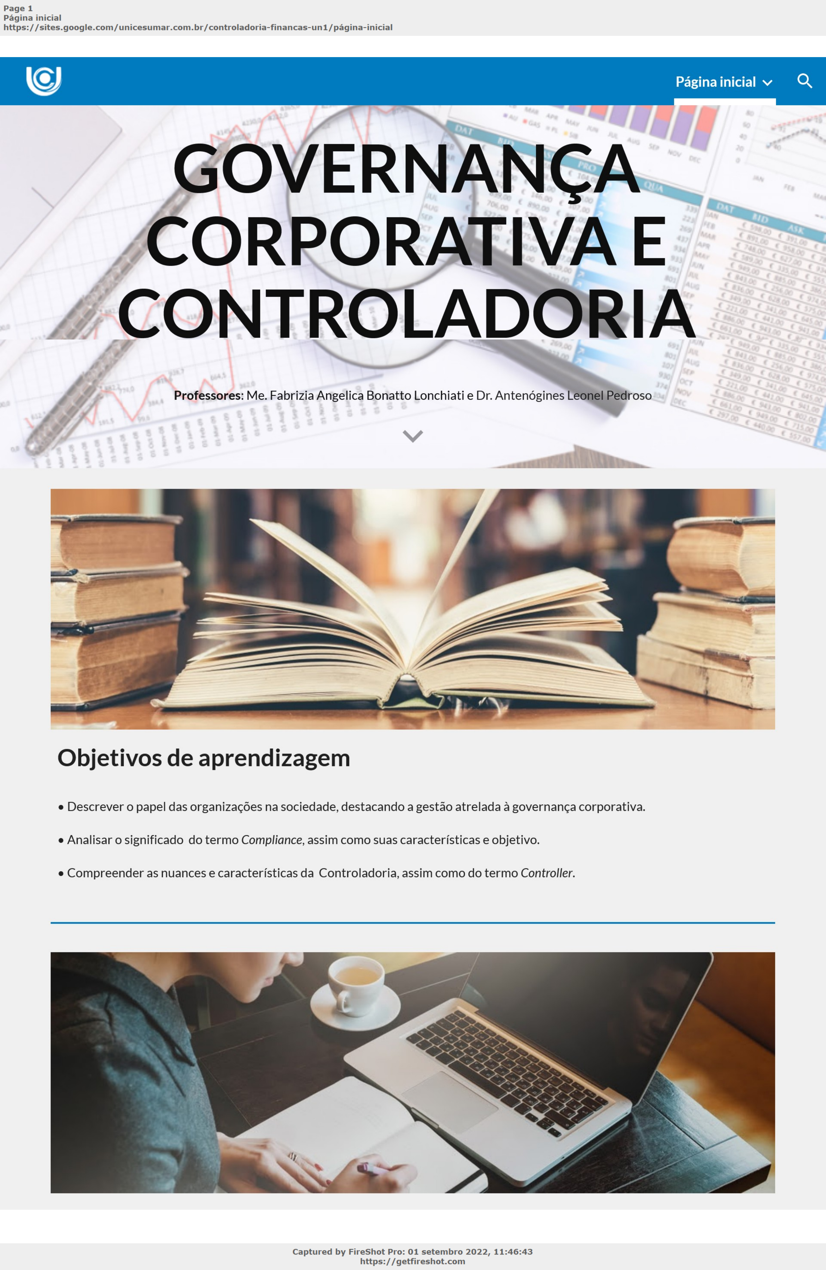 <p>Página inicial</p><p>Pular para o conteúdo principal Pular para a navegação</p><p>GOVERNANÇA</p><p>CORPORATIVA E</p><p>CONTROLADORIA</p><p>Professores : Me. Fabrizia Angelica Bonatto Lonchiati e Dr. Antenógines Leonel Pedroso</p><p>Objetivos de aprendizagem</p><p>• Descrever o papel das organizações na sociedade, destacando a gestão atrelada à governança corporativa.</p><p>• Analisar o significado do termo Compliance , assim como suas características e objetivo.</p><p>• Compreender as nuances e características da Controladoria, assim como do termo Controller .</p><p>https://sites.google.com/unicesumar.com.br/controladoria-financas-un1/p�gina-inicial</p><p>https://getfireshot.com</p><p>https://sites.google.com/unicesumar.com.br/controladoria-financas-un1/p%C3%A1gina-inicial</p><p>https://sites.google.com/unicesumar.com.br/controladoria-financas-un1/p%C3%A1gina-inicial</p><p>Plano de estudo</p><p>A seguir, apresentam-se os tópicos que você estudará nesta unidade:</p><p>• Governança Corporativa</p><p>• Compliance</p><p>• A Controladoria e o Controller</p><p>Introdução</p><p>As empresas estão em um ambiente em que necessitam garantir sua sobrevivência, continuidade e crescimento, e buscam cumprir</p><p>sua missão por meio do atendimento às demandas que são impostas. Isso conduz seus executivos a pensarem e agirem ao planejar</p><p>o futuro e na maneira como coordenarão seus negócios num ambiente de Governança e Compliance .</p><p>Prezado(a) estudante, vamos estudar, neste material, a base de toda corporação, a Governança, a Conformidade e o Controle!</p><p>Dessa base derivam todas as ações das partes envolvidas com a corporação e que a conduzem para a proteção de valor criado em</p><p>sua trajetória com o cumprimento de sua missão: o seu negócio. Para tanto, precisamos compreender as ideias basilares quando</p><p>falamos de gestão e, também, as características gerais sobre Governança Corporativa.</p><p>Desta feita, vamos estudar o que é Governança Corporativa e a importância da adoção de boas práticas na gestão de uma</p><p>corporação que tem o foco nos interesses das pessoas de diferentes níveis, sejam elas acionistas, sócios, donos, diretores,</p><p>gerentes, funcionários, clientes, fornecedores e outros.</p><p>Abordaremos, em seguida, um tema essencial para as corporações: Compliance . O assunto difunde a ideia de que todo arcabouço</p><p>regulatório deve ser cumprido. Sua origem está no verbo em inglês “ to cumply with ”, que para nós significa “cumprir com”. O foco</p><p>será destacar que Compliance é um estado de conformidade com as normas internas e externas, que visam proteger a empresa do</p><p>risco de descontinuidade. Trata-se de uma tema muito em voga na atualidade, ensejando, inclusive, mudanças na legislação pátria,</p><p>que veremos ao longo da presente unidade.</p><p>Em seguida, trataremos sobre a controladoria, veremos que é uma derivação da palavra “controle” e que este controle só existe em</p><p>uma situação de acompanhamento para verificação dos resultados efetivos comparados com aqueles que foram planejados.</p><p>Veremos também a missão, objetivos, filosofia, funções, elementos e instrumentos da controladoria, bem como a contribuição que</p><p>ela recebe de diversas ciências: economia, psicologia e outras, esclarecendo também sobre a influência da contabilidade.</p><p>Ao final, será possível identificar algumas características sobre o controller . O que consiste? De quem estamos falando? Quais as</p><p>atribuições? Em linhas gerais, estamos falando do executivo da controladoria , mas precisamos analisar, dentre outros aspectos, os</p><p>requisitos, princípios e funções desse profissional.</p><p>Bons estudos!</p><p>Avançar</p><p>UNICESUMAR | UNIVERSO EAD</p><p>https://sites.google.com/unicesumar.com.br/controladoria-financas-un1/p�gina-inicial</p><p>https://getfireshot.com</p><p>https://sites.google.com/unicesumar.com.br/controladoria-financas-un1/p%C3%A1gina-inicial/unidade-1</p><p>Página inicial</p><p>Pular para o conteúdo principal Pular para a navegação</p><p>Governança Corporativa</p><p>Governança Corporativa é o sistema pelo qual as organizações são dirigidas, monitoradas e incentivadas, envolvendo as práticas e</p><p>os relacionamentos entre proprietários, conselho de administração, diretoria e órgãos de controle.</p><p>As boas práticas de Governança Corporativa convertem princípios em recomendações objetivas, alinhando interesses com a</p><p>finalidade de preservar e otimizar o valor da organização, facilitando seu acesso ao capital e contribuindo para a sua longevidade.</p><p>Definição</p><p>Na página da Comissão de Valores Mobiliários - CVM, pode-se encontrar uma espécie de cartilha com uma boa definição para</p><p>Governança Corporativa:</p><p>Governança corporativa é o conjunto de práticas que tem por finalidade otimizar o desempenho de uma</p><p>companhia ao proteger todas as partes interessadas, tais como investidores, empregados e credores,</p><p>facilitando o acesso ao capital (BRASIL, 2012, p. 1).</p><p>André Luiz Carvalhal da Silva destaca que "governança corporativa refere-se ao sistema pelo qual os órgãos e os poderes são</p><p>organizados dentro de uma empresa ( corporation )" (2014, on-line ).</p><p>Por consequência, podemos afirmar que o foco é otimizar o desempenho e proteger aquelas pessoas que têm interesse que os</p><p>negócios vão bem.</p><p>https://sites.google.com/unicesumar.com.br/controladoria-financas-un1/p�gina-inicial/unidade-1</p><p>https://getfireshot.com</p><p>https://sites.google.com/unicesumar.com.br/controladoria-financas-un1/p%C3%A1gina-inicial</p><p>https://sites.google.com/unicesumar.com.br/controladoria-financas-un1/p%C3%A1gina-inicial</p><p>https://sites.google.com/unicesumar.com.br/controladoria-financas-un1/p%C3%A1gina-inicial/unidade-1#h.9duk5e1evgi9</p