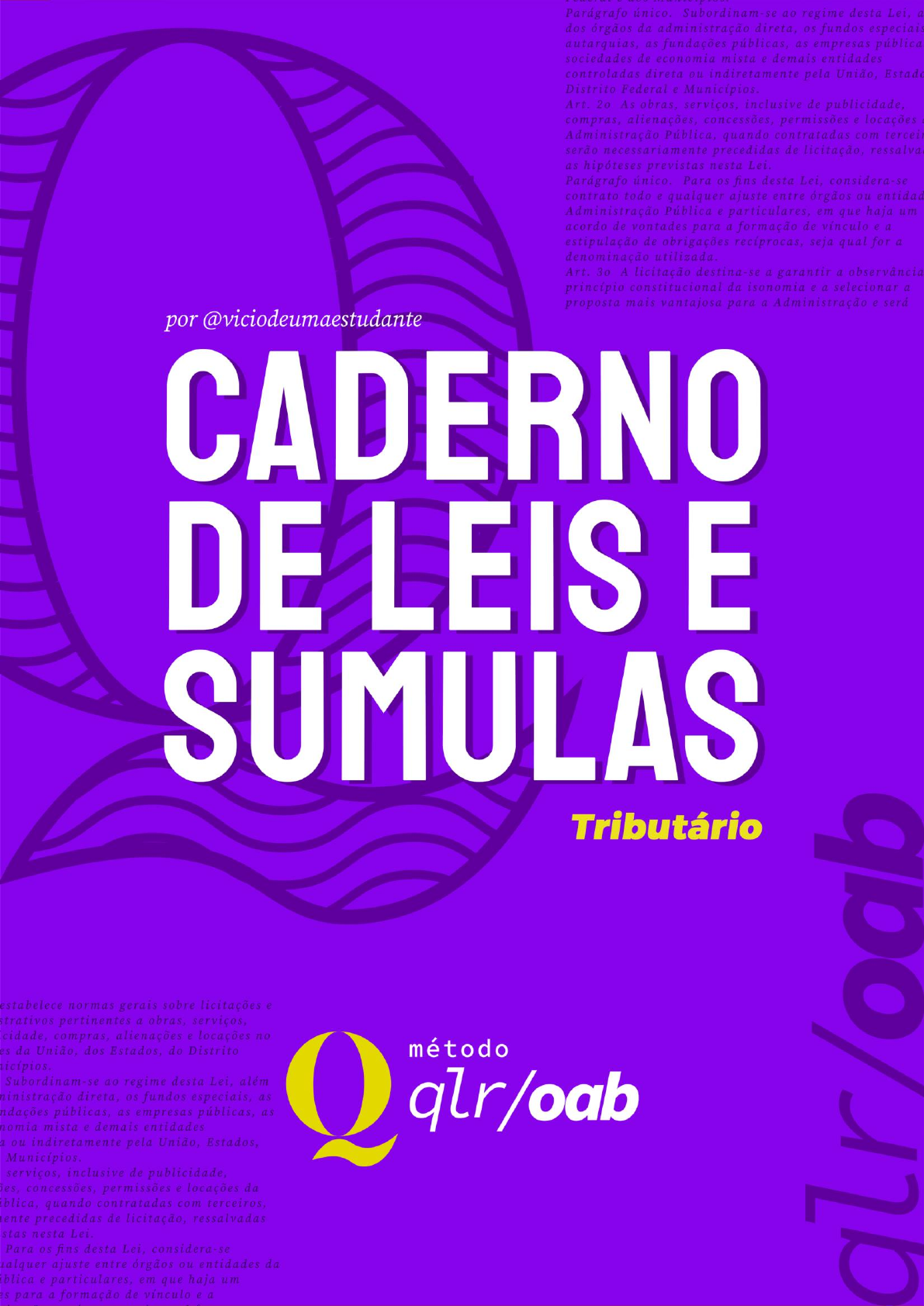 <p>- -</p><p>mailto:pedrosolaura462@gmail.com</p><p>Caderno de Legislação - Método QLR OAB</p><p>Atualizado para o 40º Exame de Ordem</p><p>Ana Clara Fernandes @viciodeumaesĒudanĒe</p><p>Material de uso individual. Proibido o repasse!</p><p>1</p><p>SUMÁRIO</p><p>COMPETÊNCIA TRIBUTÁRIA 2</p><p>PRINCÍPIOS TRIBUTÁRIOS 5</p><p>IMUNIDADES TRIBUTÁRIAS 8</p><p>CONCEITO DE TRIBUTO E ESPÉCIES TRIBUTÁRIAS 10</p><p>OBRIGAÇÃO TRIBUTÁRIA 14</p><p>RESPONSABILIDADE TRIBUTÁRIA 16</p><p>IMPOSTOS FEDERAIS 19</p><p>IMPOSTOS ESTADUAIS 21</p><p>IMPOSTOS MUNICIPAIS 24</p><p>CRÉDITO TRIBUTÁRIO 26</p><p>EXECUÇÃO FISCAL 32</p><p>- -</p><p>mailto:pedrosolaura462@gmail.com</p><p>Caderno de Legislação - Método QLR OAB</p><p>Atualizado para o 40º Exame de Ordem</p><p>Ana Clara Fernandes @viciodeumaesĒudanĒe</p><p>Material de uso individual. Proibido o repasse!</p><p>2</p><p>COMPETÊNCIA TRIBUTÁRIA</p><p>Art. 6 CTN A atribuição constitucional de competência tributária compreende a</p><p>competência legislativa plena, ressalvadas as limitações contidas na Constituição</p><p>Federal, nas Constituições dos Estados e nas Leis Orgânicas do Distrito Federal e dos</p><p>Municípios, e observado o disposto nesta Lei.</p><p>Parágrafo único. Os tributos cuja receita seja distribuída, no todo ou em parte, a outras</p><p>pessoas jurídicas de direito público pertencerá m competência legislativa daquela a que</p><p>tenham sido atribuídos.</p><p>Art. 7 CTN A competência tributária é indelegável, salvo atribuição das funções de</p><p>arrecadar ou fiscalizar tributos, ou de executar leis, serviços, atos ou decisões</p><p>administrativas em matéria tributária, conferida por uma pessoa jurídica de direito</p><p>público a outra, nos termos do § 3º do artigo 18 da Constituição.</p><p>§ 1º A atribuição compreende as garantias e os privilégios processuais que competem m</p><p>pessoa jurídica de direito público que conferir.</p><p>§ 2º A atribuição pode ser revogada, a qualquer tempo, por ato unilateral da pessoa</p><p>jurídica de direito público que a tenha conferido.</p><p>§ 3º Não constitui delegação de competência o cometimento, a pessoas de direito</p><p>privado, do encargo ou da função de arrecadar tributos.</p><p>Art. 8 CTN O não-exercício da competência tributária não a defere a pessoa jurídica de</p><p>direito público diversa daquela a que a Constituição a tenha atribuído.</p><p>Art. 146 CF. Cabe m lei complementar:</p><p>I - dispor sobre conflitos de competência, em matéria tributária, entre a União, os Estados,</p><p>o Distrito Federal e os Municípios;</p><p>II - regular as limitações constitucionais ao poder de tributar;</p><p>III - estabelecer normas gerais em matéria de legislação tributária, especialmente sobre:</p><p>*CAIU NA OAB 31*</p><p>a) definição de tributos e de suas espécies, bem como, em relação aos impostos</p><p>discriminados nesta Constituição, a dos respectivos fatos geradores, bases de cálculo e</p><p>contribuintes;</p><p>b) obrigação, lançamento, crédito, prescrição e decadência tributários; *CAIU NA OAB 31*</p><p>c) adequado tratamento tributário ao ato cooperativo praticado pelas sociedades</p><p>cooperativas.</p><p>d) definição de tratamento diferenciado e favorecido para as microempresas e para as</p><p>empresas de pequeno porte, inclusive regimes especiais ou simplificados no caso do</p><p>imposto previsto no art. 155, II, das contribuições previstas no art. 195, I e §§ 12 e 13, e da</p><p>contribuição a que se refere o art. 239.</p><p>Parágrafo único. A lei complementar de que trata o inciso III, d, também poderá instituir</p><p>um regime único de arrecadação dos impostos e contribuições da União, dos Estados, do</p><p>Distrito Federal e dos Municípios, observado que:</p><p>I - será opcional para o contribuinte;</p><p>- -</p><p>mailto:pedrosolaura462@gmail.com</p><p>Caderno de Legislação - Método QLR OAB</p><p>Atualizado para o 40º Exame de Ordem</p><p>Ana Clara Fernandes @viciodeumaesĒudanĒe</p><p>Material de uso individual. Proibido o repasse!</p><p>3</p><p>II - poderão ser estabelecidas condições de enquadramento diferenciadas por Estado;</p><p>III - o recolhimento será unificado e centralizado e a distribuição da parcela de recursos</p><p>pertencentes aos respectivos entes federados será imediata, vedada qualquer retenção ou</p><p>condicionamento;</p><p>IV - a arrecadação, a fiscalização e a cobrança poderão ser compartilhadas pelos entes</p><p>federados, adotado cadastro nacional único de contribuintes.</p><p>(COMPETÊNCIA CUMULATIVA EM TERRITÓRIO FEDERAL) Art. 147 CF/88 Competem m</p><p>União, em Território Federal, os impostos estaduais e, se o Território não for dividido em</p><p>Municípios, cumulativamente, os impostos municipais; ao Distrito Federal cabem os</p><p>impostos municipais.</p><p>(EMPRÉSTIMOS COMPULSÓRIOS) Art. 148 CF/88 A União, mediante lei complementar,</p><p>poderá instituir empréstimos compulsórios: *CAIU NA OAB 33*</p><p>I - para atender a despesas extraordinárias, decorrentes de calamidade pública, de guerra</p><p>externa ou sua iminência; *CAIU NA OAB 39*</p><p>II - no caso de investimento público de caráter urgente e de relevante interesse nacional,</p><p>observado o disposto no art. 150, III, "b".</p><p>Parágrafo único. A aplicação dos recursos provenientes de empréstimo compulsório será</p><p>vinculada m despesa que fundamentou sua instituição. *CAIU NA OAB 33*</p><p>(CONTRIBUIÇÕES SOCIAIS) Art. 149 CF/88 Compete exclusivamente m União instituir</p><p>contribuições sociais, de intervenção no domínio econômico e de interesse das categorias</p><p>profissionais ou econômicas, como instrumento de sua atuação nas respectivas áreas,</p><p>observado o disposto nos arts. 146, III, e 150, I e III, e sem prejuízo do previsto no art. 195, §</p><p>6º, relativamente ms contribui
