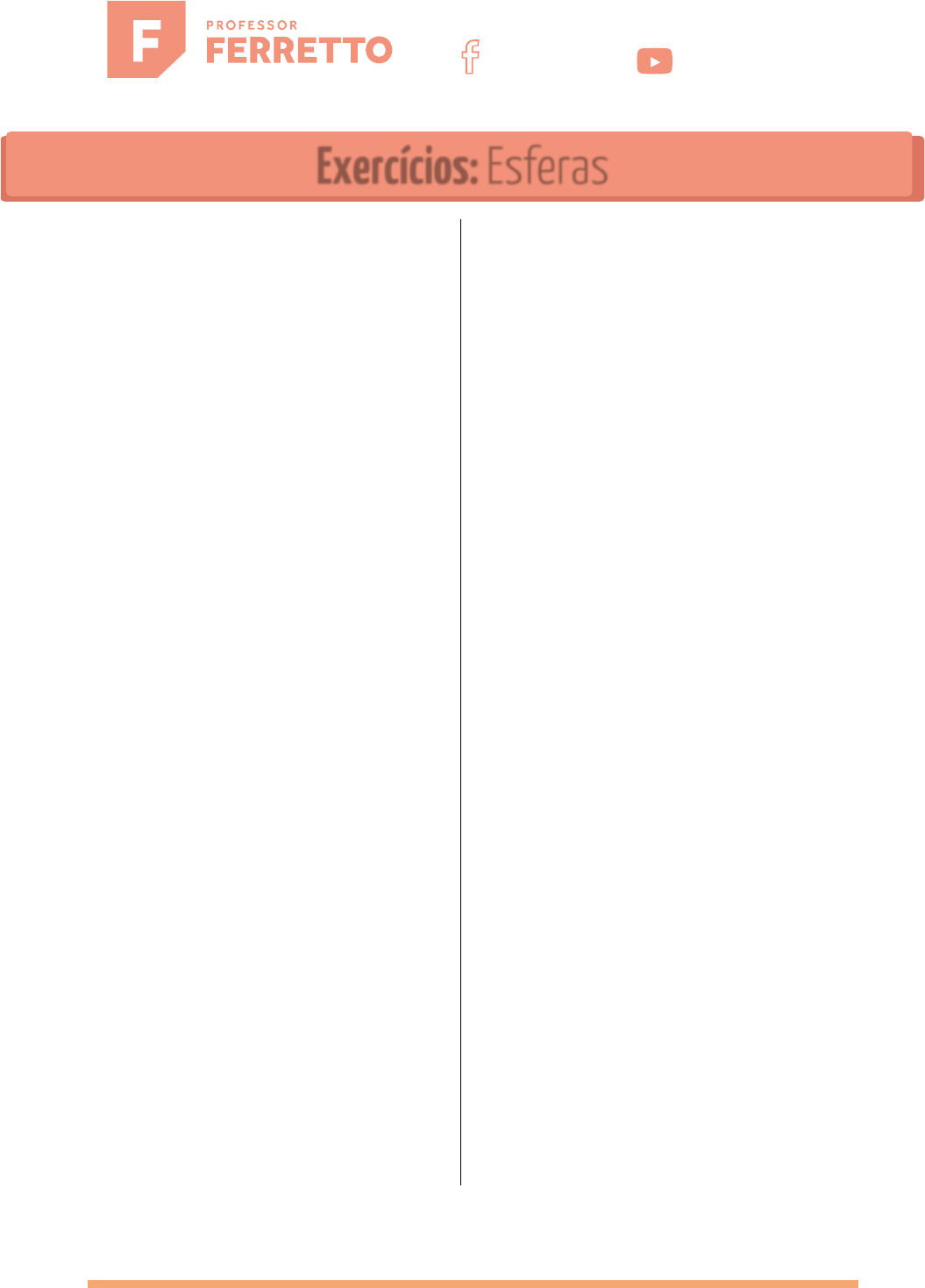 <p>1</p><p>1. Obtenha o raio de uma esfera, sabendo que</p><p>um plano determina na esfera um círculo de</p><p>raio 20 cm, sendo 21 cm a distância do plano</p><p>ao centro da esfera.</p><p>2. Determine o raio de uma esfera de superfície</p><p>36𝜋 𝑐𝑚2.</p><p>3. Calcule a área de uma secção plana feita a</p><p>uma distância de 12 cm do centro de uma</p><p>esfera de 37 cm de raio.</p><p>4. A secção plana de uma esfera feita a 35 cm do</p><p>centro tem 144𝜋 𝑐𝑚² de área. Calcule a área</p><p>do círculo máximo dessa esfera.</p><p>5. Determine a área de uma esfera, sendo</p><p>2 304𝜋 𝑐𝑚³ o seu volume.</p><p>6. Determine a superfície de uma esfera, sendo</p><p>26𝜋 𝑐𝑚 o comprimento da circunferência do</p><p>círculo máximo.</p><p>7. Determine o raio de uma esfera, sendo</p><p>288𝜋 𝑐𝑚³ o seu volume.</p><p>8. Sabendo que o diâmetro de uma esfera é os</p><p>3/5 do diâmetro de uma outra esfera, calcule</p><p>a razão entre as áreas dessas duas esferas.</p><p>Exercícios: Esferas</p><p>www.professorferretto.com.br</p><p>ProfessorFerretto ProfessorFerretto</p><p>http://www.professorferretto.com.br</p><p>2</p><p>9. Uma esfera tem 1 m de raio. Qual será o raio</p><p>de uma esfera cujo volume é 1/5 do volume</p><p>da primeira esfera?</p><p>10. Determine o volume de uma esfera inscrita</p><p>em um cubo de 1 dm de aresta.</p><p>11. Determine o volume de uma esfera</p><p>circunscrita a um cubo de 12 cm de aresta.</p><p>12. Determine o volume de um cubo inscrito em</p><p>uma esfera cujo volume mede 2,304𝜋 𝑐𝑚3.</p><p>13. Uma esfera está inscrita em um cilindro de</p><p>150𝜋 𝑐𝑚² de área total. Determine a área e o</p><p>volume dessa esfera.</p><p>14. Determine a área total de um cilindro</p><p>equilátero circunscrito à uma esfera de</p><p>superfície 400𝜋 𝑚2.</p><p>GABARITO:</p><p>1. 29 cm</p><p>2. 3 cm</p><p>3. 1 225𝜋 𝑐𝑚2</p><p>4. 1 369𝜋 𝑐𝑚2</p><p>5. 576𝜋 𝑐𝑚2</p><p>6. 676𝜋 𝑐𝑚2</p><p>7. 6 cm</p><p>8. 25/9</p><p>9.</p><p>√</p><p>1</p><p>5</p><p>3</p><p>𝑚</p><p>10.</p><p>𝜋</p><p>6</p><p>𝑑𝑚3</p><p>11.</p><p>864√3𝜋 𝑐𝑚3</p><p>12.</p><p>1536√3 𝑐𝑚3</p><p>13.</p><p>100𝜋 𝑐𝑚2,</p><p>500𝜋</p><p>3</p><p>𝑐𝑚³</p><p>14.</p><p>600𝜋 𝑚2</p>