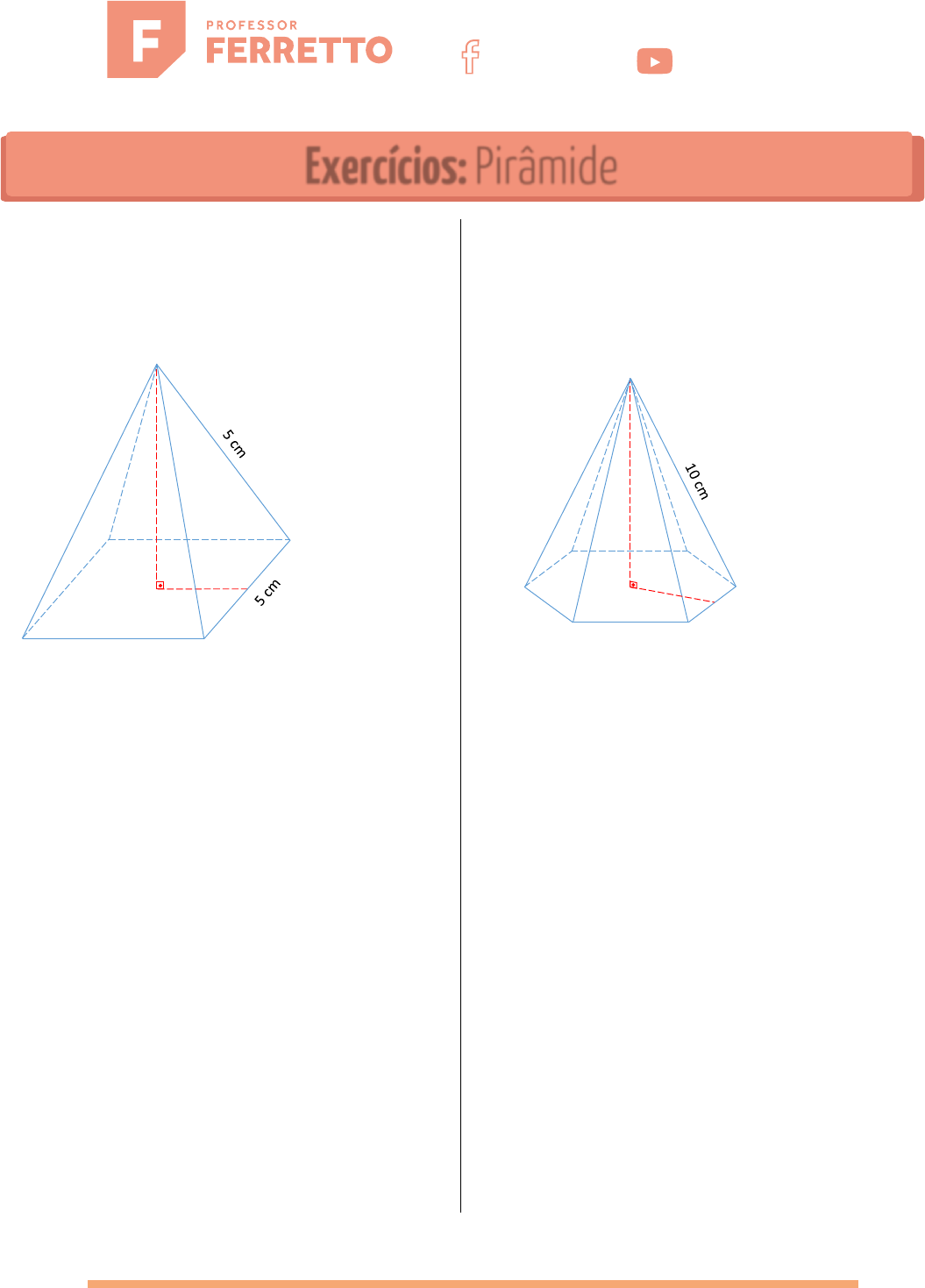 <p>1</p><p>Calcule a área lateral, a área total e o volume das</p><p>pirâmides regulares, cujas medidas estão indicadas</p><p>nas figuras abaixo:</p><p>1.</p><p>2.</p><p>Exercícios: Pirâmide</p><p>www.professorferretto.com.br</p><p>ProfessorFerretto ProfessorFerretto</p><p>5 cm</p><p>h</p><p>4 cm</p><p>h</p><p>http://www.professorferretto.com.br</p><p>2</p><p>De uma pirâmide regular de base quadrada sabe-se</p><p>que a área da base é 32 dm² e que o apótema da</p><p>pirâmide mede 6 dm. Calcule:</p><p>3. A aresta da base (ℓ) =</p><p>4. A apótema da base (m) =</p><p>5. A altura da pirâmide (h) =</p><p>6. A aresta lateral (a) =</p><p>7. A área lateral (𝐴ℓ) =</p><p>8. A área total (𝐴𝑡) =</p><p>9. A base de uma pirâmide de 6 cm de altura é</p><p>um quadrado de 8 cm de perímetro. Calcule o</p><p>volume.</p><p>10. Calcule a área lateral e a área total de uma</p><p>pirâmide triangular regular cuja aresta lateral</p><p>mede 82 cm e cuja aresta da base mede 36</p><p>cm.</p><p>11. Calcule a área lateral e a área total de uma</p><p>pirâmide quadrangular regular, sendo 7 m a</p><p>medida do seu apótema e 8 m o perímetro da</p><p>base.</p><p>3</p><p>12. Calcule a medida da área lateral de uma</p><p>pirâmide quadrangular regular, sabendo que a</p><p>área da base mede 64 m² e que a altura da</p><p>pirâmide é igual a uma das diagonais da base.</p><p>13. Uma pirâmide tem por base um retângulo</p><p>cujas dimensões medem 10 cm e 24 cm,</p><p>respectivamente. As arestas laterais são iguais</p><p>à diagonal da base. Calcule a área total da</p><p>pirâmide.</p><p>14. Calcule a aresta lateral de uma pirâmide</p><p>regular, sabendo que sua base é um hexágono</p><p>de 6 cm de lado, sendo 10 cm a altura da</p><p>pirâmide.</p><p>15. A base de uma pirâmide regular é um</p><p>hexágono inscrito em um círculo de 12 cm de</p><p>diâmetro. Calcule a altura da pirâmide,</p><p>sabendo que a área da base é a décima parte</p><p>da área lateral.</p><p>16. Calcule a área lateral e a área total de uma</p><p>pirâmide regular hexagonal, sendo 3 cm sua</p><p>altura e 10 cm a medida da aresta da base.</p><p>17. A aresta lateral de uma pirâmide</p><p>quadrangular regular mede 15 cm e a aresta</p><p>da base 10 cm. Calcule o volume.</p><p>4</p><p>18. A área da base de uma pirâmide regular</p><p>hexagonal é igual a 216√3 m². Determine o</p><p>volume da pirâmide, sabendo que sua altura</p><p>mede 16 m.</p><p>19. Determine o volume de uma pirâmide</p><p>triangular regular, sendo 2 m a medida da</p><p>aresta da base e 3 m a medida de suas arestas</p><p>laterais.</p><p>20. O volume de uma pirâmide triangular regular</p><p>é 64√3 cm³. Determine a medida da aresta</p><p>lateral, sabendo que a altura é igual ao</p><p>semiperímetro da base.</p><p>GABARITO:</p><p>1. 𝐴ℓ = 25√3 𝑐𝑚2, 𝐴𝑡 = 25(1 + √3) 𝑐𝑚2, 𝑉 =</p><p>125√2</p><p>6</p><p>𝑐𝑚³</p><p>2. 𝐴ℓ = 48√6 𝑐𝑚2, 𝐴𝑡 = 24√3(1 + 2√2) 𝑐𝑚2, 𝑉 = 48√7 𝑐𝑚³</p><p>3. ℓ = 4√2 𝑑𝑚</p><p>4. 𝑚 = 2√2 𝑑𝑚</p><p>5. ℎ = 2√7 𝑑𝑚</p><p>6. 𝑎 = 2√11 𝑑𝑚</p><p>7. 𝐴ℓ = 48√2 𝑑𝑚2</p><p>8. 𝐴𝑡 = 16(3√2 + 2) 𝑑𝑚²</p><p>9. 8 cm³</p><p>10. 𝐴ℓ = 4 320 𝑐𝑚2, 𝐴𝑡 = 108(40 + 3√3) 𝑐𝑚2</p><p>11. 𝐴ℓ = 28 𝑚2, 𝐴𝑡 = 32 𝑚2</p><p>12. 192 𝑚2</p><p>13. 2(5√651 + 24√133 + 120) 𝑐𝑚2</p><p>14. 2√34 𝑐𝑚</p><p>15. 9√33 𝑐𝑚</p><p>16. 𝐴ℓ = 60√21 𝑐𝑚2, 𝐴𝑡 = 30(5√3 + 2√21) 𝑐𝑚2</p><p>17.</p><p>500√7</p><p>3</p><p>𝑐𝑚³</p><p>18. 1152√3 𝑚3</p><p>19.</p><p>√23</p><p>3</p><p>𝑚3</p><p>20.</p><p>4√93</p><p>3</p><p>𝑐𝑚</p>