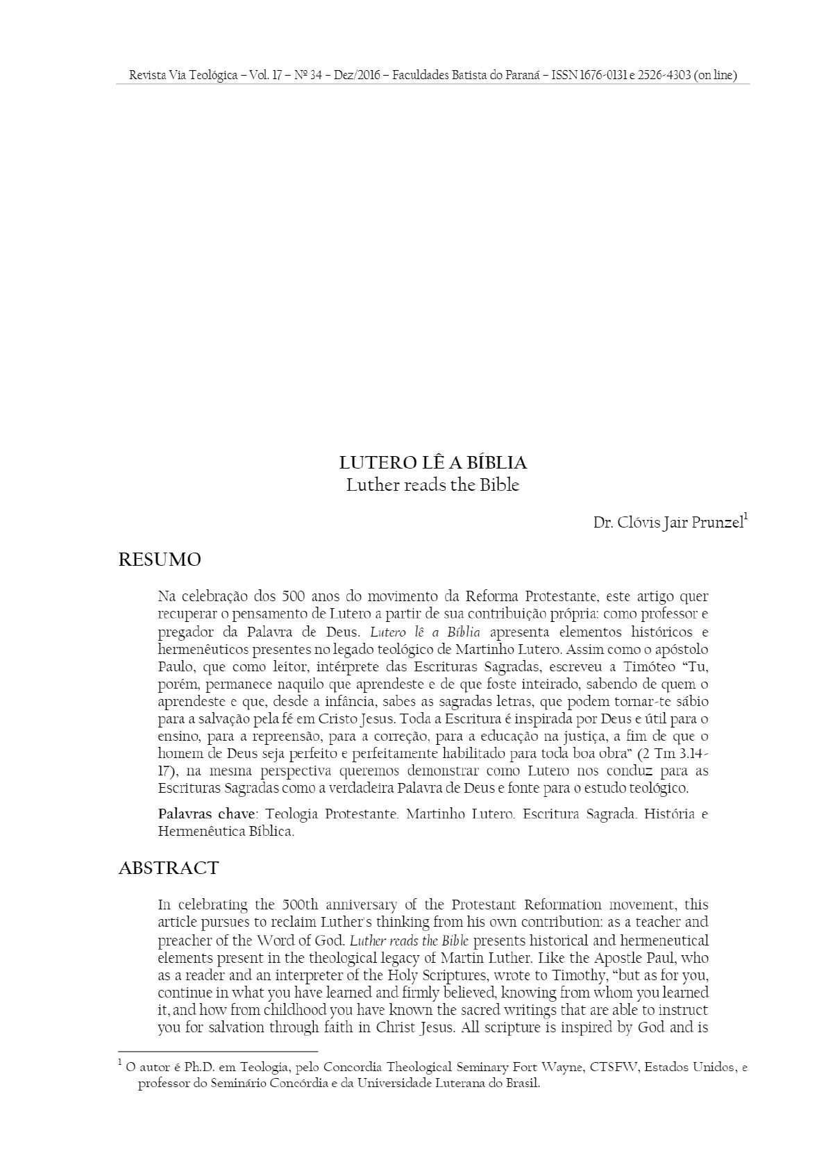 <p>Revista Via Teológica Vol. 17 34 - Dez/2016 - Faculdades Batista do ISSN 1676-0131 e 2526-4303 (on line) LUTERO LÊ A BÍBLIA Luther reads the Bible Dr. Clóvis Jair RESUMO Na celebração dos 500 anos do movimento da Reforma Protestante, este artigo quer recuperar o pensamento de Lutero a partir de sua contribuição própria: como professor e pregador da Palavra de Deus. Lutero le a Bíblia apresenta elementos históricos e hermenêuticos presentes no legado teológico de Martinho Lutero. Assim como o apóstolo Paulo, que como leitor, intérprete das Escrituras Sagradas, escreveu a Timóteo "Tu, porém, permanece naquilo que aprendeste e de que foste inteirado, sabendo de quem o aprendeste e que, desde a infância, sabes as sagradas letras, que podem tornar-te sábio para a salvação pela fé em Cristo Jesus. Toda a Escritura é inspirada por Deus e útil para o ensino, para a repreensão, para a correção, para a educação na justiça, a fim de que o homem de Deus seja perfeito e perfeitamente habilitado para toda boa obra" (2 Tm 17), na mesma perspectiva queremos demonstrar como Lutero nos conduz para as Escrituras Sagradas como a verdadeira Palavra de Deus e fonte para o estudo teológico. Palavras chave: Teologia Martinho Lutero. Escritura Sagrada. História e Hermenêutica Bíblica. ABSTRACT In celebrating the 500th anniversary of the Protestant Reformation movement, this article pursues to reclaim Luther's thinking from his own contribution: as a teacher and preacher of the Word of God. Luther reads the Bible presents historical and hermeneutical elements present in the theological legacy of Martin Luther. Like the Apostle Paul, who as a reader and an interpreter of the Holy Scriptures, wrote to Timothy, "but as for you, continue in what you have learned and firmly believed, knowing from whom you learned it, and how from childhood you have known the sacred writings that are able to instruct you for salvation through faith in Christ Jesus. All scripture is inspired by God and is 1 autor é Ph.D. em Teologia, pelo Concordia Theological Seminary Fort Wayne, CTSFW, Estados Unidos, e professor do Seminário Concórdia e da Universidade Luterana do Brasil.</p><p>Revista Via Teológica Vol. 17 34 Dez/2016 Faculdades Batista do ISSN 1676-0131 e 2526-4303 (on line) useful for teaching, for reproof, for correction, and for training in righteousness, that everyone who belongs to God may be proficient, equipped for every good work," in the same perspective this article reveals how Luther leads us to the Holy Scriptures as the true Word of God and source for theological study. Keywords: Protestant Theology. Martin Luther. Holy Scriptures. Historical and Biblical INTRODUÇÃO Qual é o principal legado, depois de 500 anos, do movimento reformador iniciado por Martinho Lutero naquele 31 de outubro de 1517? Este artigo quer refletir sobre o legado de Martinho Lutero e demonstrar que, antes de prescrever algo em termos teológicos, Lutero nos inspira a olhar para verdadeira e única fonte em termos teológicos: as Escrituras Sagradas. A genialidade de Lutero vista a partir de hoje reflete o seu cuidado pastoral com o texto bíblico. Assim como o apóstolo Paulo, a obra de Martinho Lutero difunde a fragrância de Cristo, pois sua cátedra e sua homilia conduziam seus ouvintes e leitores para a obra própria de Deus revelada ao mundo através da pessoa e obra de Jesus Cristo. A Bíblia não é apenas um alimento para nos suprir diariamente, mas é o Pão que vem dos Céus. Ao se revelar em Lei e Evangelho, em meio ao juízo e à misericórdia, em meio à condenação e ao consolo, o professor e pastor Martinho Lutero nos conduz para as Escrituras Sagradas para seu uso próprio, não oferecendo uma solução psicológica nem social, mas a única solução que pode vir de um Deus que escreve quem Ele e o que Ele quer nas suas Escrituras. 1. LUTERO É CONDUZIDO ÀS ESCRITURAS Lutero é um professor (lector in Biblia), um pregador, um tradutor e um revisor da antes de ser um reformador. Por isso, para caracterizar Lutero como reformador precisamos conectá-lo com seu encontro e confronto com as Escrituras. Para Lutero, tudo depende da Bíblia porque nela Deus é loquens, sendo ela é a viva evangelii, pois traz o reino de Cristo e produz fé (fides ex auditu) e vida Lutero utilizou o púlpito e a cátedra para descobrir um Deus presente mediado por sua Palavra ("maturação evangélica"). Alunos, em sala de aula, e o povo, nos sermões, perceberam Lutero lendo e ensinando a Escritura em busca do sentido literal (Lutero é um acontecimento linguístico), o sentido cristológico e o sentido existencial das Escrituras (soteriológico). Lutero aprendeu de Paulo que o teólogo começa e termina sua tarefa ao pé da cruz! Contrário ao pensamento medieval platônico, que definiu a história humana como nada além de um acidente inconsequente do eterno espírito e significado, Lutero foi ao encontro do sentido literal da Palavra de Deus. Foi a resposta ao sentido das Escrituras Medieval: o literal (histórico-gramatical), o alegórico (espiritual), o tropológico e o anagógico (escatológico). Uma rápida olhada nas Preleções sobre Gênesis nos leva a concluir o que Lutero fez. Lutero no comentário aplica seus princípios hermenêuticos fundamentais para interpretar o texto primeiro, a Palavra de Deus é manifestada na Segunda Pessoa da Trindade, Jesus Cristo; segundo, Jesus Cristo é o centro e o conteúdo principal das Escrituras, tanto do Antigo como do Novo Testamento; terceiro, a própria Escritura é sua própria intérprete, visto quem a narrativa de percebeu seu conteúdo revelado também no Novo Testamento;</p><p>Revista Via Teológica Vol. 17 34 Dez/2016 Faculdades Batista do ISSN 1676-0131 e 2526-4303 (on line) quarto, a revelação precisa ser vista historicamente, contrária assim à possibilidade alegórica de interpretar o texto; e, quinto, a função querigmática do texto, visto qu