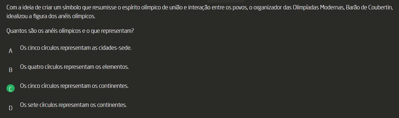 <p>Com a ideia de criar um símbolo que resumisse espírito olímpico de união e interação entre os povos, organizador das Olimpíadas Modernas, Barão de Coubertin, idealizou a figura dos anéis olímpicos. Quantos são anéis olímpicos e que representam? A Os cinco círculos representam as cidades-sede. B Os quatro círculos representam os elementos. Os cinco círculos representam os continentes. D Os sete círculos representam os continentes.</p>