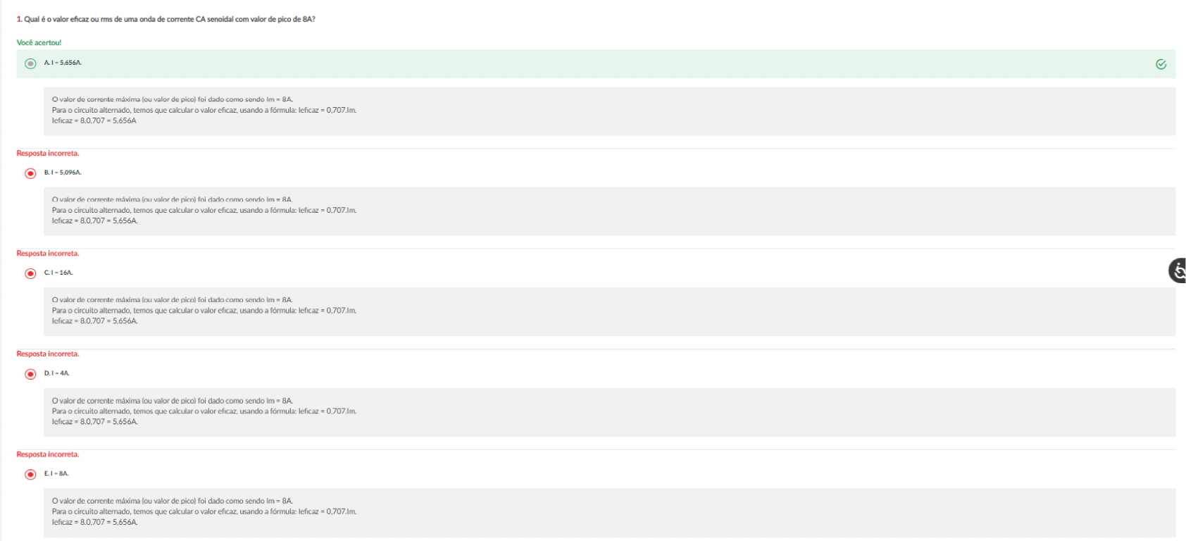 <p>1. Qual é valor eficaz ou rms de uma onda de corrente CA com valor de pico de 8A? Você acertou! A. 5.656A valor de corrente máxima (ou valor de pico) foi dado como sendo Im 8A. Para o circuito alternado, temos que calcular o valor usando a leficaz = leficaz 5.656A Resposta incorreta. B. valor de corrente máxima (ou valor de pico) foi dado como sendo Im 8A Para o circuito alternado, temos que calcular o valor usando a leficaz = leficaz Resposta incorreta. 16A valor de corrente máxima (ou valor de pico) foi dado como sendo Im = 8A Para o circuito temos que calcular o valor usando a leficaz = leficaz Resposta incorreta. D. 4A. valor de corrente máxima (ou valor de pico) foi dado como sendo Im Para o circuito temos que calcular o valor usando a leficaz = leficaz 8.0.707 Resposta incorreta. valor de corrente máxima (ou valor de pico) foi dado como sendo Im 8A Para o circuito alternado, temos que calcular o valor eficaz, usando a leficaz = leficaz 8.0.707 5.656A</p><p>2 Para uma tensão de alimentação residencial de Resposta Para calcular pico pico precisa conhece valor máximo da Vpp Então você calcular Vm A de tensão Como valor que precisa Vm Vm Vm 179.63V Substituindo Vm na de Vpp Para valor de pico pico precisa valor da tensão você precisa calcular Vm A formula de tensão Como valor de que você precisa Vm 127/0.707 Substituindo Vm na de Vpp 360V Resposta Para calcular de pico pico você precisa valor da você precisa calcular Vm A de tensão Como valor que precisa Vm Vm 127/0.707 179.63V na de Vpp 2.Vm 360V 360V Resposta Para valor de precisa valor da tensão você precisa calcular Vm A de tensão Como valor que você precisa Vm 127/0.707 Vm 179,63V Substituindo Vm na Vpp Resposta Para calcular de pico pico conhece valor máximo da Vpp você precisa calcular Vm A formula de tensão valor de que você precisa Vm 127/0.707 Vm Substituindo Vm na de Vpp 2.Vm 360V Vpp 360V</p><p>qual de tensão? 15 10 5 + Wt - 5 -10 1/3m In 4/3m 5/3m 20 Resposta incorreta Resposta Resposta Resposta incorreta</p><p>4. Para uma tensão de alimentação de circuito CA de 220V em uma carga resistiva de qual valor de corrente eficaz e potência média, respectivamente? Resposta Você deve utilizar as fórmulas de potência média e corrente eficaz para circuitos CA leficaz 220/20 11A 2420W ou Como circuito é puramente você pode utilizar a leficaz leficaz - 220/20 11A - 2420W ou Resposta incorreta. B. Você deve utilizar as fórmulas de potência média e corrente eficaz para circuitos CA leficaz 220/20 11A 2420W ou Como o circuito é puramente você pode utilizar a fórmula leficaz leficaz - 220/20 11A 2420W ou Resposta C. 10A: 10W. Você deve utilizar as fórmulas de potência média e corrente eficaz para circuitos CA leficaz 220/20 11A - 2420W ou Como circuito é puramente você pode utilizar a leficaz leficaz - 220/20 11A P - 2420W ou b Resposta D. Você deve utilizar as formulas de potência média e corrente eficaz para circuitos CA leficaz 220/20 - 2420W ou Como o circuito é puramente você pode utilizar a leficaz leficaz 220/20 11Ae .R 2420W ou Você acertou! Você deve utilizar as fórmulas de potência média e corrente eficaz para circuitos CA leficaz 220/20 11A P 2420W ou Como o circuito é puramente você pode utilizar a leficaz leficaz 220/20 - 11Ae P .R 2420W ou</p><p>5. Um resistor de 250 tem uma potência média de 400W. Que valor máximo de corrente esse circuito suportaria, sendo um circuito CA senoidal? Você acertou! A 5.66A Sendo um circuito CA temos que P ou - leficaz raiz quadrada de P/R raiz quadrada de 400/25 4A leficaz Im/V2 Im 4/0.707 5.66A Resposta 4A. Sendo um circuito CA resistivo, temos que P ou - P/R. leficaz raiz quadrada de P/R raiz quadrada de 400/25 4A leficaz Im leficaz/0,707 4/0.707 Resposta 6.28A Sendo um circuito CA resistivo, temos que P ou - leficaz raiz quadrada de P/R raiz quadrada de 400/25 4A leficaz Im 4/0.707 5,66A Resposta incorreta. Sendo um circuito CA temos que P ou - leficaz raiz quadrada de P/R raiz quadrada de 400/25 4A leficaz Im 4/0.707 5.66A Resposta Sendo um circuito CA temos que P ou - P/R. leficaz raiz quadrada de P/R raiz quadrada de 400/25 4A leficaz Im leficaz/0.707 4/0.707 5.66A</p><p>1 Acertos: /5 Nota: 100% Envio: 04/02/2023 1 Considerando que tensão de barreira dos diodos de junção PN figura possuem uma de será amplitude da tensão da fonte para que exista corrente elétrica circulando sobre resistor R2 VD R VD Resposta incorreta Para que exista corrente elétrica circulando sobre resistor R todos os diodos de junção PN devem ser polarizados diretamente isto deve ser aplicada sobre cada um dos diodos uma corrente de no mínimo 0.7V de barreira do Considerando circuito possui uma caracteristica tensão que fonto tensão ter orden de Resposta incorreta Para que exista corrente elétrica circulando sobre resistor todos os diodos junção PN devem diretamente isto aplicada sobre cada um dos diodos uma corrente de no 0.7V (tensão de barreira do Considerando circuito possui uma caracteristica serial tensão minima que fonto tensão ter da de Para que exista corrente elétrica circulando sobre resistor R todos os diodos de junção PN devem polarizados diretamente, isto deve aplicada sobre cada um dos diodos uma corrente de no mínimo 0.7V de barreira do Considerando circuito possui uma caracteristica serial tensão minima que do tensão da orden de 2.1V. Resposta Para que exista corrente resistor R todos os diodos junção PN devem polarizados isto deve aplicada cada um dos diodos uma corrente de no mínimo 0.7V (tensão de barreira do Considerando que circuito possui uma tensão minima que do tensão da de Resposta incorreta Para que exista elétrica sobre resistor R todos os diodos de junção PN devem see polarizados isto deve ser aplicada sobre cada um dos diodos uma corrente de no 0.7V (tensão de barreira do Considerando que circuito possui uma caracteristica tensão minima tensão devo da de</p><p>2. Considerando o fato