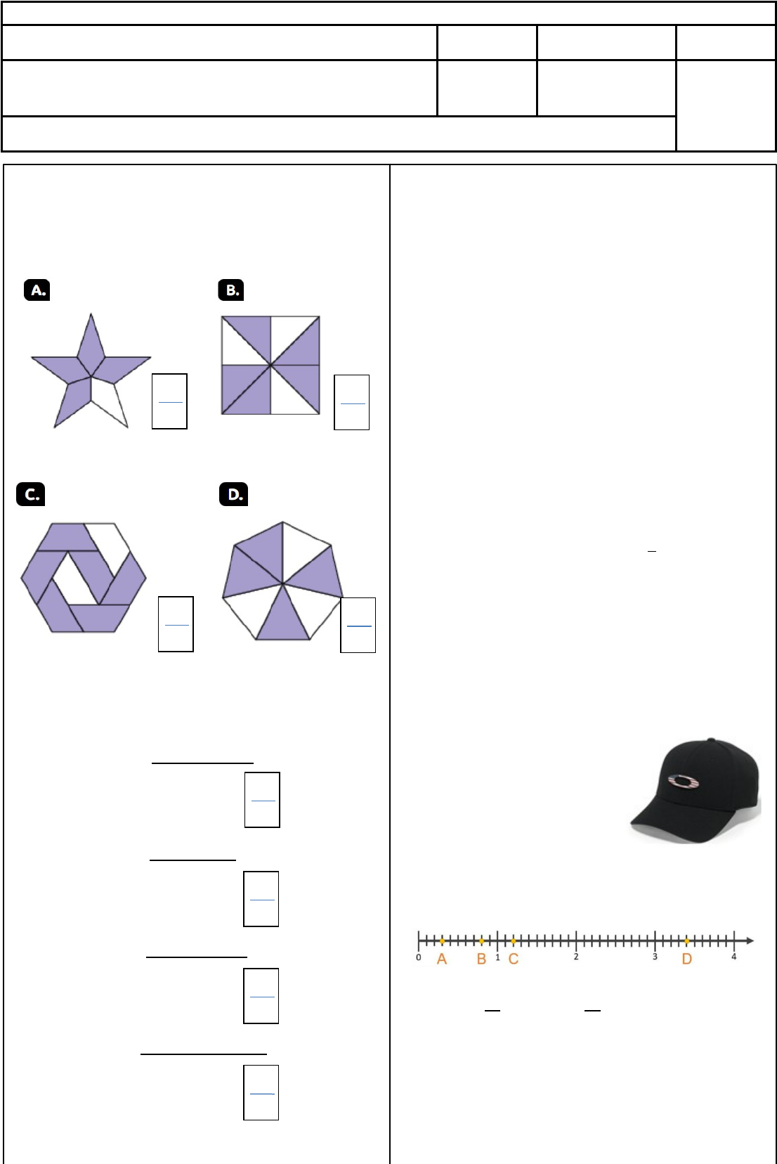 <p>E. M. "PROFESSORA LÚCIA FLORA DOS SANTOS"</p><p>Aluno (a):</p><p>Nº</p><p>Ano: 6° ANO</p><p>NOTA</p><p>Prof. Responsável: Renato</p><p>3° bimestre</p><p>Data: / 08 / 2024</p><p>PROVA MENSAL DE MATEMÁTICA – VALOR: 10,0</p><p>1 - CADA FIGURA FOI DIVIDIDA EM PARTES IGUAIS. QUE FRAÇÃO DE CADA FIGURA CORRESPONDE ÀS PARTES PINTADAS DE CINZA?</p><p>2 - REPRESENTE CADA FRAÇÃO DADA COM SIMBOLOGIA MATEMÁTICA:</p><p>A) FELIPE JOGOU SEIS OITAVOS DO JOGO DE FUTEBOL.</p><p>B) ELISETE USOU MEIO QUILO DE FARINHA NA RECEITA.</p><p>C) DANIEL COMEU DOIS QUINTOS DE UMA BARRA DE CHOCOLATE.</p><p>D) BIANCA BEBEU QUATRO DÉCIMOS DA GARRAFA DE REFRIGERANTE.</p><p>3 - MICAEL JUNTOU EM SEU COFRE A QUANTIA DE R$ 270,00. SABENDO QUE NO COFRE TEM 3 NOTAS DE R$50,00, 4 NOTAS DE R$20,00 E O RESTANTE SÃO TODAS NOTAS DE R$ 5,00, DETERMINE QUANTAS NOTAS DE R$5,00 MICAEL GUARDOU NO COFRE.</p><p>4 - MICAEL RESOLVEU GASTAR DO DINHEIRO QUE ESTAVA EM SEU COFRE (R$ 270,00) PARA COMPRAR UM BONÉ DA OAKLEY. QUANTO CUSTOU O BONÉ COMPRADO POR MICAEL?</p><p>5 - ASSINALE A ALTERNATIVA QUE IDENTIFICA A LOCALIZAÇÃO DE CADA PONTO NA RETA NUMÉRICA:</p><p>( ) A = E D =</p><p>( ) A = E C =</p><p>( ) B = E C =</p><p>( ) B = E D =</p><p>6 - EFETUE A EXPRESSÃO ABAIXO E ASSINALE A ALTERNATIVA CORRETA:</p><p>( ) 7 ( ) 9 ( ) 11 ( ) 13</p><p>7 - QUANTOS MINUTOS HÁ EM:</p><p>A) HORA?</p><p>B) DE HORA?</p><p>C) DE HORA?</p><p>D) DE HORA?</p><p>8 - QUAL DEVE SER O VALOR NUMÉRICO DE CADA LETRA PARA QUE AS FRAÇÕES SEJAM EQUIVALENTES?</p><p>A) B)</p><p>9 - PREENCHA CADA LACUNA COM V PARA VERDADEIRO OU F PARA FALSO.</p><p>( ) A FRAÇÃO É UMA FRAÇÃO PRÓPRIA.</p><p>( ) A FRAÇÃO É UMA FRAÇÃO IMPRÓPRIA.</p><p>( ) A FRAÇÃO É UMA FRAÇÃO APARENTE.</p><p>( ) A FRAÇÃO É UMA FRAÇÃO IMPRÓPRIA.</p><p>10 - OBSERVE CADA NOTA, FAÇA OS CÁLCULOS E REPRESENTE QUANTO VALE CADA UMA TRANSFORMANDO EM NÚMEROS DECIMAIS:</p><p>A)</p><p>R$</p><p>B)</p><p>R$</p><p>11 - NUM CAMPEONATO DE BOLICHE, OS PONTOS QUE ANA, LIA, RUI E ZECA MARCARAM APARECEM NA TABELA A SEGUIR:</p><p>ASSINALE A ALTERNATIVA DE QUAL GRÁFICO MOSTRA A CORRETA DISTRIBUIÇÃO DESSES PONTOS.</p><p>( ) ( )</p><p>( ) ( )</p><p>12 - REPRESENTE O NÚMEROS DECIMAL INDICADO PELAS NA RETA NUMÉRICA:</p><p>image4.png</p><p>image5.png</p><p>image6.wmf</p><p>10</p><p>3</p><p>oleObject2.bin</p><p>image7.wmf</p><p>10</p><p>35</p><p>oleObject3.bin</p><p>image8.wmf</p><p>10</p><p>5</p><p>oleObject4.bin</p><p>image9.wmf</p><p>10</p><p>14</p><p>oleObject5.bin</p><p>image10.wmf</p><p>10</p><p>9</p><p>oleObject6.bin</p><p>image11.wmf</p><p>10</p><p>12</p><p>oleObject7.bin</p><p>image12.wmf</p><p>10</p><p>8</p><p>oleObject8.bin</p><p>image13.wmf</p><p>10</p><p>34</p><p>oleObject9.bin</p><p>image14.wmf</p><p>4</p><p>1</p><p>4</p><p>5</p><p>2</p><p>´</p><p>´</p><p>-</p><p>oleObject10.bin</p><p>image15.wmf</p><p>2</p><p>1</p><p>oleObject11.bin</p><p>image16.wmf</p><p>3</p><p>1</p><p>oleObject12.bin</p><p>image17.wmf</p><p>4</p><p>1</p><p>oleObject13.bin</p><p>image18.wmf</p><p>10</p><p>1</p><p>oleObject14.bin</p><p>image19.wmf</p><p>30</p><p>10</p><p>5</p><p>x</p><p>=</p><p>oleObject15.bin</p><p>image20.wmf</p><p>5</p><p>10</p><p>8</p><p>y</p><p>=</p><p>oleObject16.bin</p><p>image21.wmf</p><p>=</p><p>x</p><p>oleObject17.bin</p><p>image22.wmf</p><p>=</p><p>y</p><p>oleObject18.bin</p><p>image23.wmf</p><p>3</p><p>2</p><p>oleObject19.bin</p><p>image24.wmf</p><p>2</p><p>10</p><p>oleObject20.bin</p><p>image25.wmf</p><p>3</p><p>5</p><p>oleObject21.bin</p><p>image26.wmf</p><p>4</p><p>5</p><p>oleObject22.bin</p><p>image27.jpeg</p><p>image28.jpeg</p><p>image29.png</p><p>image30.png</p><p>image31.png</p><p>image32.png</p><p>image1.png</p><p>image33.png</p><p>image34.png</p><p>image2.png</p><p>image3.wmf</p><p>5</p><p>3</p><p>oleObject1.bin</p>