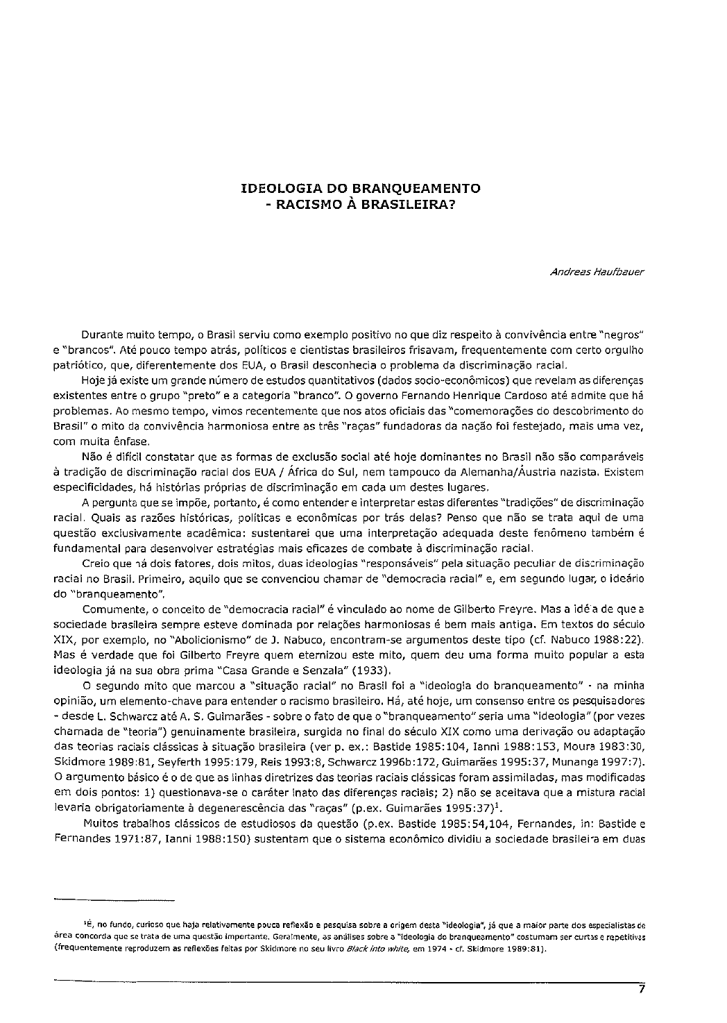 <p>IDEOLOGIA DO BRANQUEAMENTO RACISMO À BRASILEIRA? Andreas Haufbauer Durante muito tempo, o Brasil serviu como exemplo positivo no que diz respeito à convivência entre "negros" e "brancos". Até pouco tempo atrás, políticos e cientistas brasileiros frisavam, frequentemente com certo orgulho patriótico, que, diferentemente dos EUA, o Brasil desconhecia o problema da discriminação racial. Hoje já existe um grande número de estudos quantitativos (dados socio-econômicos) que revelam as diferenças existentes entre o grupo "preto" e a categoria "branco". governo Fernando Henrique Cardoso até admite que há problemas. Ao mesmo tempo, vimos recentemente que nos atos oficiais das "comemorações do descobrimento do Brasil" o mito da convivência harmoniosa entre as três "raças" fundadoras da nação foi festejado, mais uma vez, com muita ênfase Não é difícil constatar que as formas de exclusão social até hoje dominantes no Brasil não são comparáveis à tradição de discriminação racial dos EUA / África do Sul, nem tampouco da nazista. Existem especificidades, há histórias próprias de discriminação em cada um destes lugares. A pergunta que se impõe, portanto, é como entender e interpretar estas diferentes "tradições" de discriminação racial. Quais as razões históricas, políticas e econômicas por trás delas? Penso que não se trata aqui de uma questão exclusivamente acadêmica: sustentarei que uma interpretação adequada deste fenômeno também é fundamental para desenvolver estratégias mais eficazes de combate à discriminação racial. Creio que há dois fatores, dois mitos, duas ideologias "responsáveis" pela situação peculiar de discriminação racial no Primeiro, aquilo que se convenciou chamar de "democracia racial" e, em segundo lugar, o ideário do Comumente, conceito de "democracia racial" é vinculado ao nome de Gilberto Freyre. Mas a idéia de que a sociedade brasileira sempre esteve dominada por relações harmoniosas é bem mais antiga. Em textos do século XIX, por exemplo, no "Abolicionismo" de J. Nabuco, encontram-se argumentos deste tipo (cf. Nabuco 1988:22). Mas é verdade que foi Gilberto Freyre quem eternizou este mito, quem deu uma forma muito popular a esta ideologia já na sua obra prima "Casa Grande e Senzala" segundo mito que marcou a "situação racial" no Brasil foi a "ideologia do branqueamento" na minha opinião, um para entender o racismo brasileiro. Há, até hoje, um consenso entre os pesquisadores desde L. Schwarcz até A. S. sobre o fato de que o "branqueamento" seria uma "ideologia" (por vezes chamada de "teoria") genuinamente brasileira, surgida no final do século XIX como uma derivação ou adaptação das teorias raciais clássicas à situação brasileira (ver p. ex.: Bastide 1985:104, Ianni 1988:153 Moura 1983:30, Skidmore 1989:81, Seyferth Reis 1993:8, Schwarcz 1996b:172 1995:37, Munanga 1997:7). argumento básico é o de que as linhas diretrizes das teorias raciais clássicas foram assimiladas, mas modificadas em dois pontos: 1) questionava-se o caráter inato das diferenças raciais; 2) não se aceitava que a mistura racial levaria obrigatoriamente à degenerescência das "raças" (p.ex. Guimarães Muitos trabalhos clássicos de estudiosos da questão (p.ex. Bastide 1985:54,104, Fernandes, in: Bastide e Fernandes 1971:87, Ianni 1988:150) sustentam que o sistema econômico dividiu a sociedade brasileira em duas no fundo, curioso que haja relativamente pouca reflexão e pesquisa sobre a origem desta "ideologia", já que a maior parte dos especialistas de área concorda que se trata de uma questão importante. Geralmente, as análises sobre a "ideologia do branqueamento" costumam ser curtas e repetitivas (frequentemente reproduzem as reflexões feitas por Skidmore no seu livro Black into white, em 1974 cf. Skidmore 1989:81). 7</p><p>Andreas Haufbauer partes os senhores e os escravos, "brancos" e "negros" e que, desta forma, apenas com o desmoronamento do sistema escravista as fronteiras entre estes dois pólos começavam a "amolecer". Sustenta-se (p.ex. Schwarcz Guimarães 1995:37) que a idéia do "branqueamento" teria surgido como uma espécie de "esperança nacional", já que o fim da escravidão fomentava entre os membros da elite brasileira um sentimento de incerteza diante do futuro. Como mentor da ideologia do "branqueamento" menciona-se frequentemente João Baptista Lacerda, que participou, como representante oficial do Brasil, do Congresso Universal das Raças (1911) em Londres (p.ex.: Seyferth 1984). Neste congresso, Lacerda frisou as características positivas da população mestiça do país e sustentou que toda a sociedade brasileira passava por um processo de Para ele, a extinção da "raça negra" era apenas uma questão de tempo, mais especificamente, de 100 anos. Além disso, enfatizou ainda as boas relações que, segundo ele, existiam normalmente entre senhores e escravos (sobretudo entre senhores e mulatos) e fez um apelo para os representantes das nações européias: o Brasil estaria aberto para receber imigrantes Na minha tese de doutoramento (Hofbauer 1999), defendi que, contrariamente às interpretações correntes que localizam no fim da escravidão o início da ideologia do "branqueamento" no Brasil escravidão e "branqueamento" não se excluem, mas tendem a se complementar. Argumentei ainda que ideário do "branqueamento" não é um fenômeno exclusivamente brasileiro. Para mostrar isso, apoiei-me numa "reconstrução" da história da idéia do "negro". Esta abordagem exige que se trate categorias como "raça", "cultura", etc., não como constantes antropológicas, mas como critérios-chave que fundamentam os processos de inclusão e exclusão: os conceitos em questão, portanto, podem e devem ser analisados como parte importante da própria história da discriminação. Uma tal análise contextual dos conceitos pode mostrar que ideário do "branqueamento" remonta a épocas bem ma