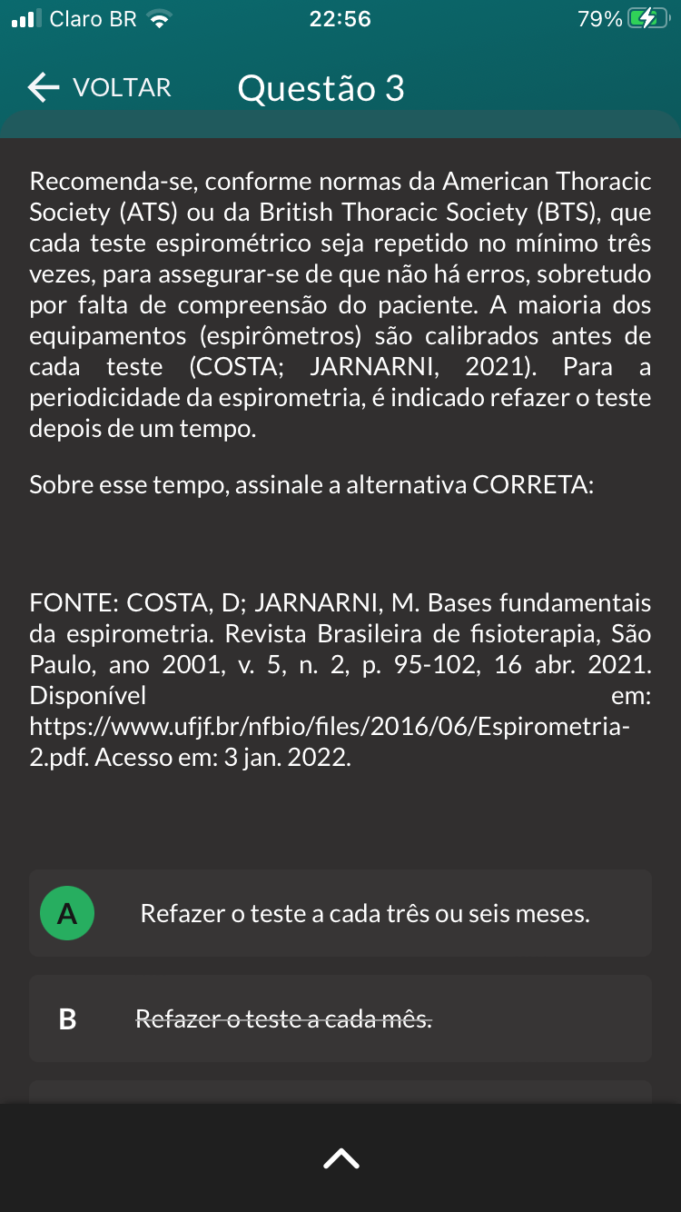 <p>Claro BR 22:56 79% VOLTAR Questão 3 Recomenda-se, conforme normas da American Society (ATS) ou da British Thoracic Society (BTS), que cada teste espirométrico seja repetido no mínimo três vezes, para assegurar-se de que não há erros, sobretudo por falta de compreensão do paciente. A maioria dos equipamentos (espirômetros) são calibrados antes de cada teste JARNARNI, 2021). Para a periodicidade da espirometria, é indicado refazer O teste depois de um tempo. Sobre esse tempo, assinale a alternativa CORRETA: FONTE: COSTA, D; JARNARNI, M. Bases fundamentais da espirometria. Revista Brasileira de fisioterapia, São Paulo, ano 2001, V. 5, n. 2, p. 95-102, 16 abr. 2021. Disponível em: 2. pdf. Acesso em: 3 jan. 2022. A Refazer O teste a cada três ou seis meses. B Refazer teste a cada mês.</p>