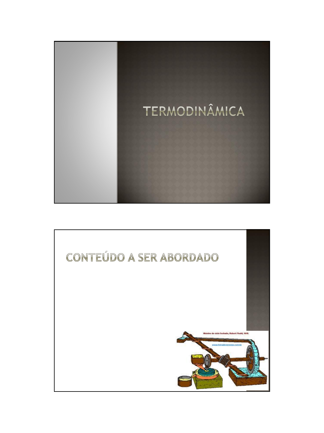 <p>08/06/2022</p><p>1</p><p>Prof.ª Ms. Luciana Brunhara Biazati</p><p>E-mail: luciana.biazati@uvv.br</p><p> Introdução;</p><p> Estudo de conceitos;</p><p> Leis da termodinâmica;</p><p>✓ 1ª lei da termodinâmica.</p><p>1</p><p>2</p><p>08/06/2022</p><p>2</p><p>O que é termodinâmica?</p><p>✓ É a ciência da que relaciona calor (energia) e</p><p>dinâmica (movimento).</p><p>O que é calor?</p><p>✓ É o fluxo de energia movido por uma</p><p>diferença de temperatura.</p><p>O que é energia?</p><p>✓ É a capacidade de realizar trabalho.</p><p>A figura apresenta um sistema realizando</p><p>trabalho</p><p>O que é trabalho?</p><p>✓ É o fluxo de energia motivado por qualquer</p><p>outra força motriz.</p><p>INTRODUÇÃO</p><p>3</p><p>4</p><p>08/06/2022</p><p>3</p><p> Fronteiras: limitam ou não a passagem de</p><p>calor ou a mobilidade.</p><p>✓ Passagem de calor:</p><p>• Diatérmicas: permitem a passagem de calor.</p><p>• Ex: termômetro.</p><p>• Adiabáticas: não permitem a passagem de</p><p>calor. Ex: garrafa de café.</p><p>Sistema diatérmico e adiabático,</p><p>respectivamente.</p><p>ESTUDOS DE CONCEITOS</p><p>5</p><p>6</p><p>08/06/2022</p><p>4</p><p>Balão completamente</p><p>cheio sendo aquecido</p><p>Êmbolo se movendo</p><p>após aquecimento do</p><p>gás</p><p>✓ Mobilidade:</p><p>• Fronteiras fixas ou rígidas.</p><p>• Fronteiras móveis.</p><p>ESTUDOS DE CONCEITOS</p><p> Sistema: objeto em estudo que é separado</p><p>do meio externo + fronteiras reais ou</p><p>fictícias.</p><p>✓ Sistemas isolados: completamente isolados</p><p>do ambiente. Ex: garrafa de café</p><p>✓ Sistemas fechados: trocam energia com</p><p>ambiente, mas não trocam matéria. Ex:</p><p>balão fechado em aquecimento.</p><p>ESTUDOS DE CONCEITOS</p><p>7</p><p>8</p><p>08/06/2022</p><p>5</p><p>OBS:</p><p>✓ Que tipo de sistema está sendo representado</p><p>abaixo?</p><p>✓ Qual é o tipo de fronteira encontrada na</p><p>figura?</p><p>ESTUDOS DE CONCEITOS</p><p> Lei zero da termodinâmica:</p><p>✓ Se dois objetos A e B, fora de contato</p><p>térmico entre si, estão cada um em</p><p>equilíbrio térmico com um objeto C, então os</p><p>objetos A e B encontram-se mutuamente em</p><p>equilíbrio térmico.</p><p>ESTUDOS DE CONCEITOS</p><p>9</p><p>10</p><p>08/06/2022</p><p>6</p><p> Estado de equilíbrio térmico: o sistema</p><p>adquire em toda a sua região a mesma</p><p>temperatura.</p><p>ESTUDOS DE CONCEITOS</p><p> Processo endotérmico: é aquele que</p><p>absorve calor do ambiente.</p><p> Processo exotérmico: é aquele que libera</p><p>calor para o ambiente.</p><p>Processos</p><p>endotérmico e</p><p>exotérmico,</p><p>respectivamente.</p><p>ESTUDOS DE CONCEITOS</p><p>11</p><p>12</p><p>08/06/2022</p><p>7</p><p> Entropia: é a grandeza termodinâmica que</p><p>representa o grau de desordem de um</p><p>sistema.</p><p>Qual é a ordem crescente de entropia</p><p>dos sistemas acima?</p><p>ESTUDOS DE CONCEITOS</p><p> 1ª lei da termodinâmica: a energia do</p><p>universo é constante.</p><p> 2ª lei da termodinâmica: a entropia de um</p><p>sistema sempre tende a aumentar.</p><p> 3º lei da termodinâmica: a entropia de um</p><p>sistema será zero quando ele estiver no zero</p><p>absoluto (-273°C ou 0 K).</p><p>13</p><p>14</p><p>08/06/2022</p><p>8</p><p> Lei de conservação de energia: a energia</p><p>interna (ΔU) de um sistema isolado é</p><p>constante.</p><p>ΔU = q + w</p><p>ΔU = variação da energia interna</p><p>q = calor adicionado ao sistema</p><p>w = trabalho realizado</p><p> Ex: absorção de 50 joules de calor e</p><p>realização de 30 J de trabalho por um gás</p><p>presente em um recipiente fechado e com</p><p>êmbolo.</p><p>q = + 50 J ΔU = 50 - 30</p><p>w = - 30 J ΔU = + 20 J</p><p>1ª LEI DA TERMODINÂMICA</p><p>15</p><p>16</p><p>08/06/2022</p><p>9</p><p>No exemplo anterior, o sistema sofreu um</p><p>aumento da quantidade de energia.</p><p> Essa energia foi gerada?</p><p>✓ Não, pois o ambiente perdeu 20 J.</p><p>“Na natureza nada se cria, nada se perde,</p><p>tudo se transforma”</p><p>Lavoisier</p><p>1ª LEI DA TERMODINÂMICA</p><p>Resumo do processo:</p><p>✓ q positivo (q>0): calor é adicionado ao</p><p>sistema.</p><p>✓ q negativo (q<0): calor é liberado pelo</p><p>sistema.</p><p>✓ w negativo (w<0): o sistema realiza trabalho</p><p>(energia é removida).</p><p>✓ w positivo (w>0): trabalho é realizado sobre</p><p>o sistema (energia é adicionada).</p><p>1ª LEI DA TERMODINÂMICA</p><p>17</p><p>18</p><p>08/06/2022</p><p>10</p><p>O calor e o trabalho do sistema são positivos,</p><p>negativos ou zero na situação abaixo?</p><p>1ª LEI DA TERMODINÂMICA</p><p> A Termoquímica é uma parte da Química que faz</p><p>o estudo das quantidades de calor liberadas ou</p><p>absorvidas durante as reações químicas.</p><p> A maioria das reações químicas envolve perda ou</p><p>ganho de calor (energia).</p><p> As transformações físicas e as reações químicas</p><p>quase sempre estão envolvidas em perda ou</p><p>ganho de calor. O calor é uma das formas de</p><p>energia mais comum que se conhece.</p><p>19</p><p>20</p><p>08/06/2022</p><p>11</p><p>Exemplos de processos reacionais com liberação e absorção de</p><p>energia</p><p>TERMOQUÍMICA</p><p> As reações podem ser endotérmicas ou</p><p>exotérmicas:</p><p>Esquema representando a liberação de energia (reação</p><p>exotérmica) e absorção de energia (reação endotérmica),</p><p>respectivamente</p><p>21</p><p>22</p><p>08/06/2022</p><p>12</p><p> Entalpia (H):</p><p>✓ É o total de energia liberada ou absorvida em</p><p>uma transformação de um dado sistema, a</p><p>pressão constante.</p><p>✓ Cálculo da variação de entalpia (ΔH): lei de</p><p>Hess.</p><p>TERMOQUÍMICA</p><p>23</p>